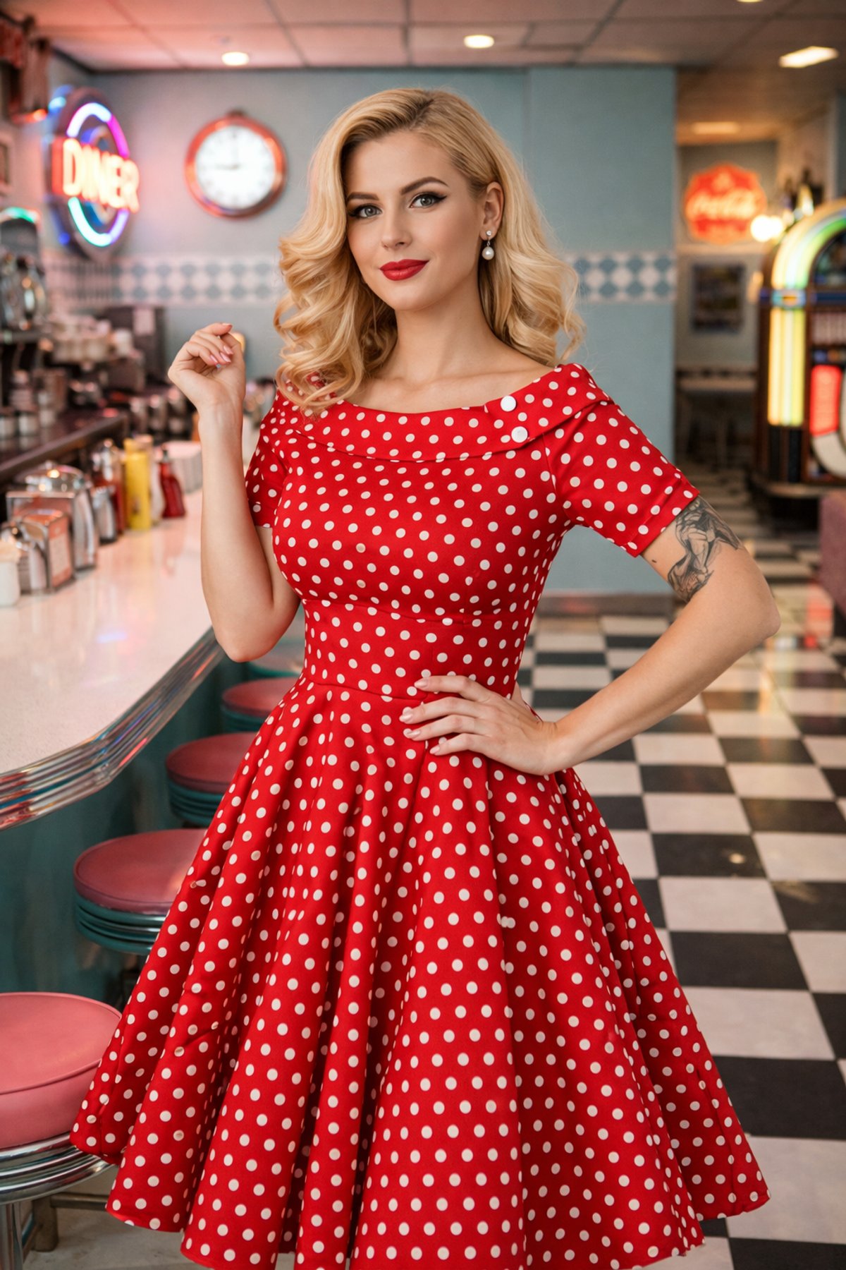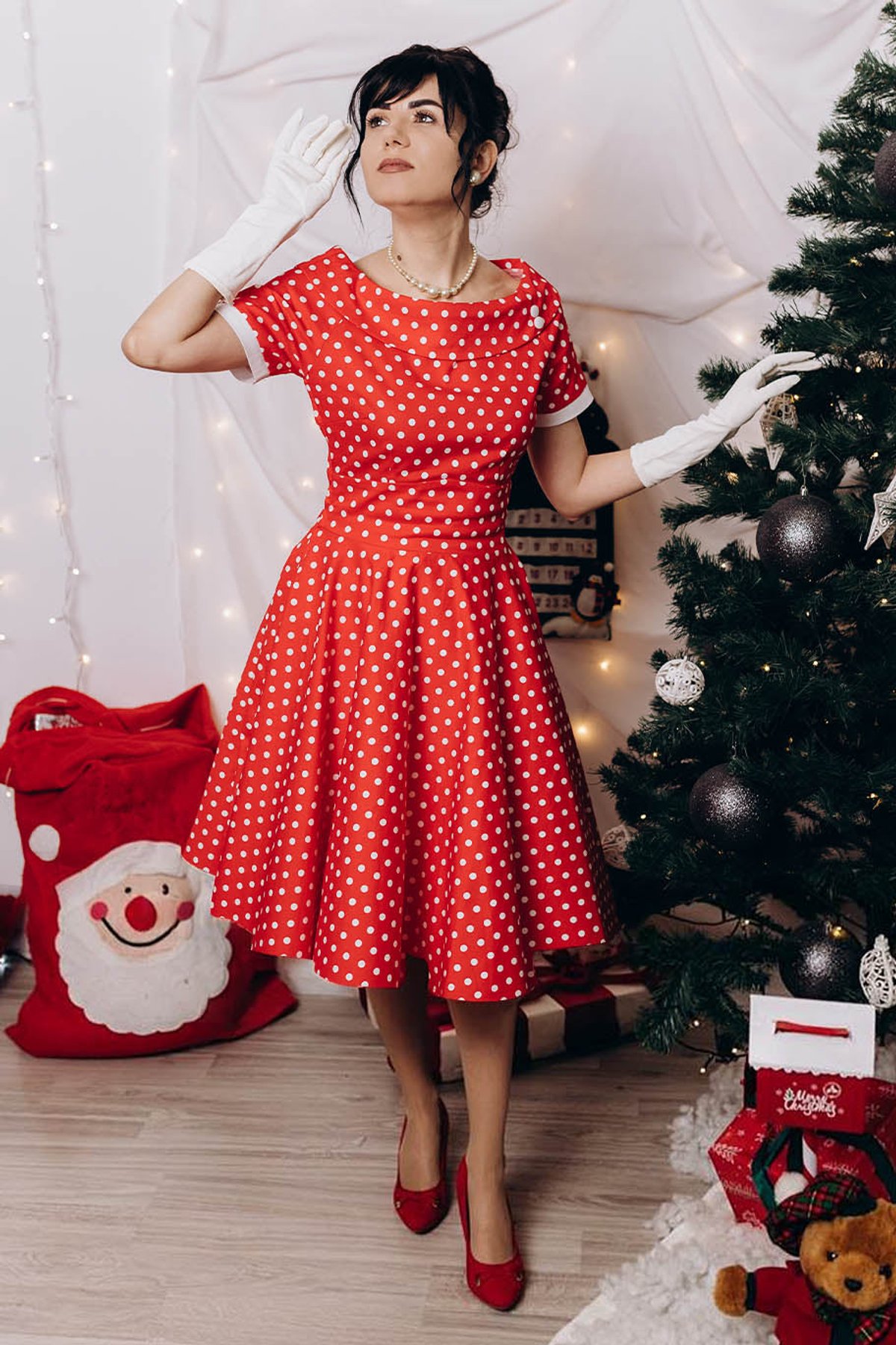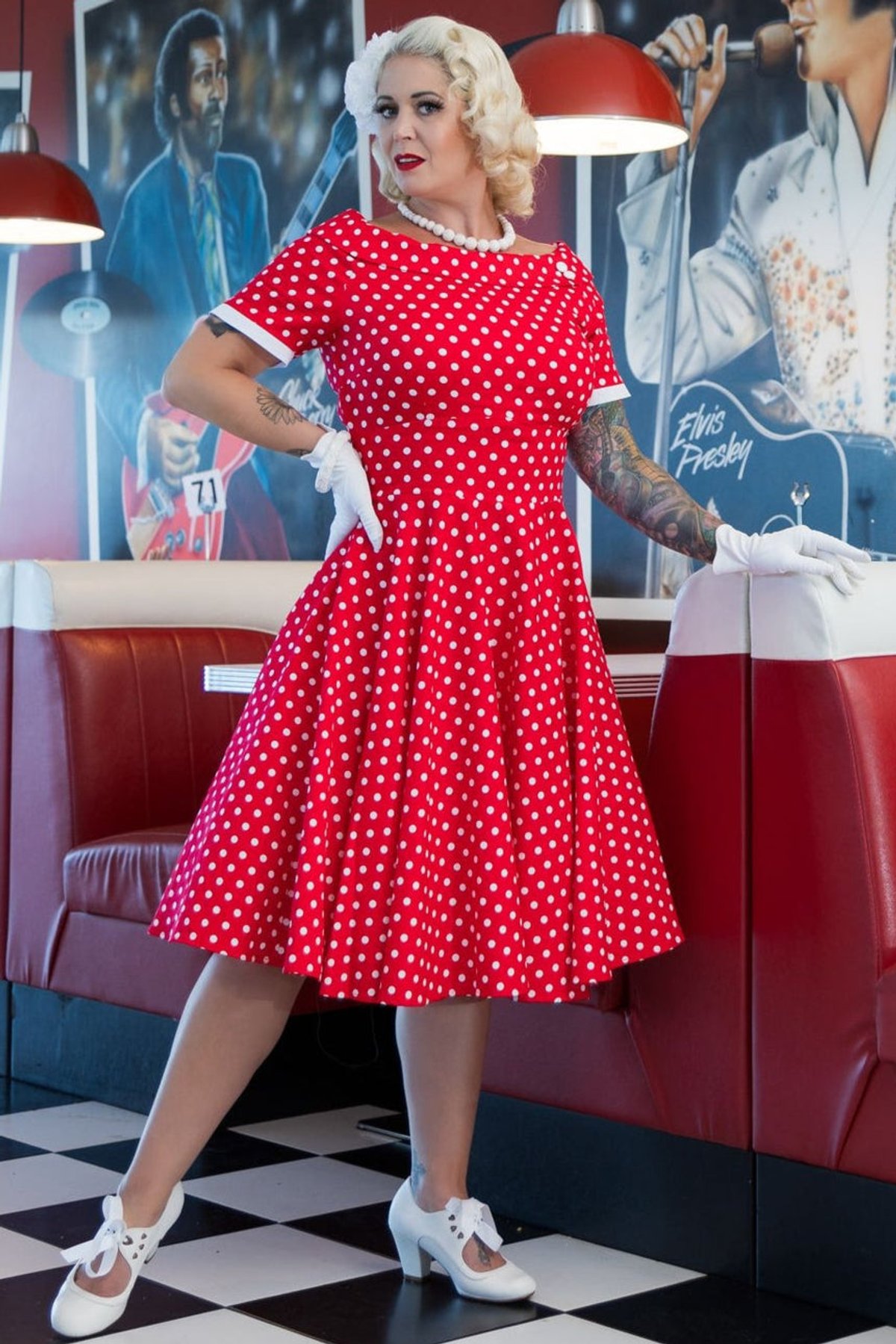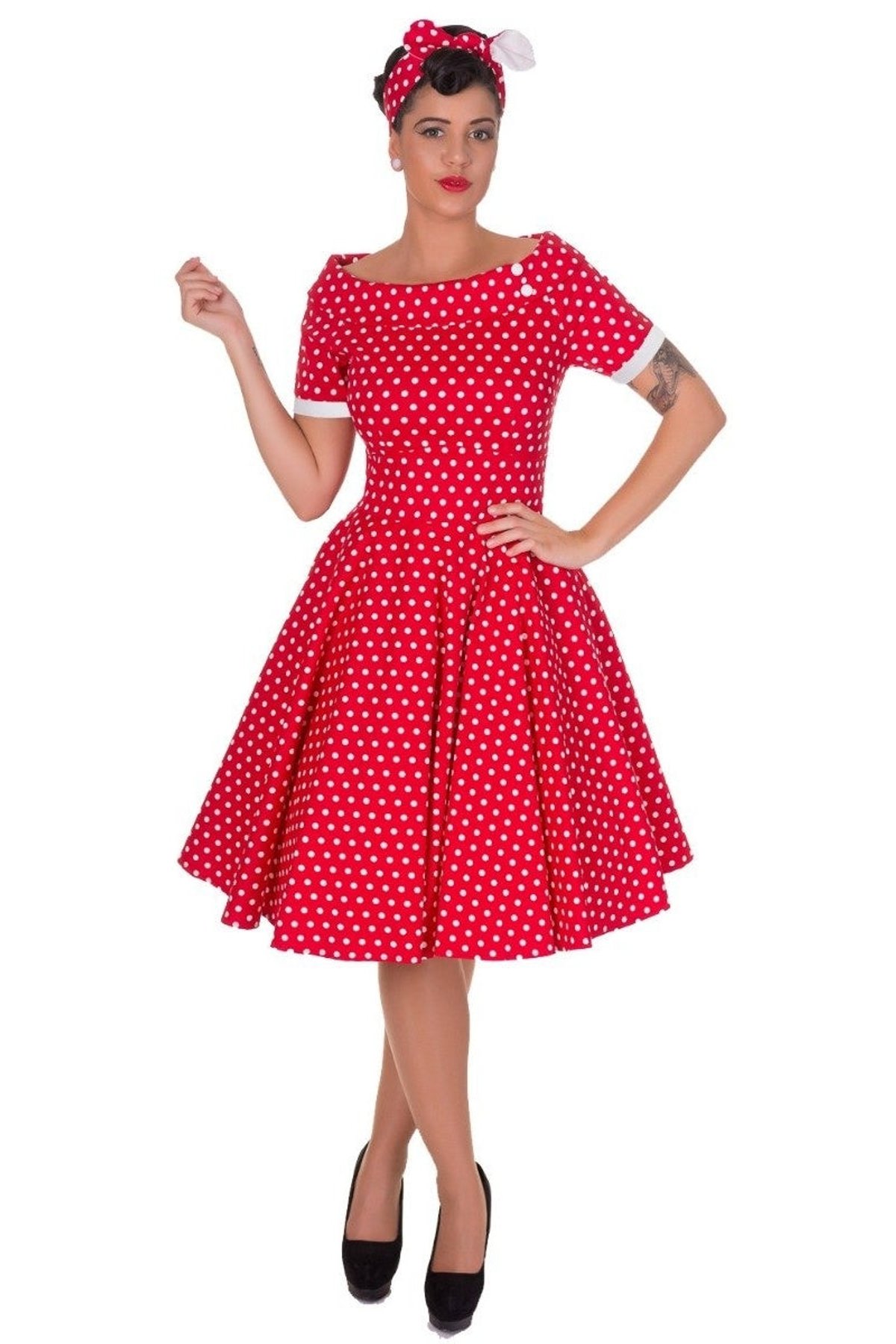 Step into the spotlight with the Darlene dress—a true showstopper that’s as lively as it is ladylike. Its bold red and white polka dots are a playful nod to retro glamour, while the off-the-shoulder neckline and flared silhouette invite you to twirl with wild abandon. This dress is a purrfect blend of vintage charm and modern comfort, designed to make you feel claws-down gorgeous with every step.