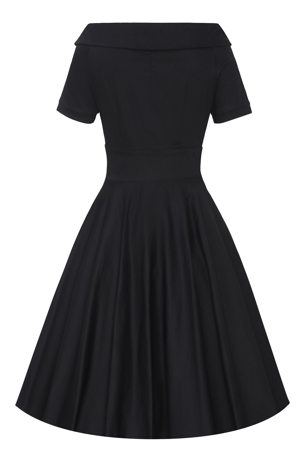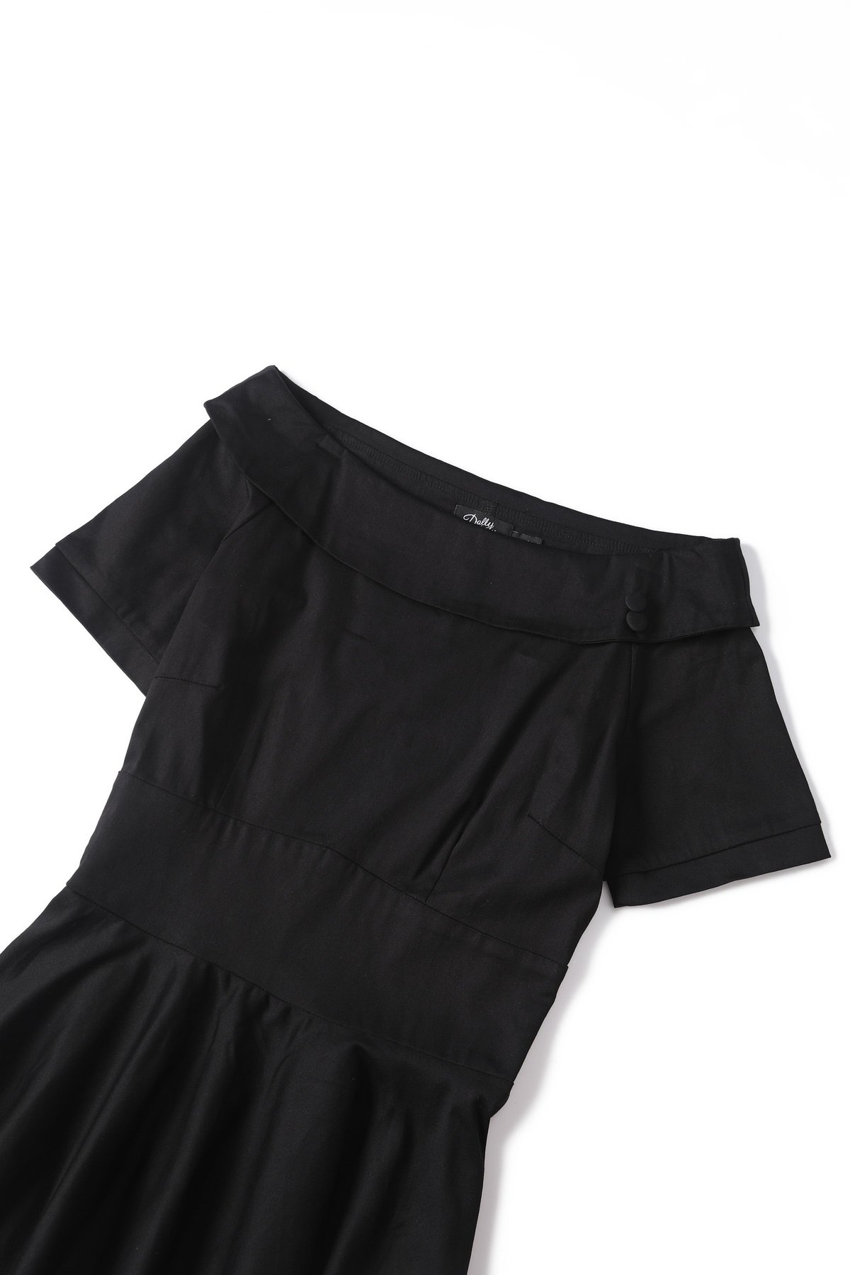Turn heads with our Darlene Stretchy Circle Swing Dress 🖤. This timeless black dress is your new wardrobe staple, regardless of the occasion. Radiating 50’s nostalgia, this gorgeous gown charms with an off-the-shoulder neckline, adorned with cute buttons for that added retro appeal. The flattering fit is owed to its short sleeves and broad waistband, coupled with a classic circle skirt that’s ready to twirl 💃.