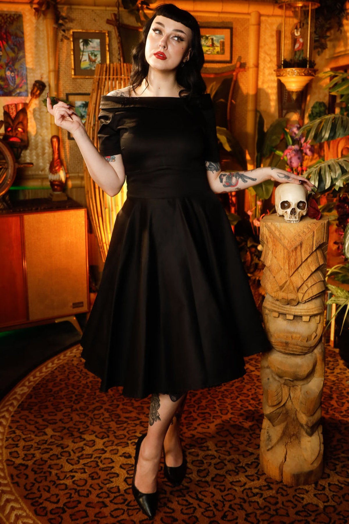 Unleash your inner feline fashionista with the Darlene Stretchy Circle Swing Dress—an instant purrfection in timeless black. Its vintage-inspired silhouette features a flattering wide waistband, charming off-the-shoulder neckline, and delightful button details, all wrapped in a comfy stretch fabric that moves with you. This dress is a sleek, sassy statement that’s ready to turn heads whether you're strutting down the street or twirling the night away. The classic 50s vibe is reimagined with modern comfort, giving you a look that’s as bold as a feline’s mischievous side.
