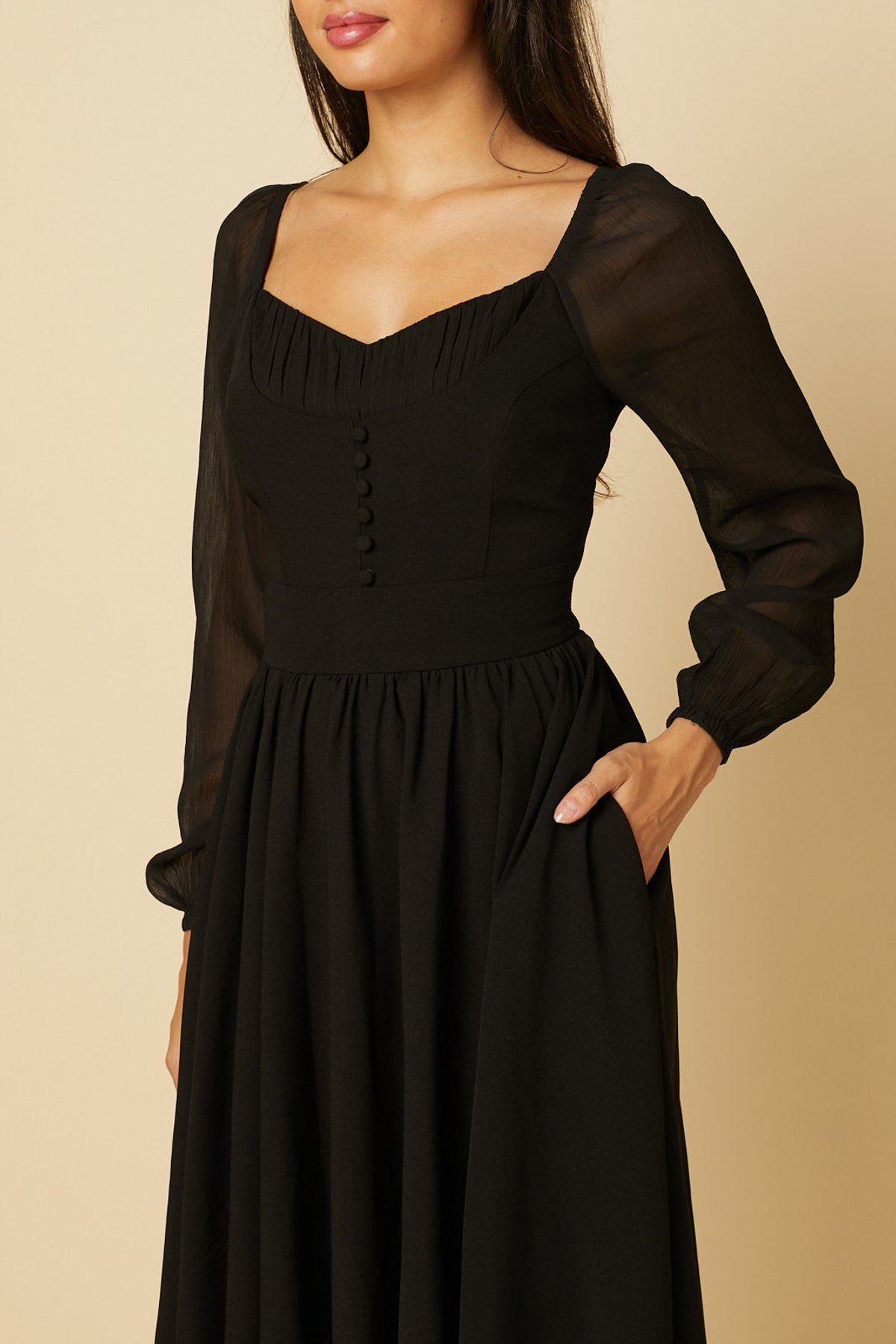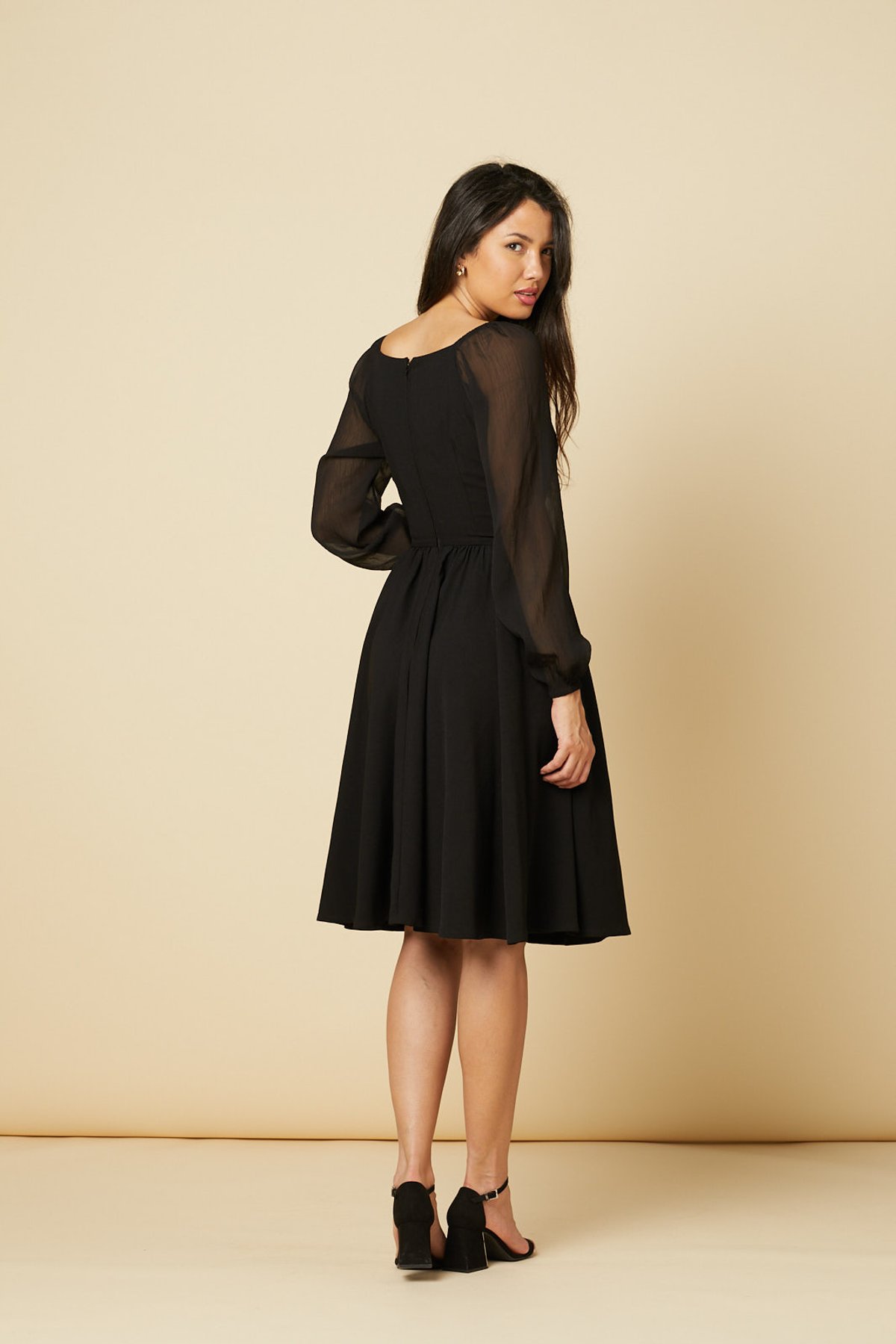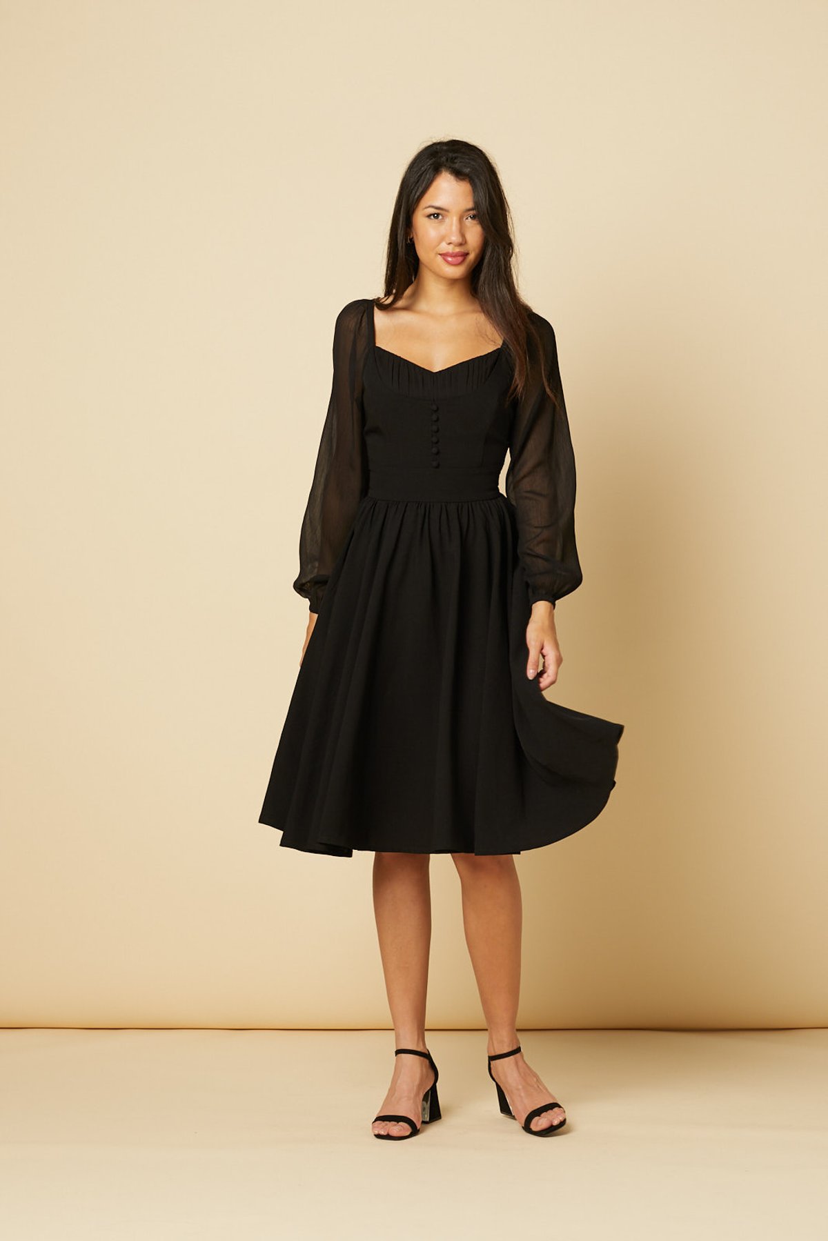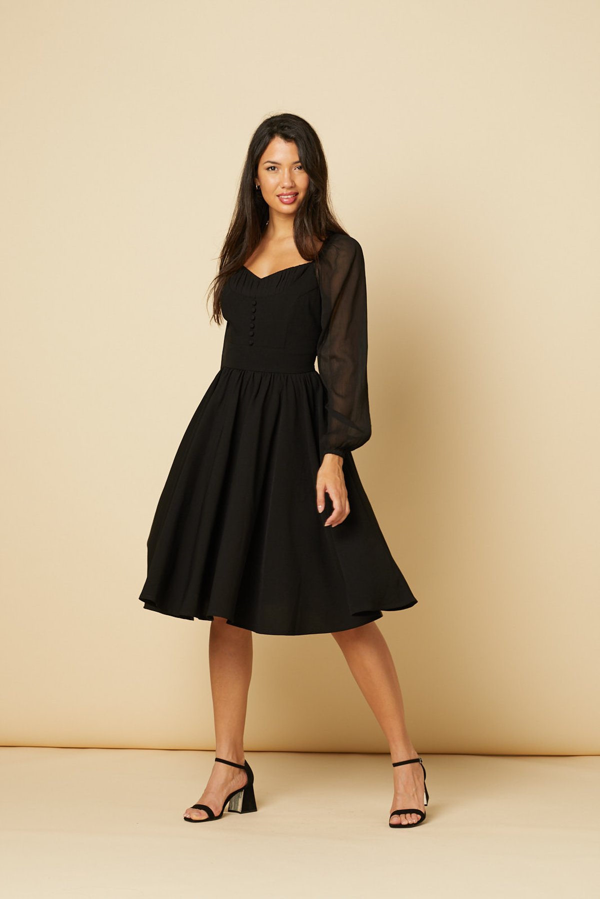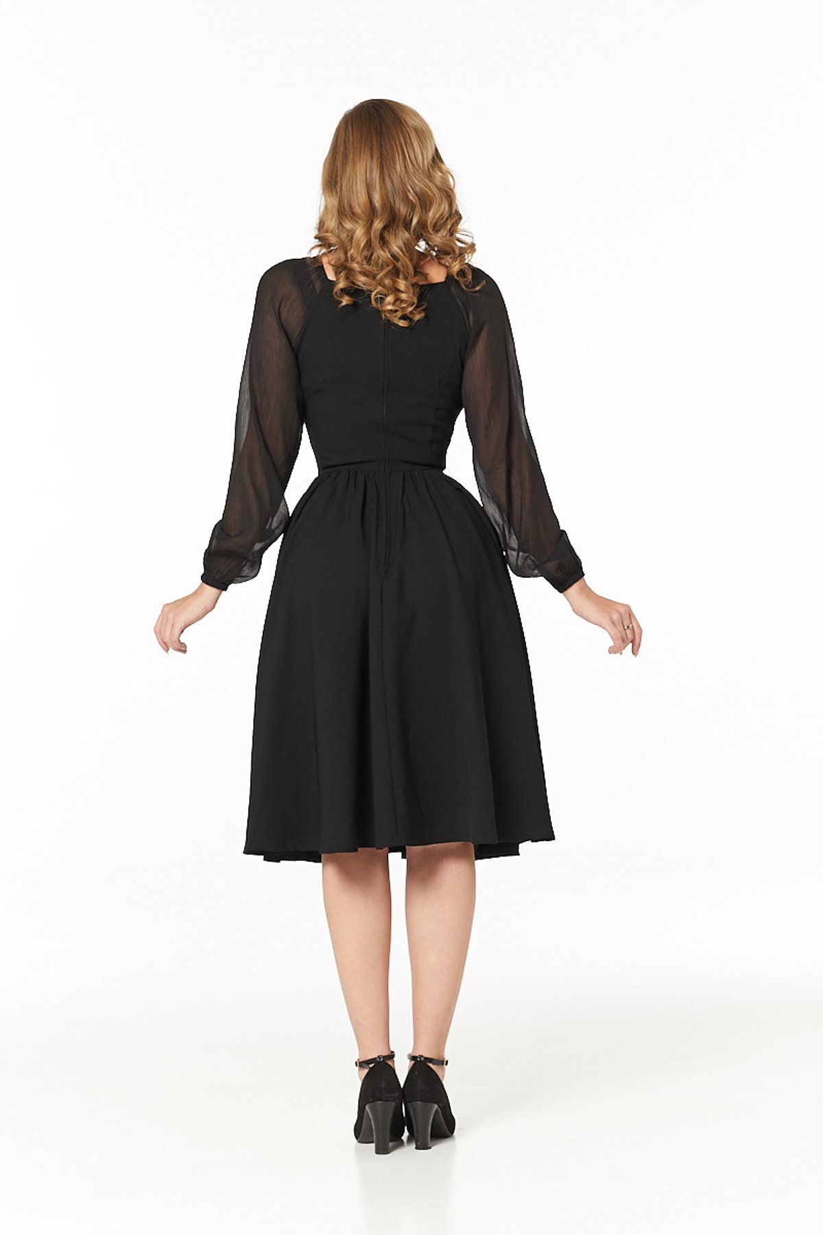Unleash your inner vintage vixen with this pitches-perfect black swing dress—it's a true head-turner for those who love to make every moment a little more glamorous. With its classic 1950s silhouette, the princess-seamed bodice and sweeping skirt work together to create a look that's both timeless and utterly captivating. The sheer chiffon overlay adds a whisper of finesse, while the faux buttons and elastic cuffs bring just enough playful charm to keep things interesting. Crafted from a sturdy woven crepe, this dress is designed to cling and flow with effortless grace, ensuring you stay claws-down gorgeous wherever you wear it.