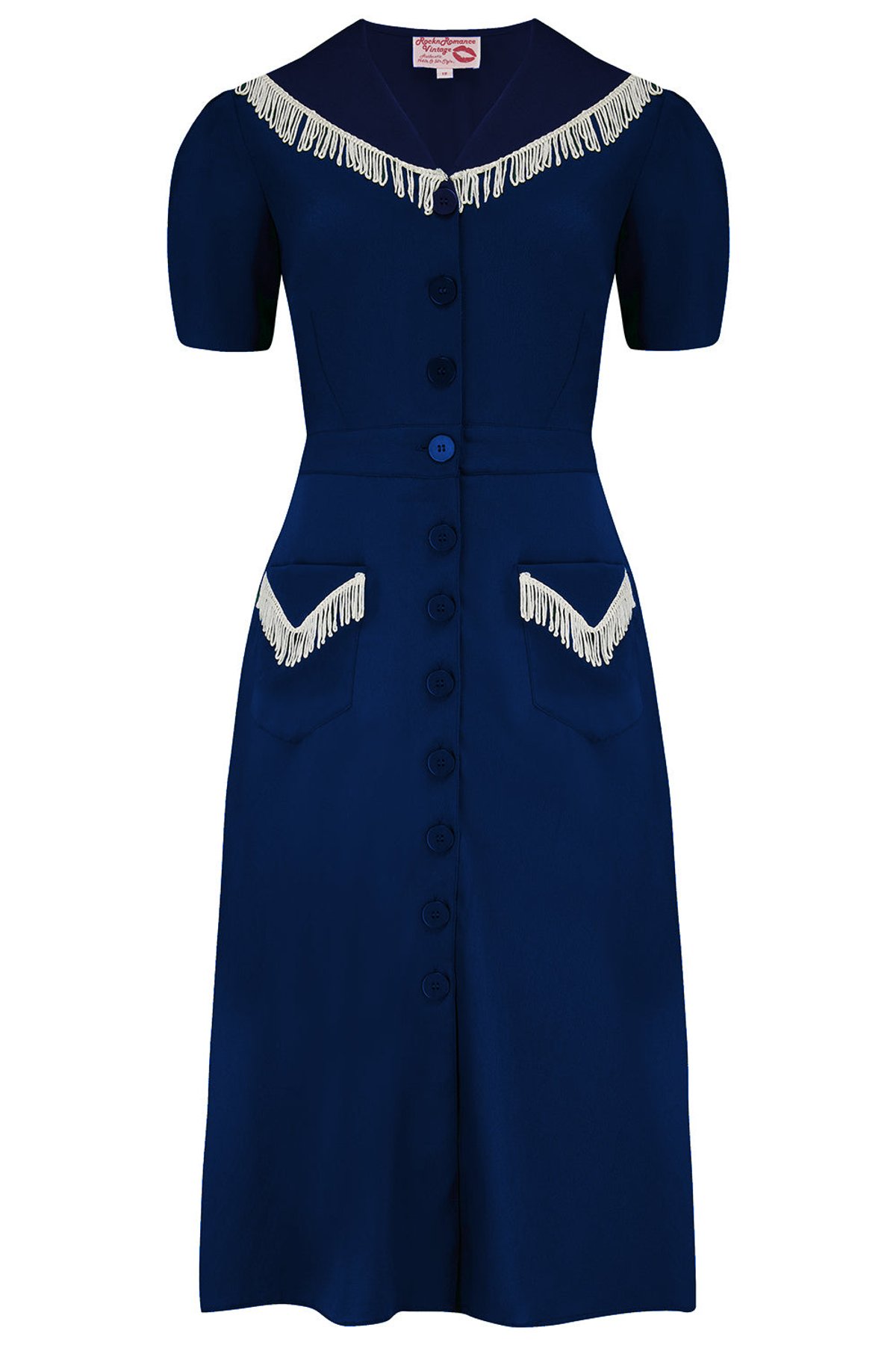 Get ready to turn heads in the Dolly Fringed Dress—where vintage charm meets modern sass. The rich navy hue is beautifully offset by delicate ivory accents, creating a look that’s both playful and polished. The fringed details shimmy with every step, adding a dash of movement and a whole lot of pizzazz. With its comfy elasticated waist and pockets, this dress is as practical as it is purrfectly stylish, making it a must-have for your wardrobe repertoire.