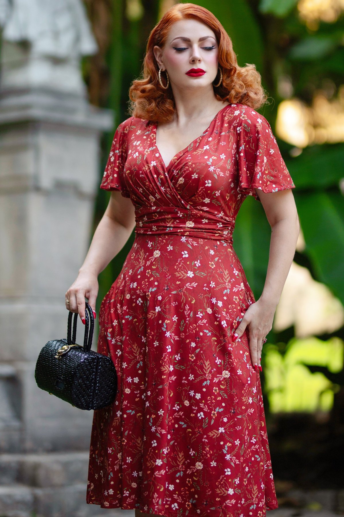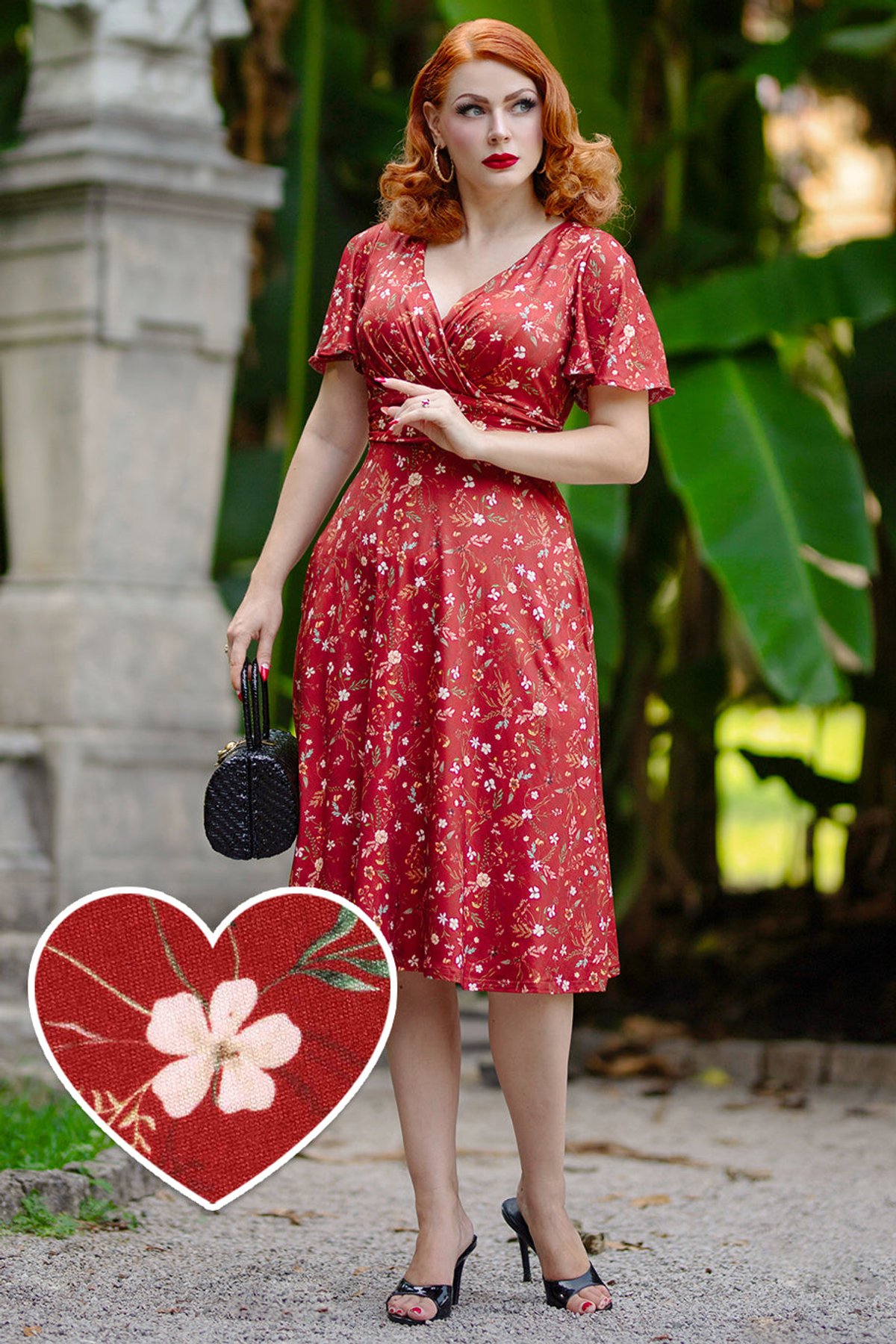 Unleash your inner vintage vixen with the Donna Burgundy Dainty Floral Tea Dress — a purrfect blend of retro charm and modern flirty finesse. The rich burgundy hue, kissed with delicate white florals, makes a statement that’s undeniably alluring. The crossover V neckline and ruffled waist work together to create a silhouette that’s both flattering and fabulously feminine, while butterfly sleeves add just the right touch of whimsy. Crafted from a soft knit blend, this dress offers all-day comfort without sacrificing style — perfect for turning heads from brunch to evening soirees. Whether you're feeling playful in the garden or channeling old Hollywood glamour, this floral beauty is your go-to.