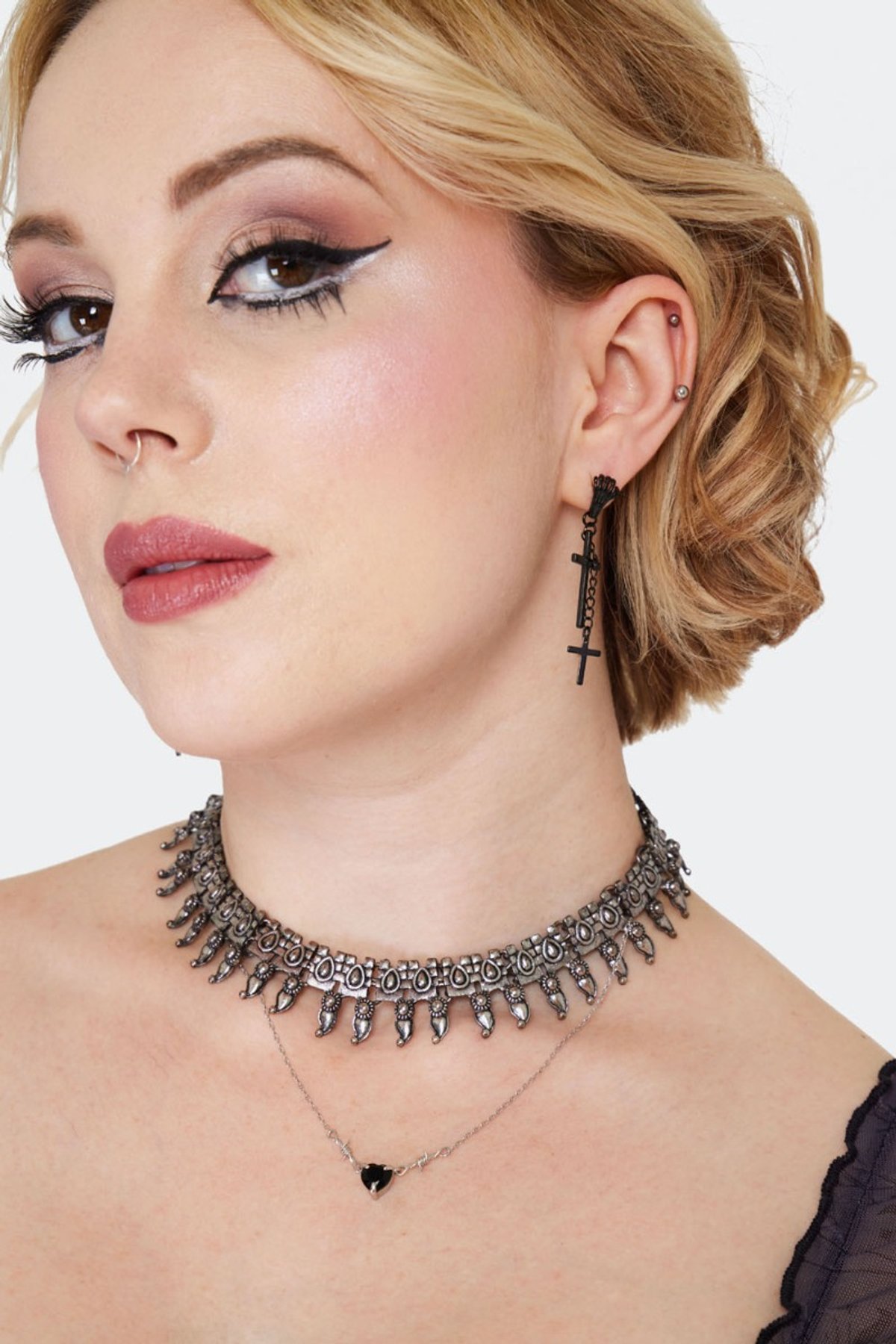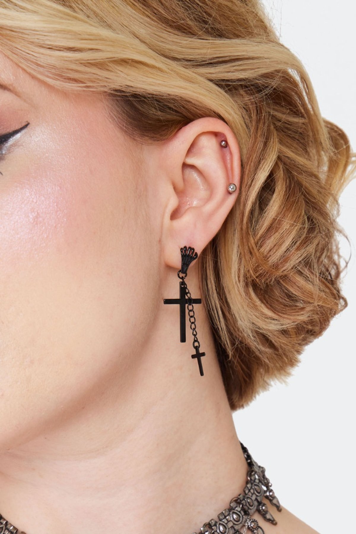 Unleash your inner mystery with the Double Cross Drop Earrings in sleek black—a true purrfect blend of gothic allure and modern edge. These earrings make a daring statement with their double cross design, draping gracefully to add a touch of dark elegance to any look. The claw-like stud fastening ensures they stay secure while you conquer your day with confidence and a hint of mischief. Whether you're channeling an evening of allure or elevating a casual ensemble, these earrings are claws-down gorgeous.