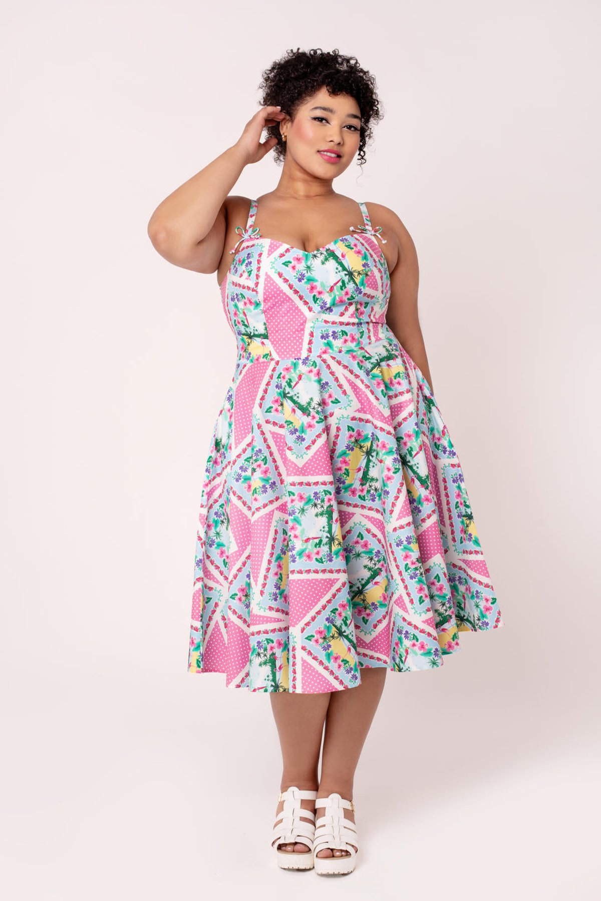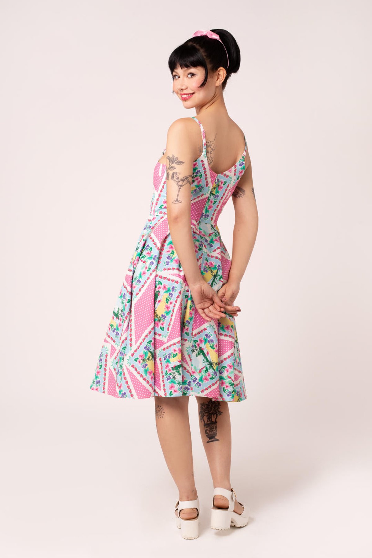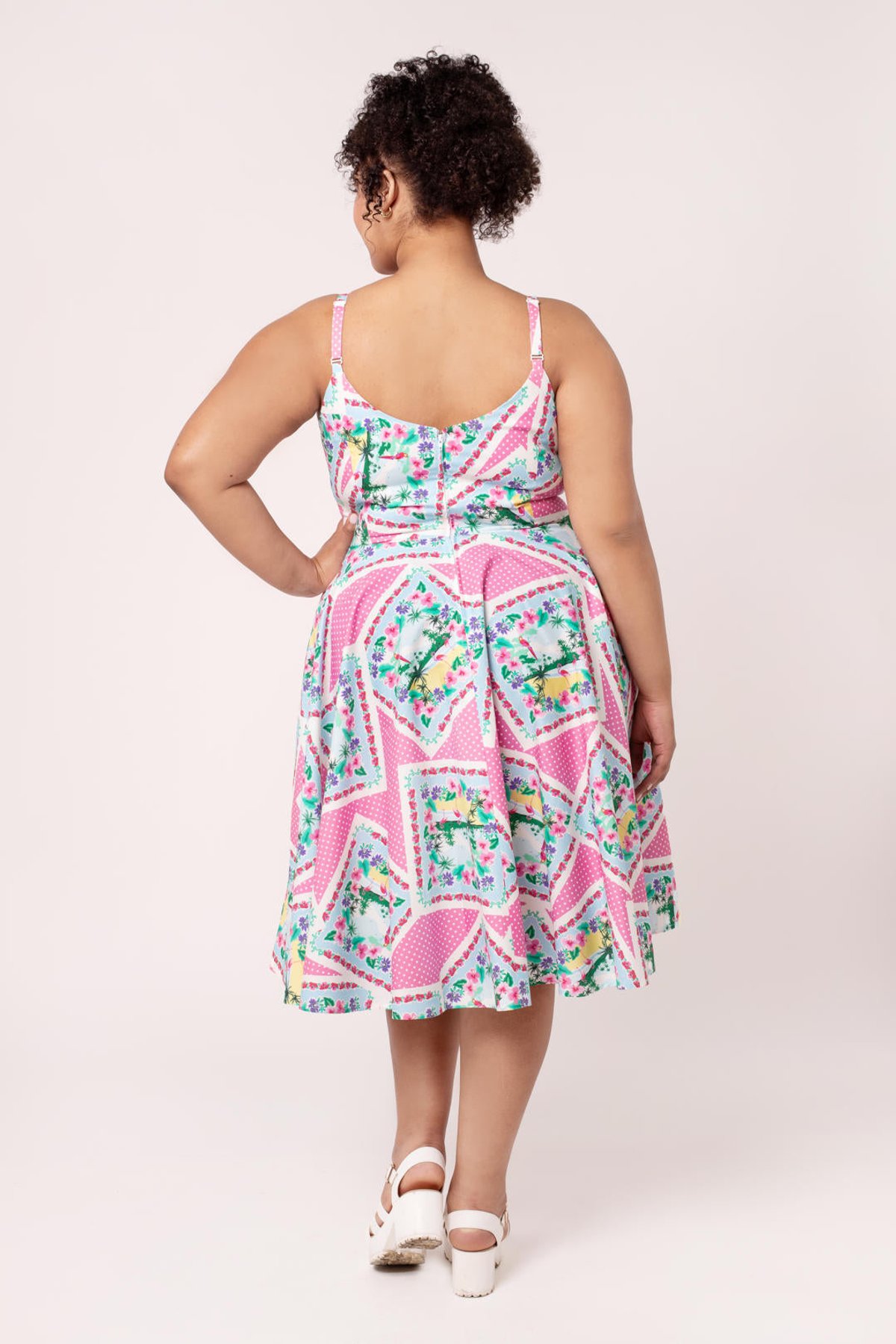 Step into a world where vintage elegance meets playful sophistication with the Dreamland Dress. Its charming pink and white polka dot cotton fabric is sprinkled with whimsical tropical illustrations—think of it as a splash of paradise in your wardrobe. The adjustable straps, topped with adorable bows, and a flattering sweetheart neckline make this piece a true showstopper, while the full circle skirt invites you to twirl with abandon. Perfectly crafted to hug your curves yet offer all-day comfort, it’s a delightful blend of nostalgia and modern charm. Whether you’re dressing up for a garden party or adding a dash of vintage glamour to brunch, this dress is your new go-to for effortless style with a playful twist.