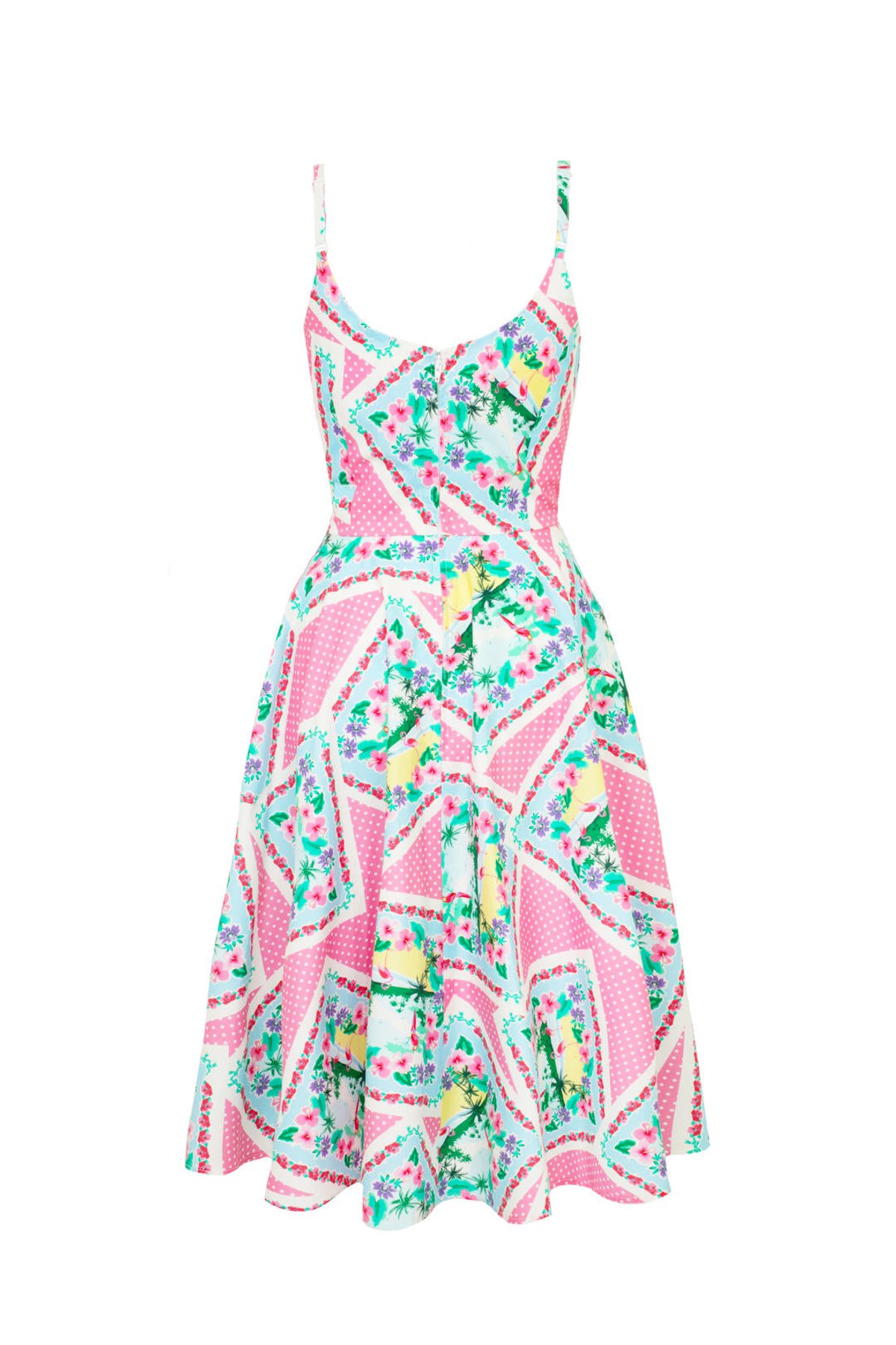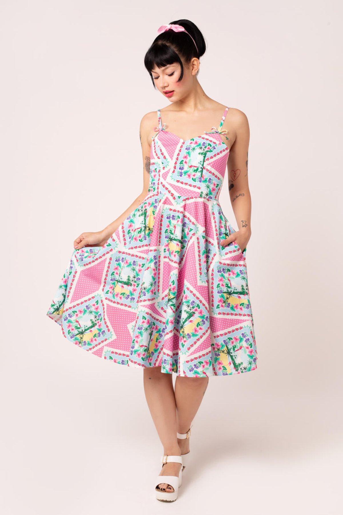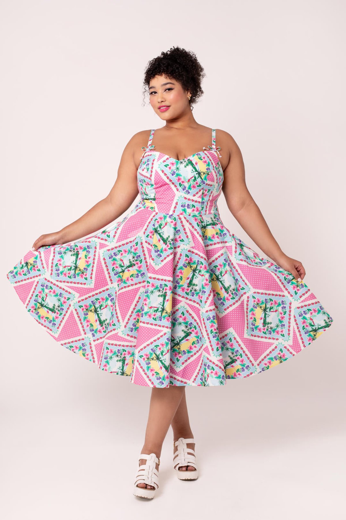 Step into a world where vintage elegance meets playful sophistication with the Dreamland Dress. Its charming pink and white polka dot cotton fabric is sprinkled with whimsical tropical illustrations—think of it as a splash of paradise in your wardrobe. The adjustable straps, topped with adorable bows, and a flattering sweetheart neckline make this piece a true showstopper, while the full circle skirt invites you to twirl with abandon. Perfectly crafted to hug your curves yet offer all-day comfort, it’s a delightful blend of nostalgia and modern charm. Whether you’re dressing up for a garden party or adding a dash of vintage glamour to brunch, this dress is your new go-to for effortless style with a playful twist.