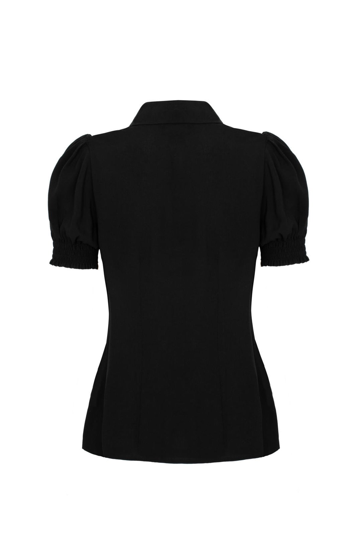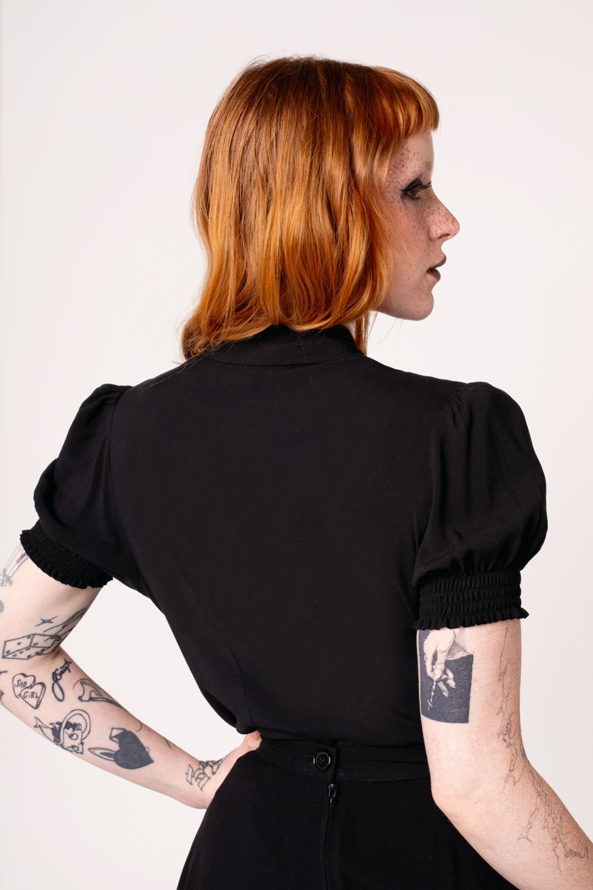 Unleash your dark side with the Elyse Blouse—a true showstopper that’s as mysterious as it is stylish. The rich black fabric is beautifully contrasted by fiery red embroidery, weaving an alluring tale of gothic glamour. The ornate motifs on the pointed collar and across the chest add a touch of drama, while the semi-fitted cut contours your silhouette with effortless grace. Short puff sleeves with frilled cuffs whisper vintage charm, making this piece as versatile as it is captivating. Crafted from sumptuously soft viscose, it’s a purrfect blend of comfort and edge, designed to turn heads without sacrificing ease.
