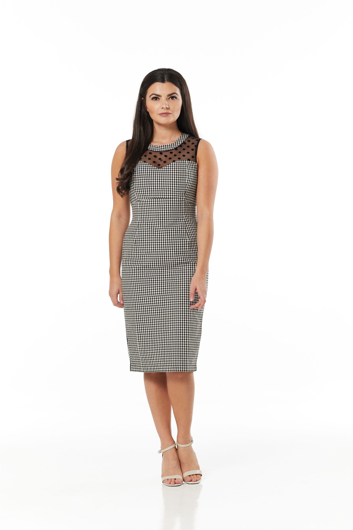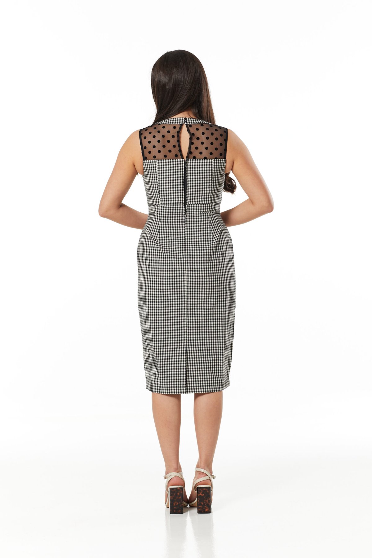 Step into the purr-fect blend of vintage charm and modern sass with the Erika Gingham Dress. This look is a feline-approved mix of classic black and white gingham, hugged to flatter your curves with a sleek pencil silhouette. The delicate mesh overlay, sprinkled with playful polka dot details, adds a hint of mischief—making every step you take irresistibly stylish. Whether you’re feeling chic for a daytime rendezvous or glamorous enough for a night out, this dress is your go-to for turning heads and catching compliments. The round neckline perfectly frames your collarbone, tying the entire look together with feline finesse. Designed for women who appreciate timeless elegance with a dash of daring, it fastens at the back with a covered zip and a cheeky button at the nape—so you stay comfy and confident all day and night long.