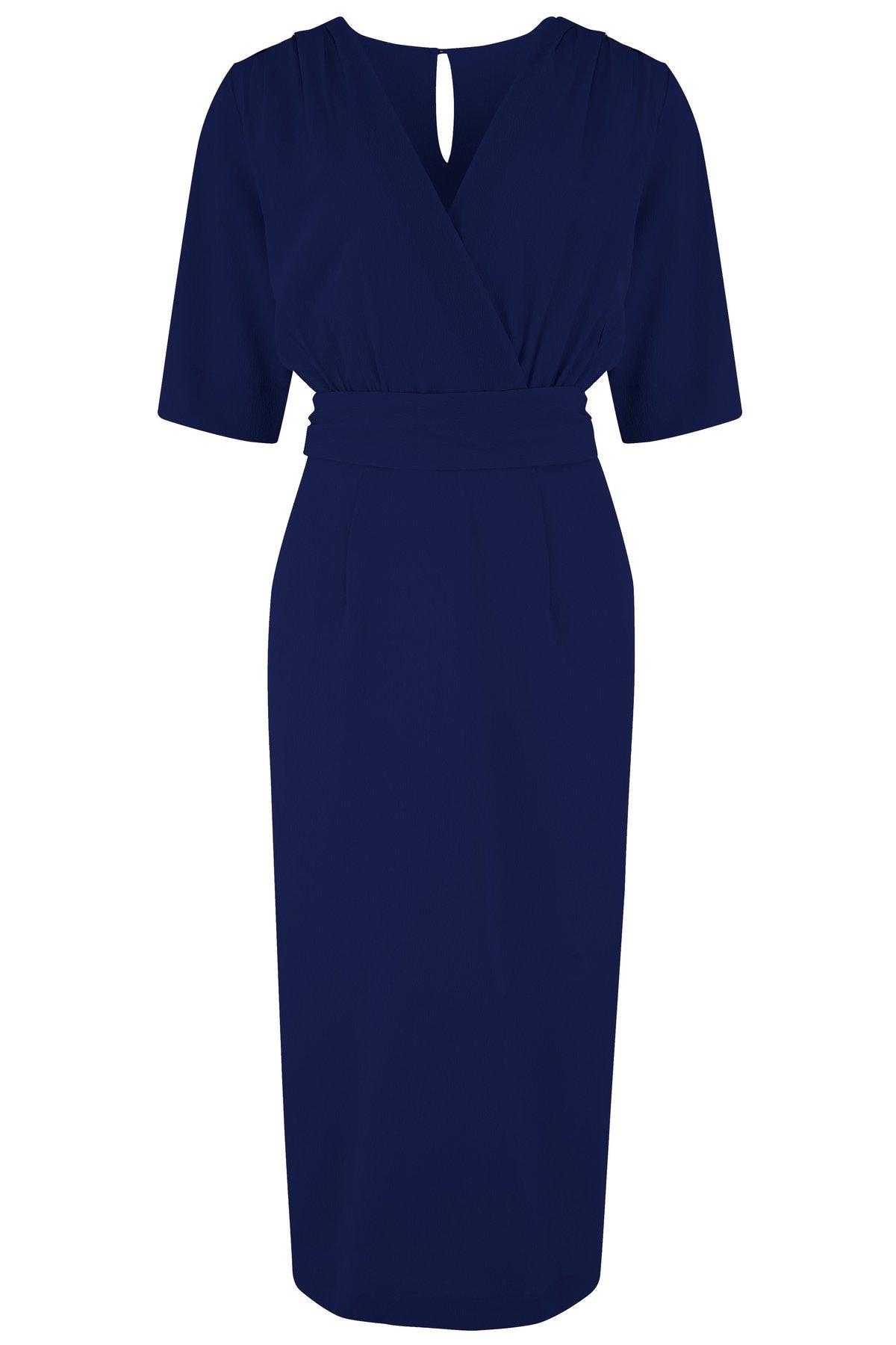 Unleash your inner vintage vixen with the Evelyn Wiggle Dress in Navy—an ode to classic glamour with a modern twist. Its figure-flattering silhouette, accented by a chic V-neck wrap-over and a wide sash belt, is designed to cling just right, ensuring you’re claws-down gorgeous. The mid-length sleeves and flirty slit add a dash of playful sophistication, while the charming keyhole at the back hints at subtle allure. Crafted from luxurious Poly Crepe, this dress drapes like a dream and feels whisper-soft against your skin, making every twirl an absolute delight. Whether you’re feeling a touch of 50s rockabilly rebellion or channeling vintage elegance, this versatile piece is your perfect partner for turning heads and stealing hearts.