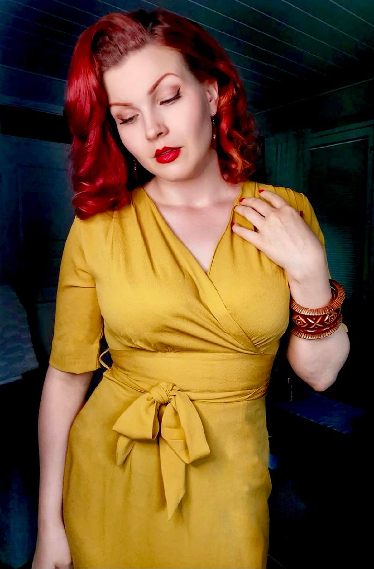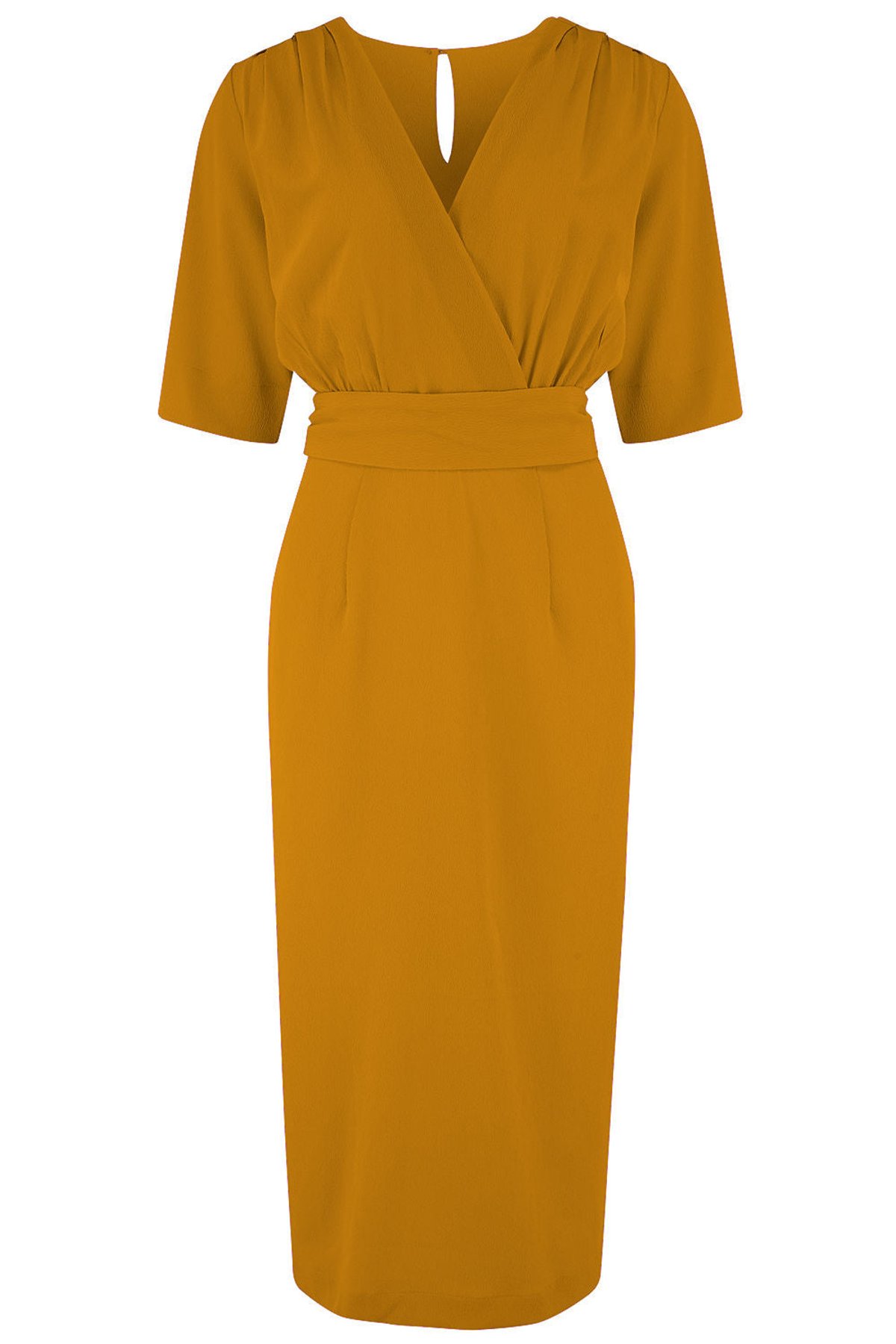 Unleash your inner vintage vixen with the Evelyn Wiggle Dress in mustard—a feline-approved blend of timeless charm and sassy sophistication. This claw-some silhouette hugs your curves in all the right places, with a chic V-neck wrap-over front and a sash belt that cinches to perfection. The mid-length sleeves add a touch of polish, while the cheeky slit at the hem offers just a hint of playful allure. Crafted from luxurious Poly Crepe, this dress feels as silky as a purr and is as easy to care for as a nap in the sun. Whether you're heading to a posh soirée or a dinner date, this dress will make you the cat's whiskers in any setting.