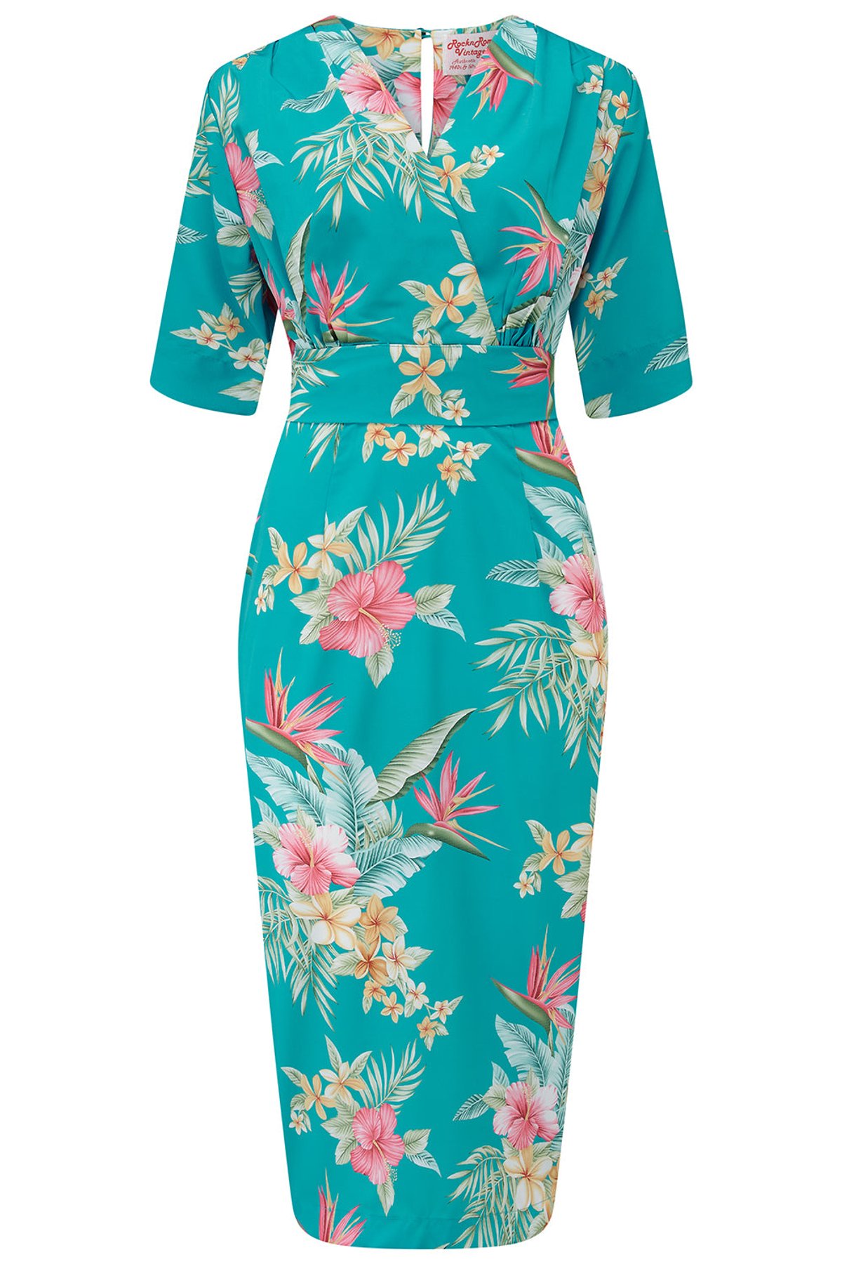 Step into a world where vintage glamour and playful charm collide — the Evelyn Wiggle Dress in Teal Honolulu is a true showstopper. With its beautifully draped Poly Crepe fabric, this dress offers a silky-smooth feel and a silhouette that’s as purrfect as it is flattering. The floral print adds a touch of whimsy, while the V-neck wrap-over front and wide sash belt create an alluring, hourglass shape. The mid-length sleeves and flirty slit in the skirt bring just enough sass to keep things interesting, and the back keyhole whispering of old Hollywood adds a subtle, sophisticated finish. Whether you’re channeling a retro starlet or adding a dash of vintage flair to your wardrobe, this piece is designed to turn heads and steal hearts.