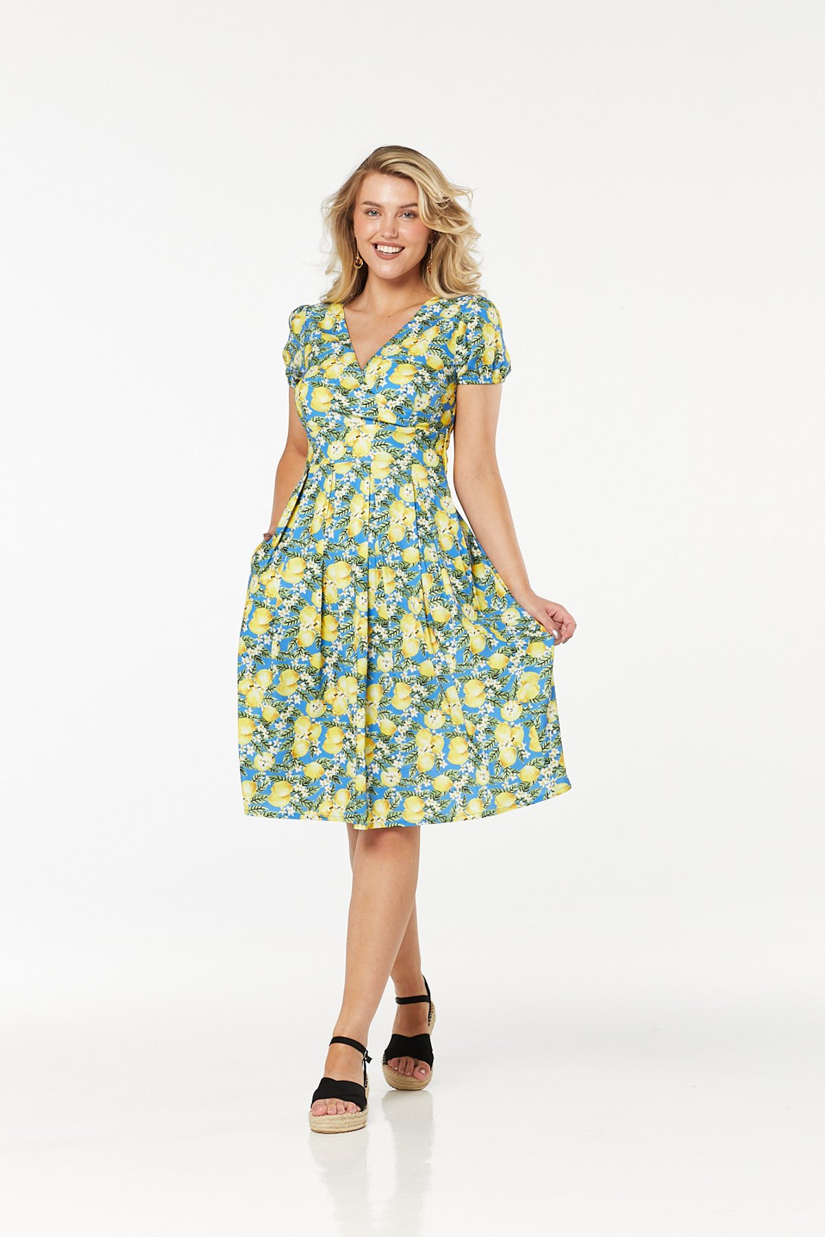 Unleash your inner vintage siren with the Fin Dress—a true showstopper that melds retro charm with modern grace. Its lively lemon print dances across a serene blue canvas, while the surplice neckline and cinched waist bring a touch of effortless allure. Perfectly suited for those who love a hint of nostalgia with a contemporary twist, this dress is designed to make you feel both playful and polished, whether you're out for brunch or a chic garden party.