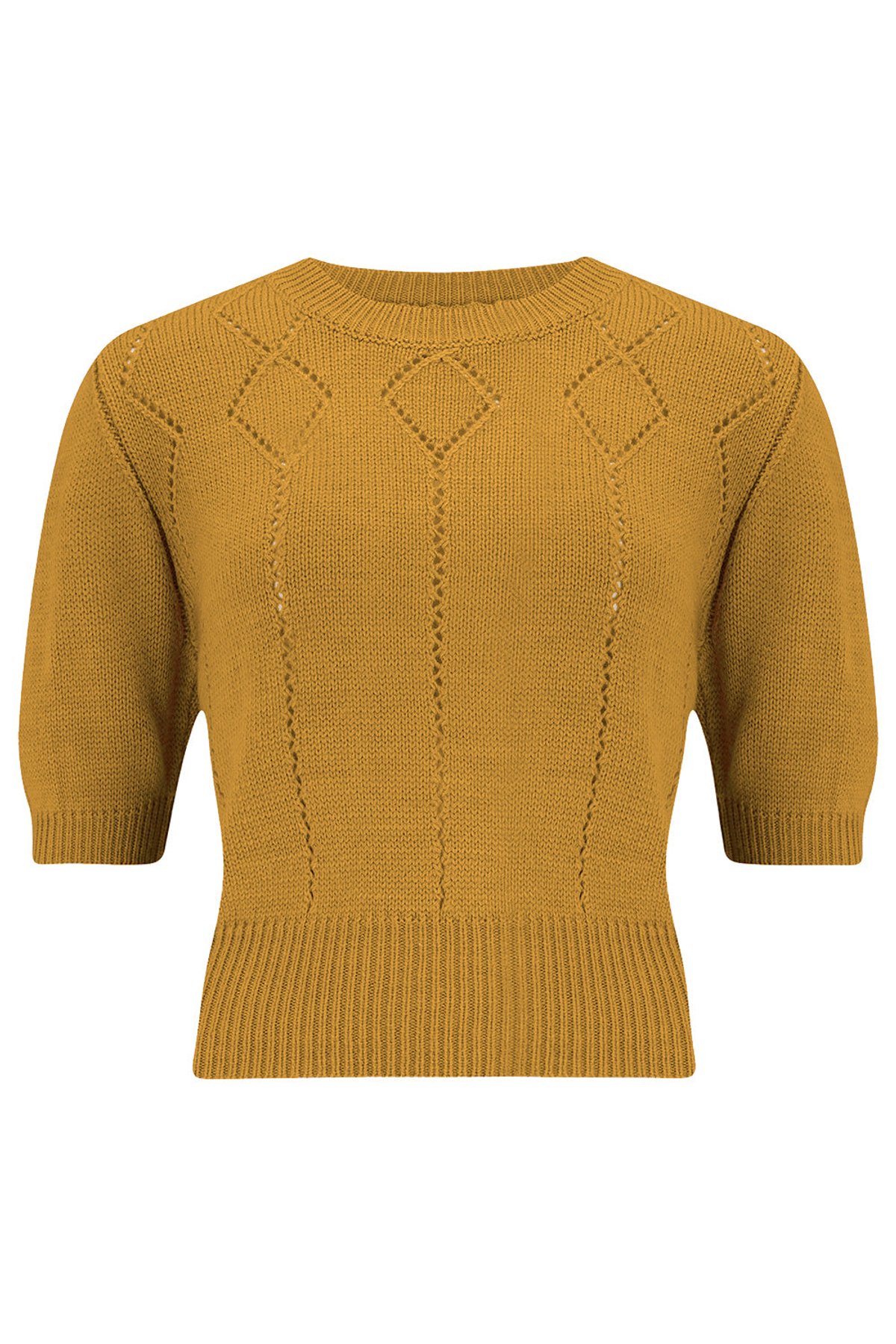 Step into a world of playful sophistication with our Frances Short Sleeve Pullover Jumper in Light Mustard. This little gem is a claws-down gorgeous blend of vintage charm and modern chic, featuring a cozy knit texture enriched with a subtle diamond pattern that catches the eye. The light mustard hue adds a sunny, smile-inducing touch, perfect for brightening up any casual wardrobe. Its classic silhouette and nifty neck buttons make it as easy to wear as it is to adore—just slip it on and let your style purr. Whether you're embracing a retro-inspired look or simply want a charming staple for everyday ease, this jumper has your back (and your front).