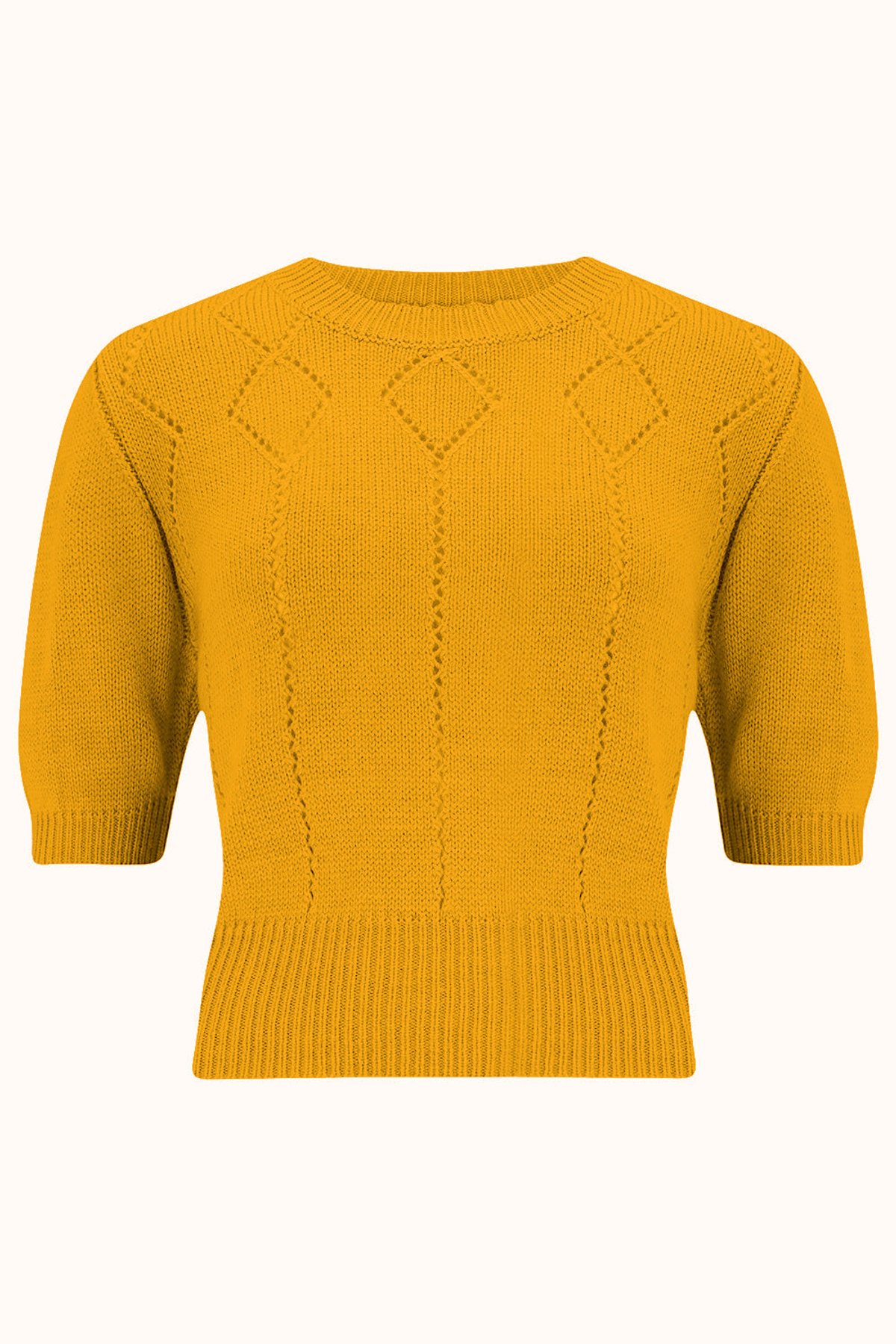 🌻 Get ready to dazzle in the Frances Short Sleeve Pullover Jumper in a vibrant Sunflower Yellow. 💛 This stunning knitwear piece is far from ordinary. It’s an invitation to step back to the glamour and elegance of the 1950s, with its characteristic diamond knit pattern and charming neck buttons.