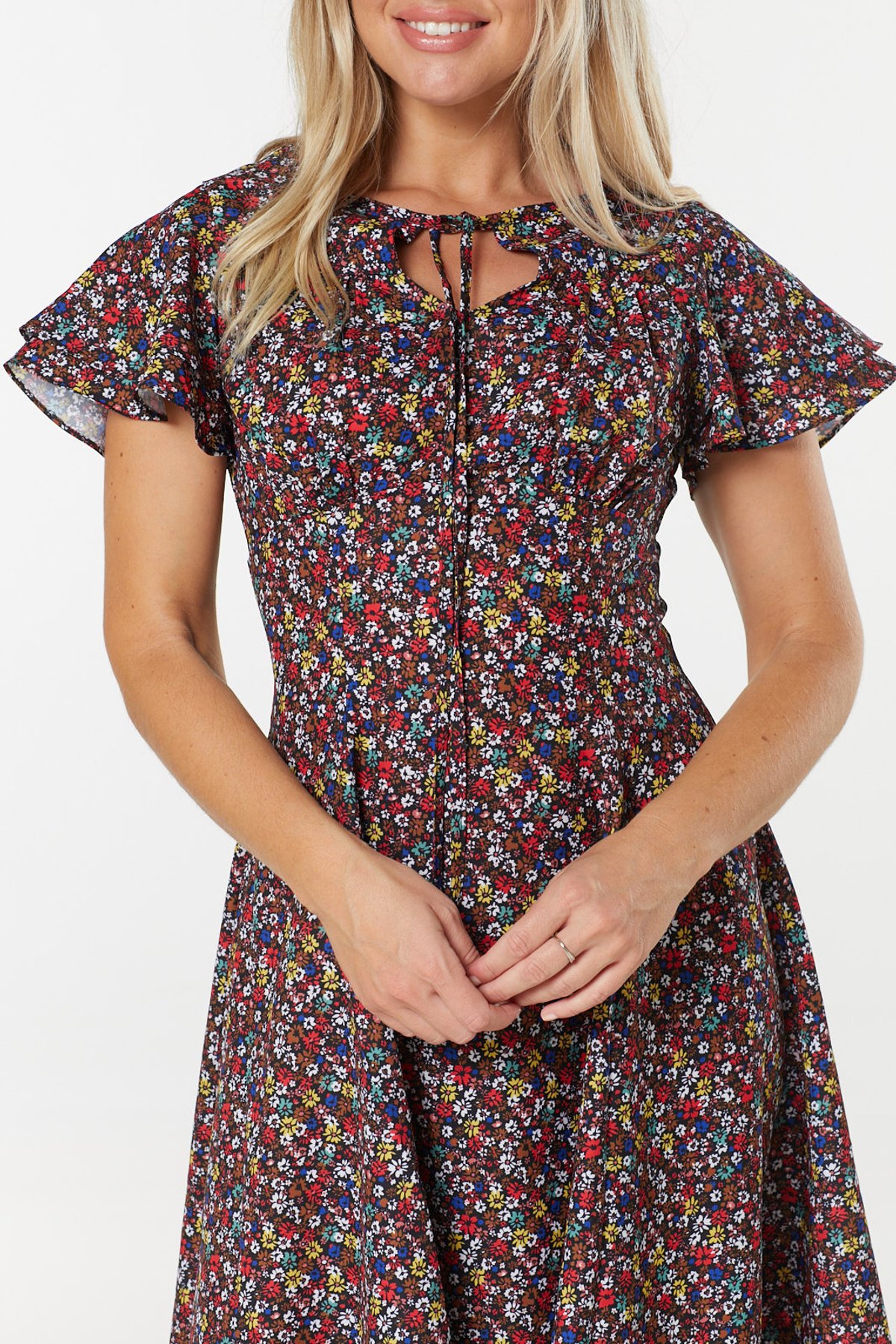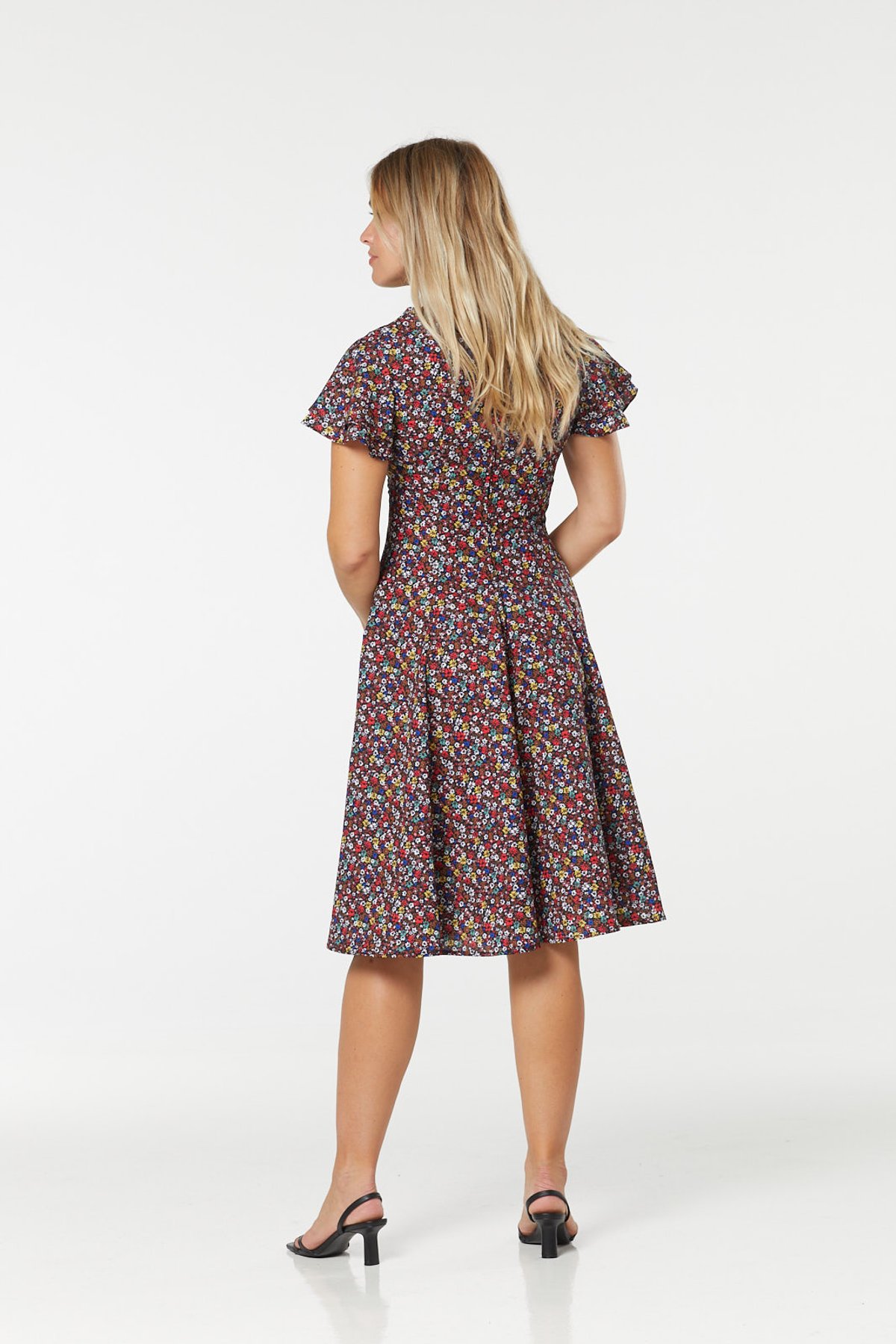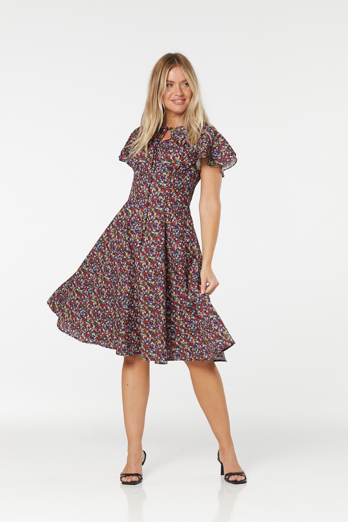 Meet the Frida Dress—a true purrfection for those who love to turn heads with effortless, vintage-inspired style. Its dark floral pattern is a masterclass in mid-century elegance, with pops of red and yellow that add a splash of joyful vibrancy. The self-tie keyhole detail offers a subtle hint of intrigue, while the tiered ruffle sleeves bring playful movement to every step you take. Crafted from lightweight recycled polyester, this dress is as breezy and sustainable as a summer afternoon, making it perfect for twirling through life’s moments with a little extra flair.