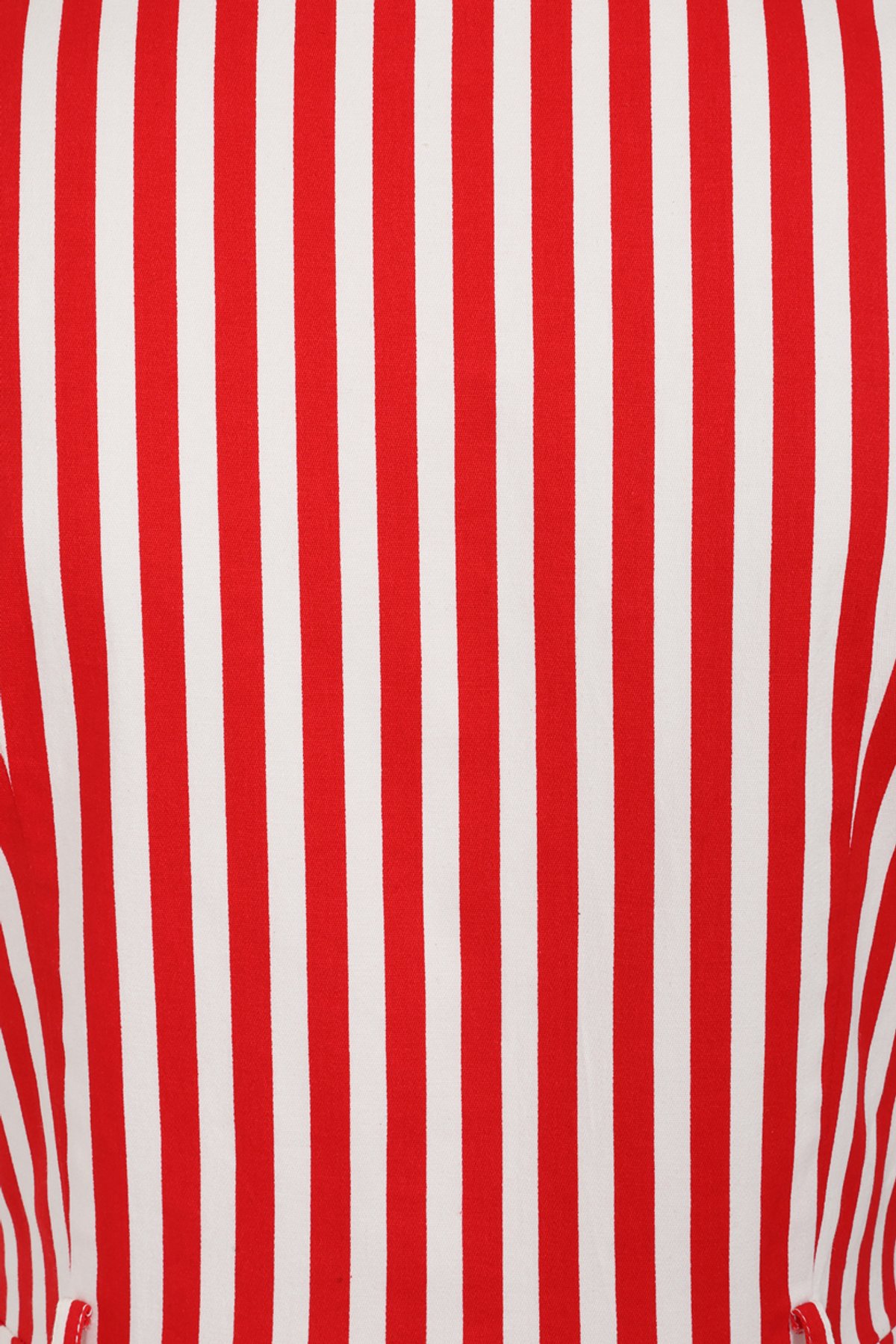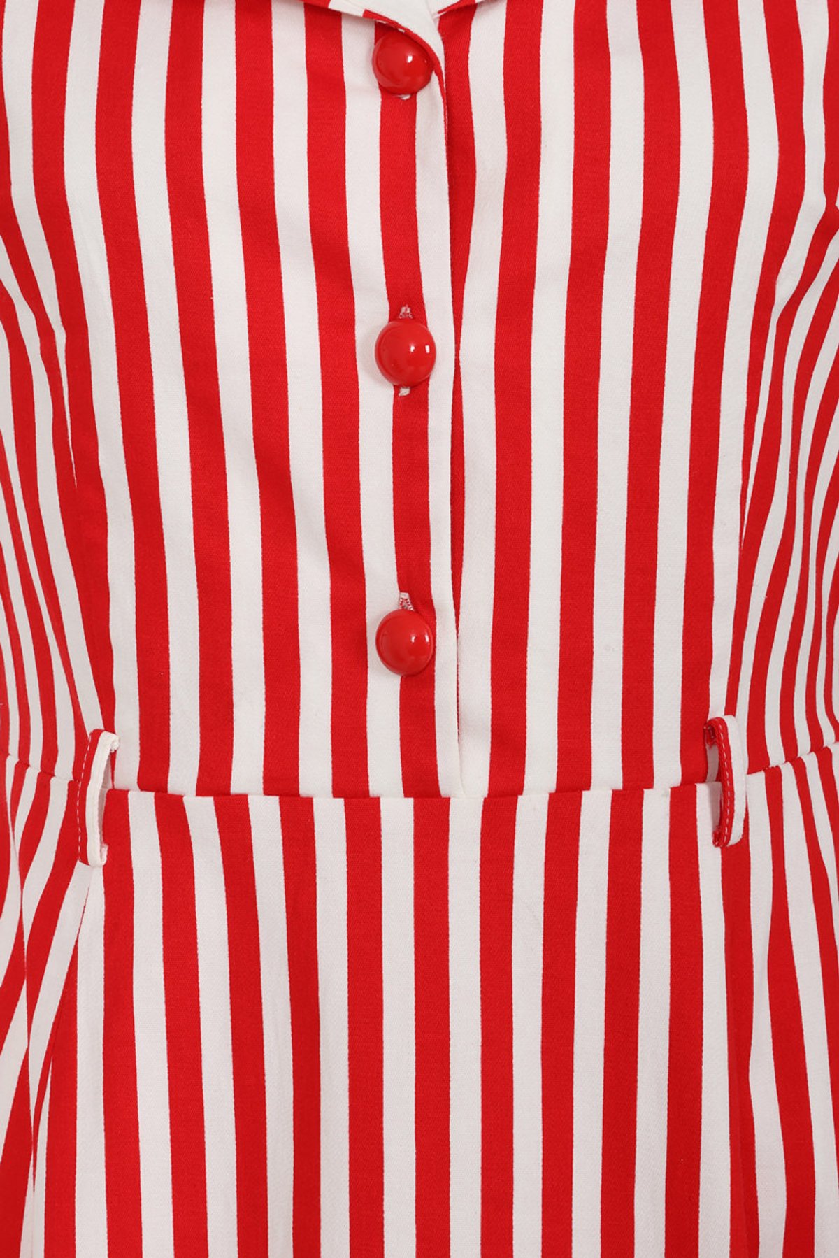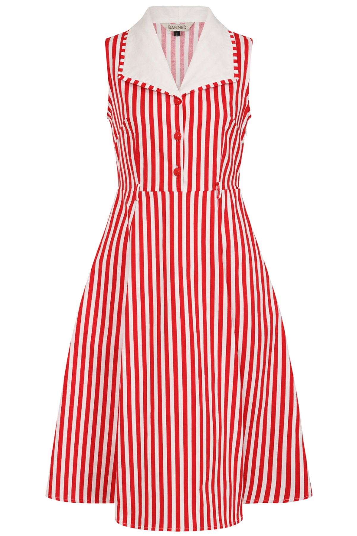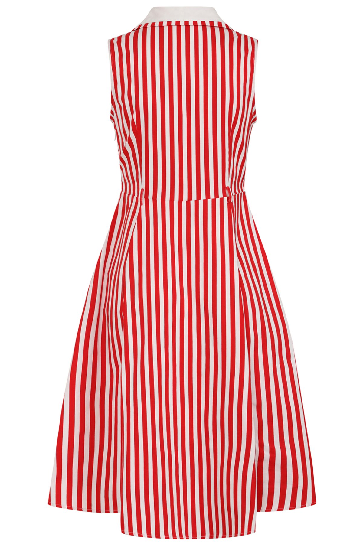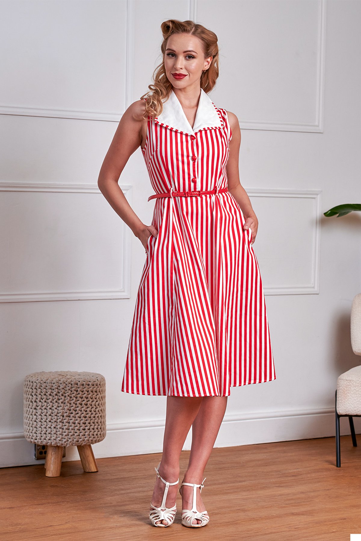 Classic sleeveless shirt dress with a wide contrast ivory collar, real button stand on the front, and a 3/4 swing skirt shape. Striped, stretchy, and available in two colours. Belt not included.