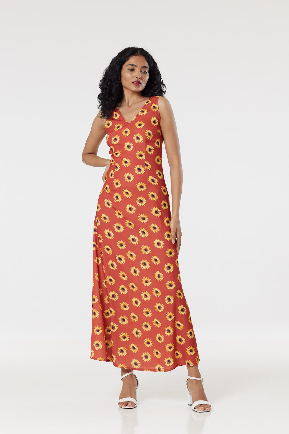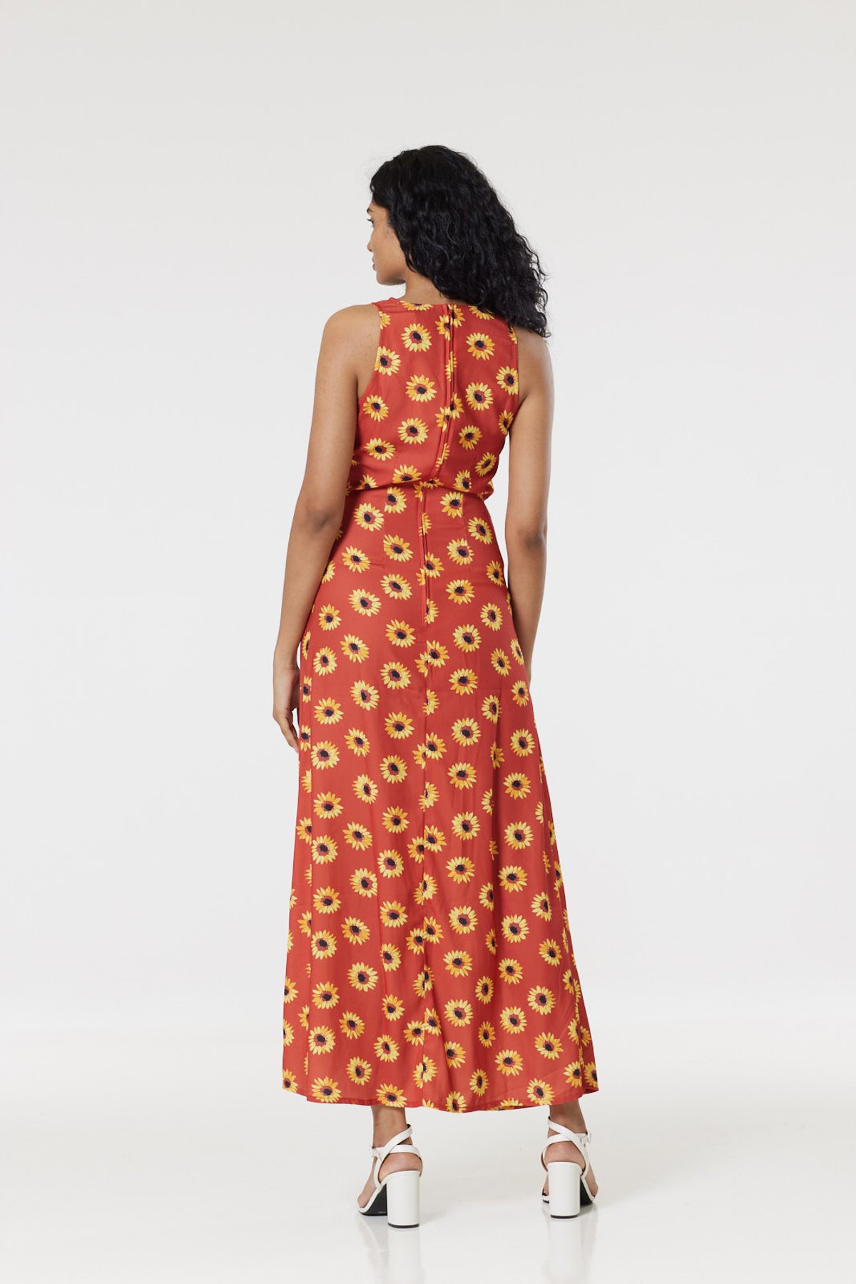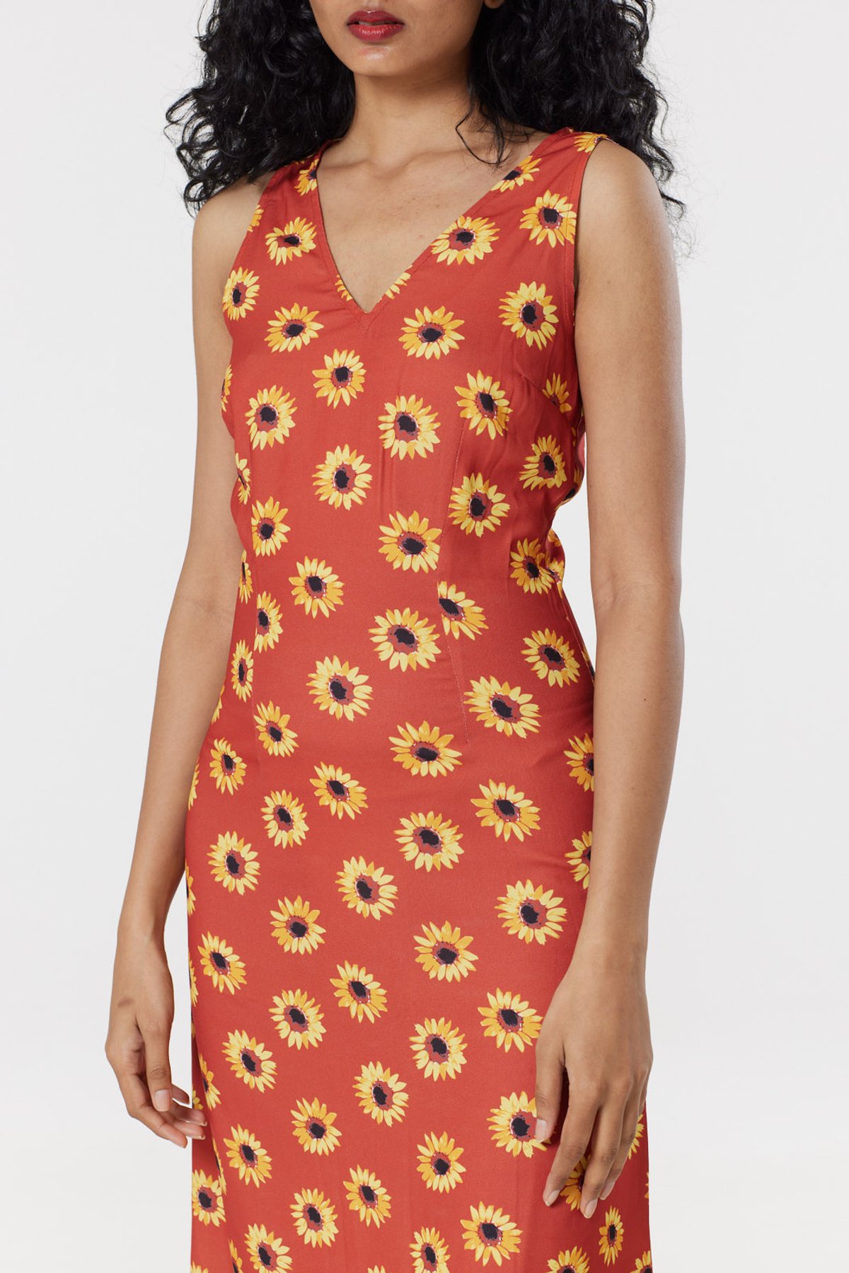 Unleash your inner vintage vixen with the Glini Maxi Dress—an intoxicating blend of boho charm and timeless elegance. The fiery rust-orange backdrop, dotted with sun-kissed yellow sunflowers, creates a look that's as cheerful as a cat purring in the sun. The sultry V-neckline and breezy sleeveless cut are paws-itively flattering, while the flowing skirt offers a graceful sway that’s truly irresistible. Crafted in lightweight woven fabric, this maxi is as comfortable as it is captivating, perfect for making a purrfect statement from brunch dates to sunset strolls. Slip into it with ease thanks to the back zipper, and get ready to be the center of attention wherever you strut.
