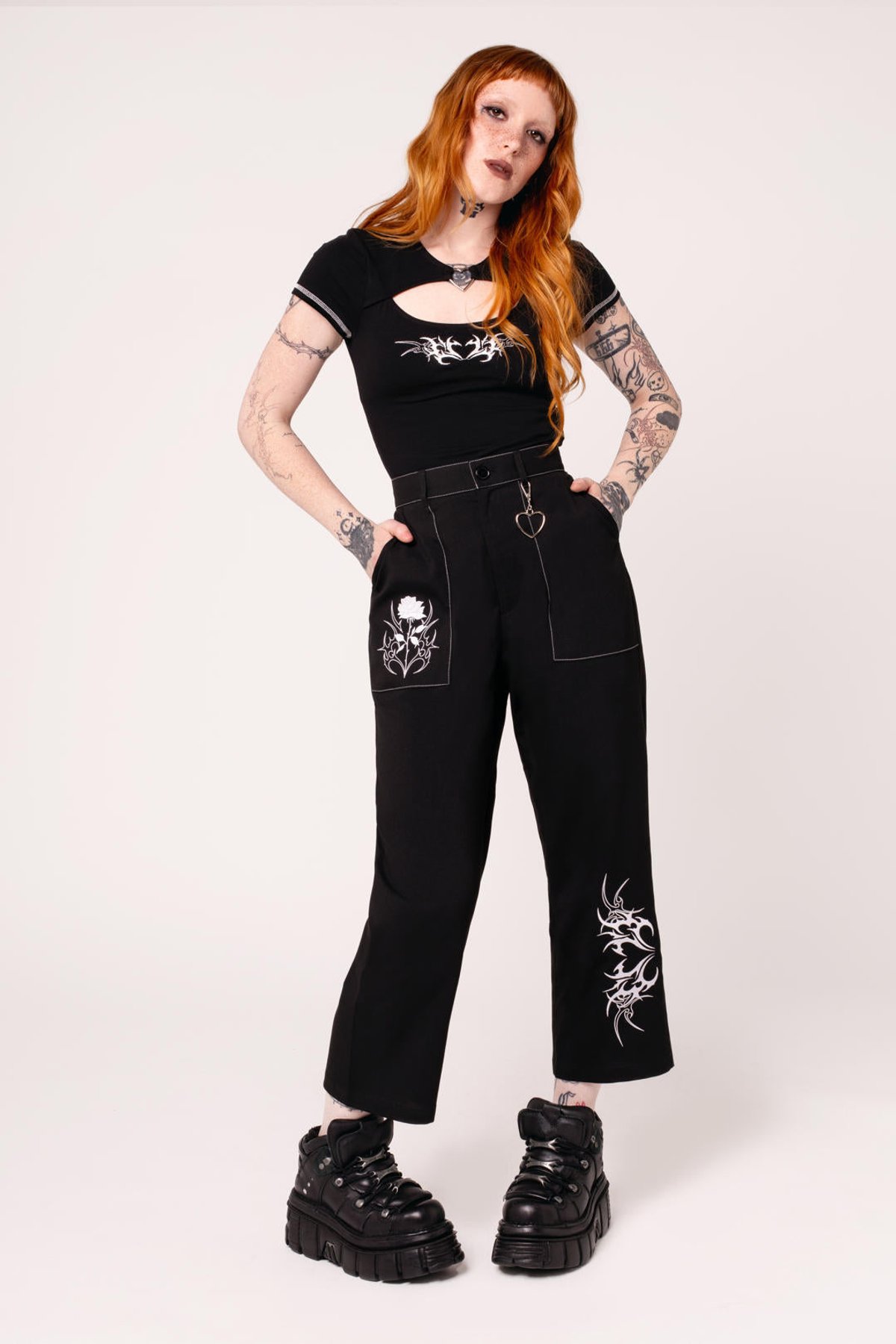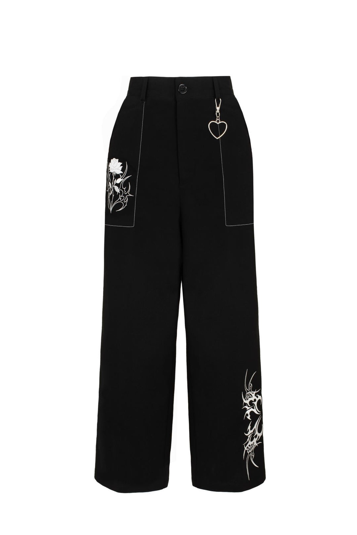 Unleash your inner rebel with the Auri Trousers—where gothic edge meets a playful touch of personality. The striking black fabric is beautifully contrasted by bold white tribal embroidery, creating a look that’s both fierce and fabulous. The crisp white stitch detailing on the pockets adds just the right amount of sass, while the silver heart charm dangling from the waist whispers a hint of punk romance. With their straight leg silhouette and a comfortable button-and-zip fastening, these trousers are designed to make a statement without sacrificing style or ease. Crafted from a mix of polyester, viscose, and elastane, they offer just enough stretch to keep you feeling confident all day long. Whether you’re channeling dark romance or just craving a standout pair, the Auri Trousers are ready to turn heads and keep you purrfectly chic.