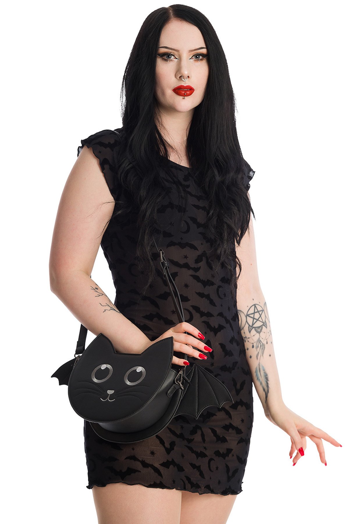 Unleash your darkly delightful side with the Black SPELL ON YOU DRESS—where vintage charm meets a wickedly playful twist. The sleek black fabric, decorated with mischievous bat motifs, drapes with a figure-flattering stretch that’s as comfy as it is captivating. This dress purrs with retro elegance, accented by a silhouette that whispers secrets of moonlit nights and midnight mischief. Whether you're summoning spooky allure or just craving a touch of goth-glam, this frock is your new spellbinding secret weapon.
