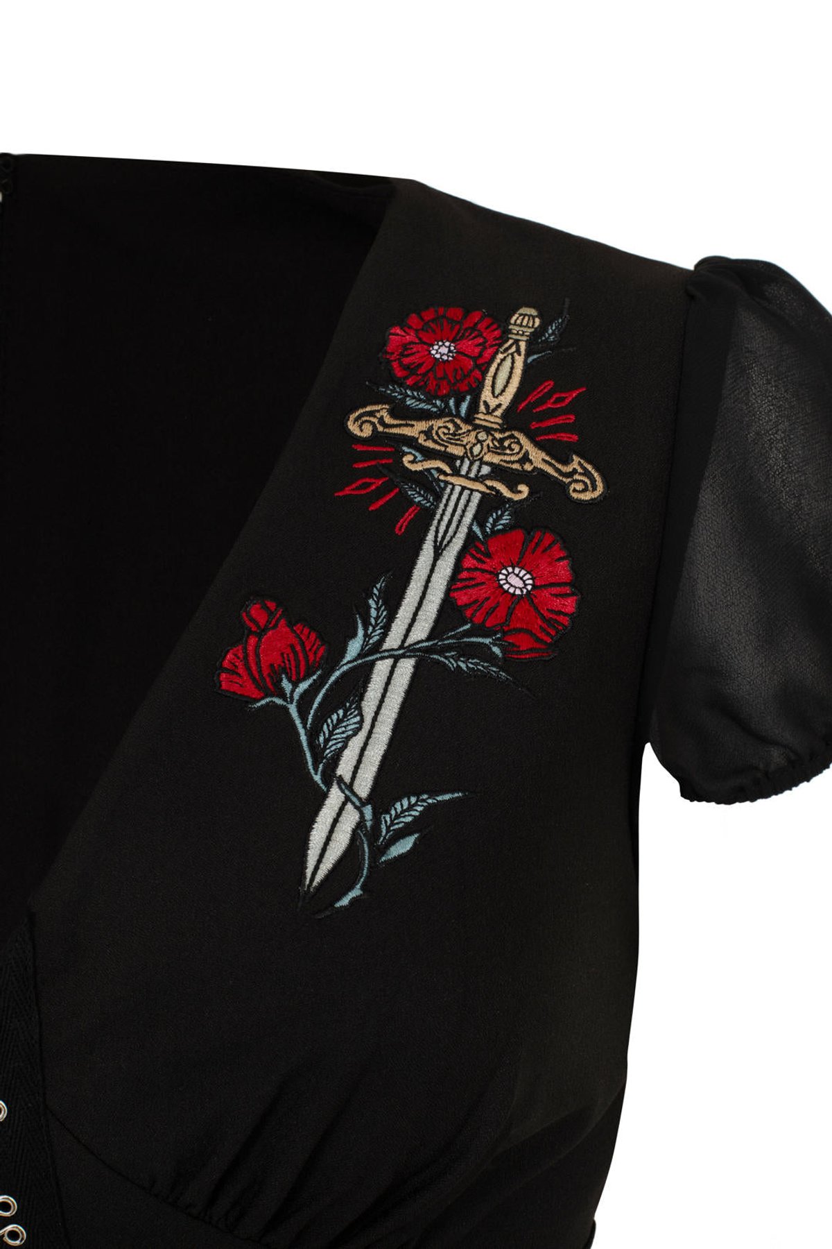 With a deep V neckline with hook and eye details, this piece adds a touch of intrigue, while the short puff chiffon sleeves with elasticated cuffs contribute a playful twist. The dress is further adorned with striking sword and floral embroidery, making it anything but ordinary! 👑🌹