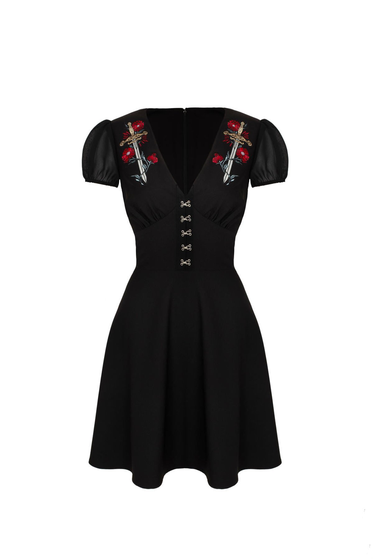 Unleash your inner siren with the Elyse Dress—a purrfect fusion of vintage glamour and dark allure. Its sleek black silhouette, accented with bold floral embroidery and striking sword details, makes a claws-down gorgeous statement. The fitted underbust waist and flared skirt evoke a timeless rockabilly vibe, while the deep V neckline hints at just a touch of mischief. Short puff chiffon sleeves add a playful touch that’s impossible to ignore. Whether you’re feeling fierce or flirtatious, this dress is designed to turn heads and spark curiosity.