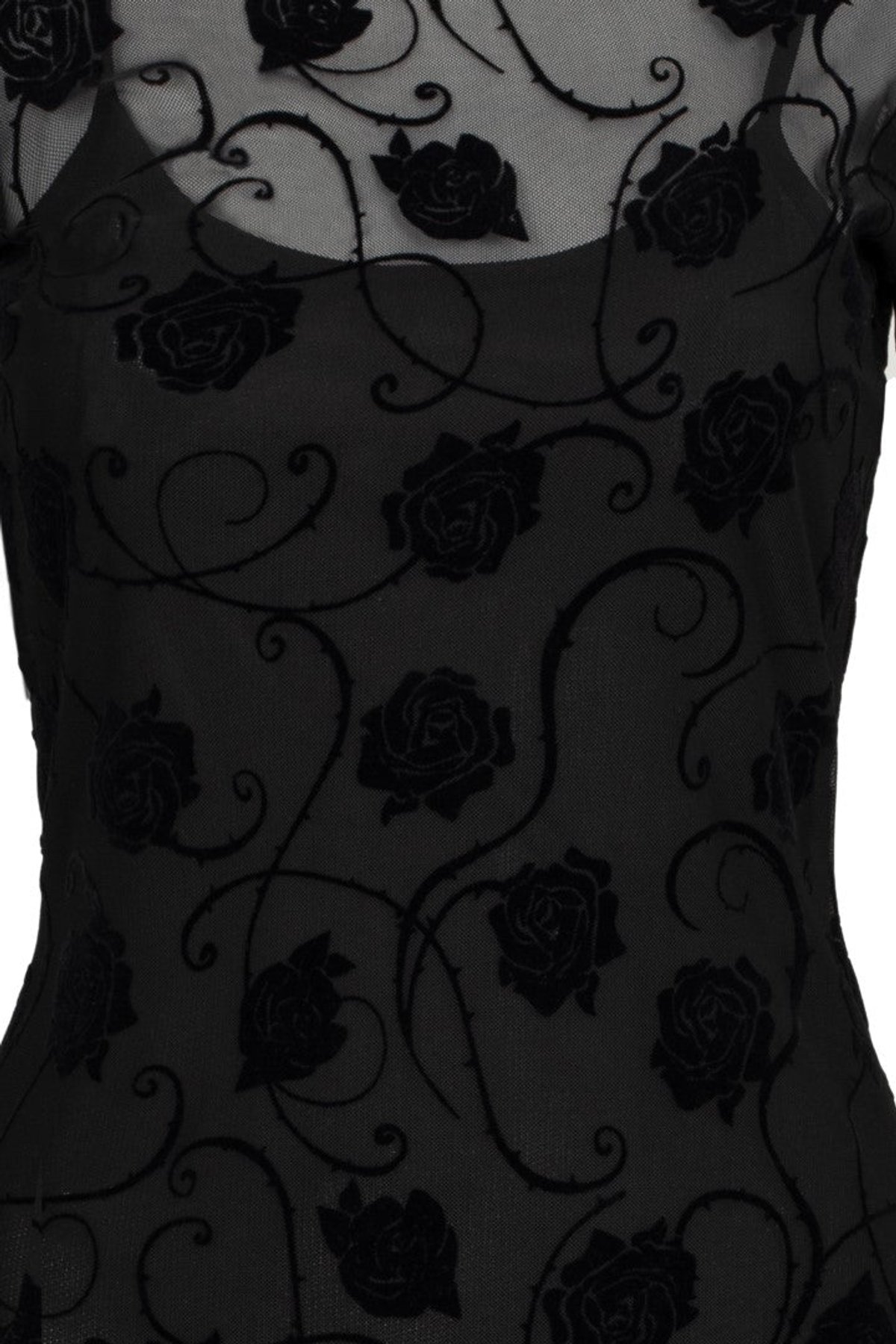 🥀🖤 Step into an enthralling gothic fairytale with the exquisite Gothic Florence Dress. This dreamy number dances on the edge of drama and elegance, flaunting a mesmerising floral pattern on black velvet flocking. Witness the intricate story of roses and vines unravel on a stretch mesh canvas – it’s not just a dress, it’s a testament to gothic glamour. 👗🍷
