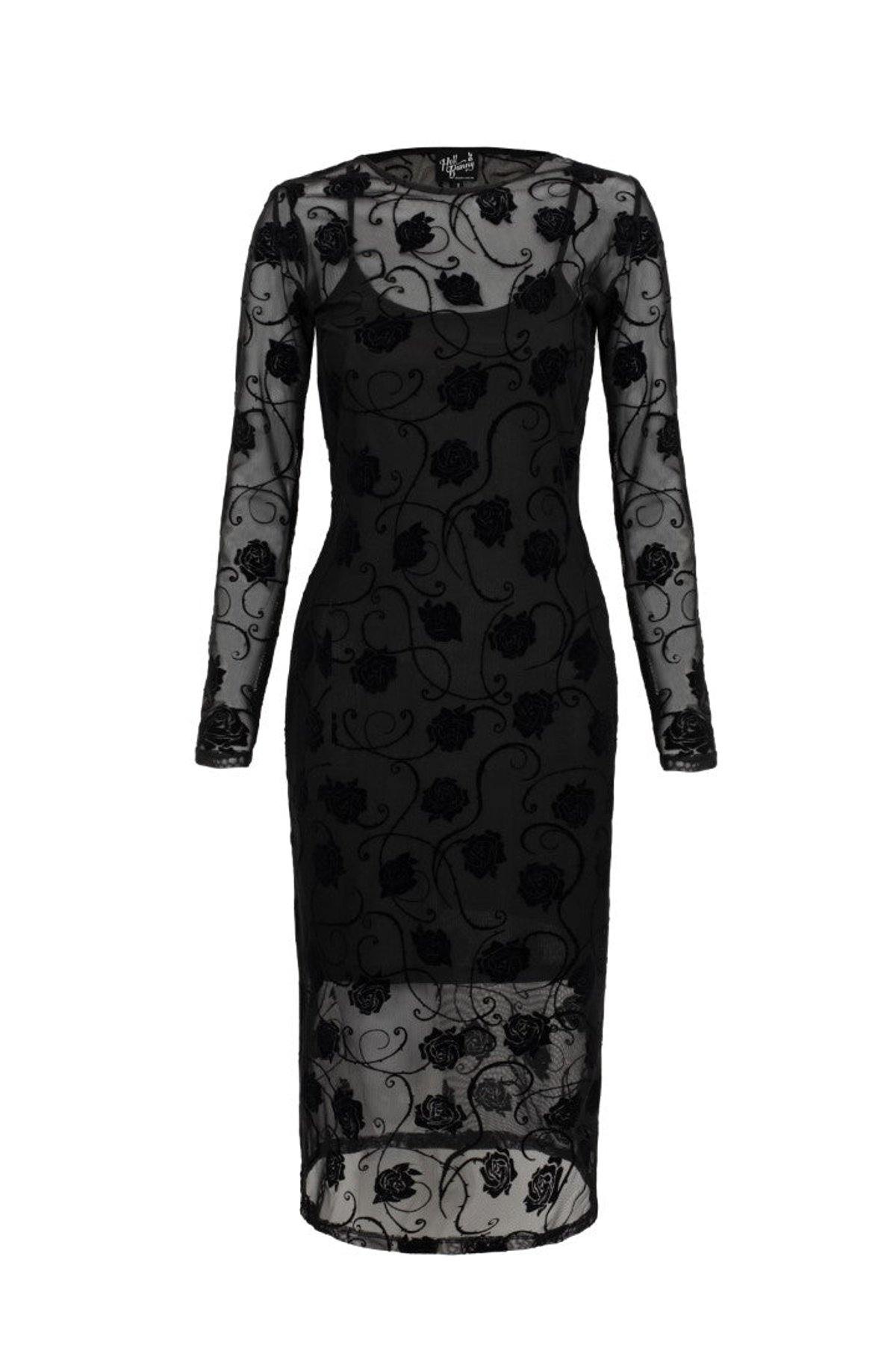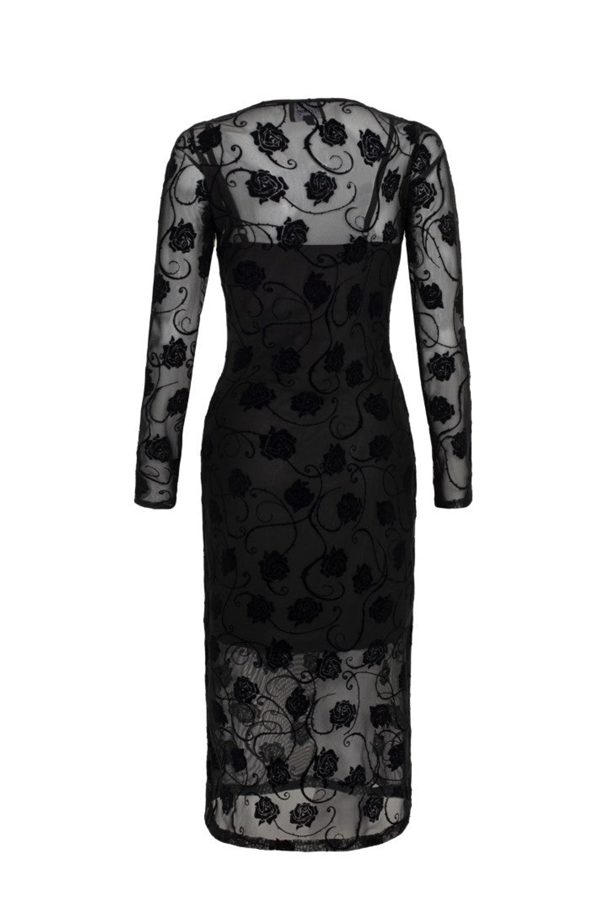 Unleash your inner enchantress with the Florence Dress—an ode to gothic glamour that’s as alluring as it is sophisticated. With its intricate floral velvet flocking and stretch mesh canvas, this dress strikes the perfect balance between dark romance and modern chic. The full-length sleeves add a touch of drama, while the adjustable spaghetti straps ensure a fit as flawless as your mysterious charm. Whether you're channeling moody elegance or embracing your playful side, this dress is your perfect partner in crime.