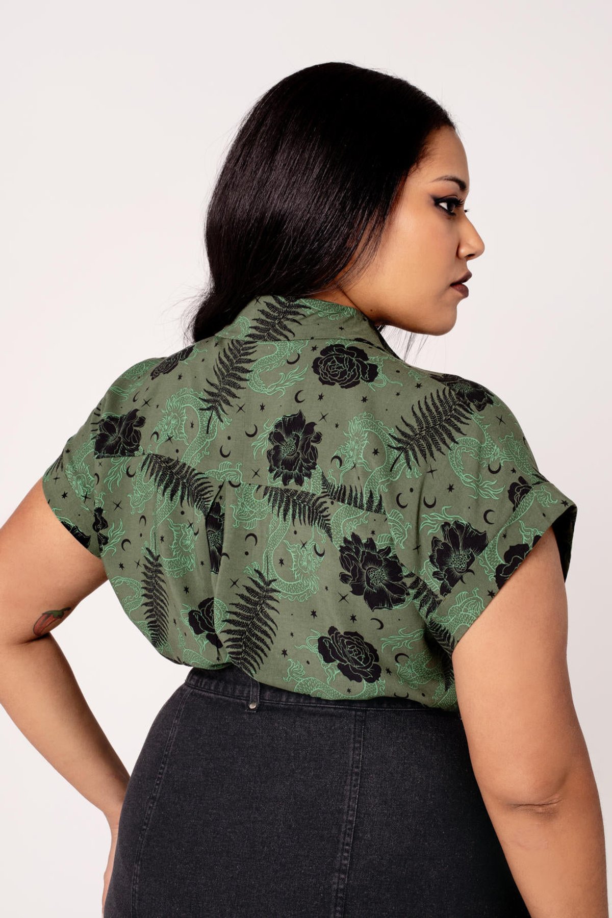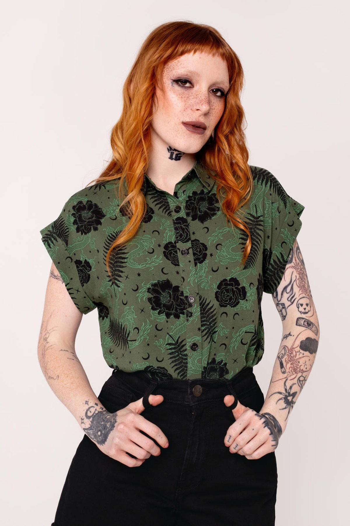 Unleash your inner enchantress or dashing rogue with the Georgia Shirt, a bewitching blend of gothic charm and effortless style. Its lush floral and fern print in deep green and black whispers secrets of mystic forests, while the relaxed fit and playful rolled-up sleeves keep your look both relaxed and irresistibly stylish. The pointed stand-up collar and button-up front lend a touch of refined allure, making this shirt as versatile as it is spellbinding. Crafted from silky-soft viscose, it drapes like a whisper of magic, ensuring you stay comfortably chic from dawn till dusk. Whether you’re conjuring a casual daytime vibe or casting a spell for a night out, this piece promises to turn heads and ignite imaginations.
