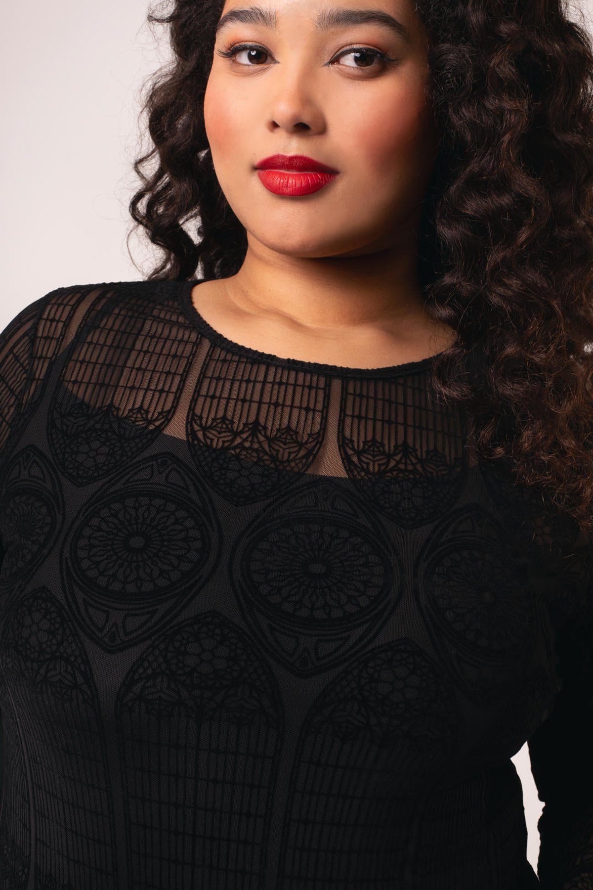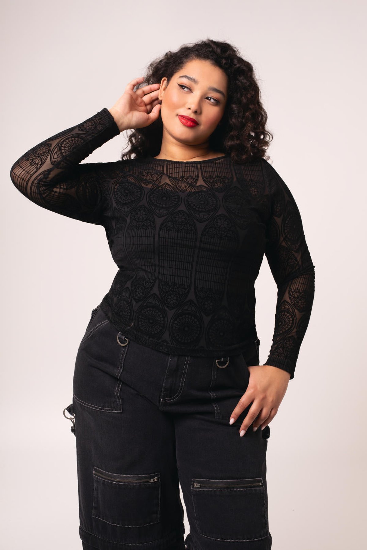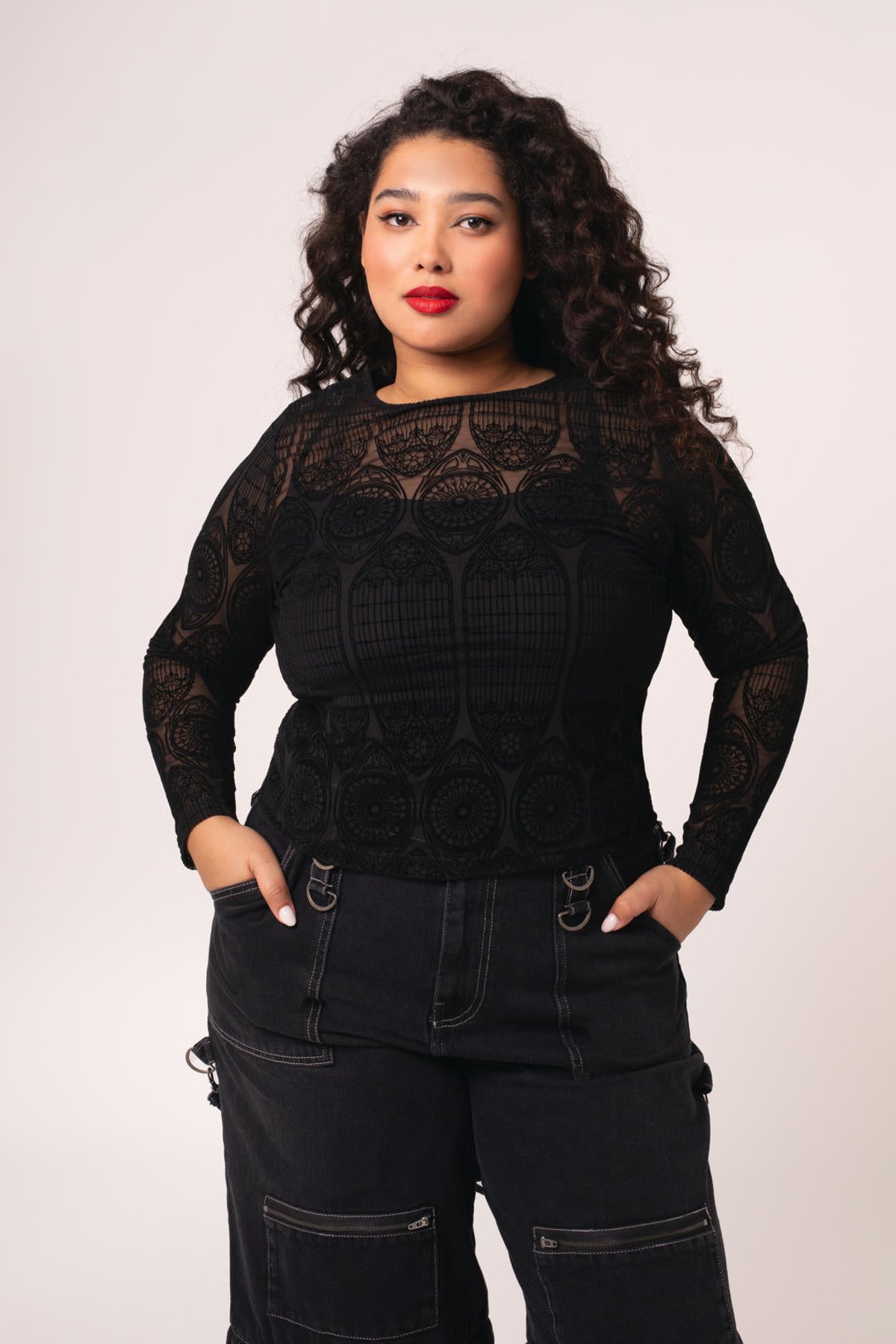 Unleash your inner enchantress with the Mea Culpa Top—where dark elegance meets a hint of daring. Its geometric lace design is a purrfect blend of gothic allure and modern sophistication, ensuring you turn heads wherever you go. The full-length sleeves and hip-length hem create a silhouette that’s both sleek and mysteriously captivating, while the velvet flocking offers a subtle, architectural charm that’s truly claws-down gorgeous. Made from a stretchy blend, this top provides a comfortable yet cling-worthy fit that celebrates your curves with feline finesse.