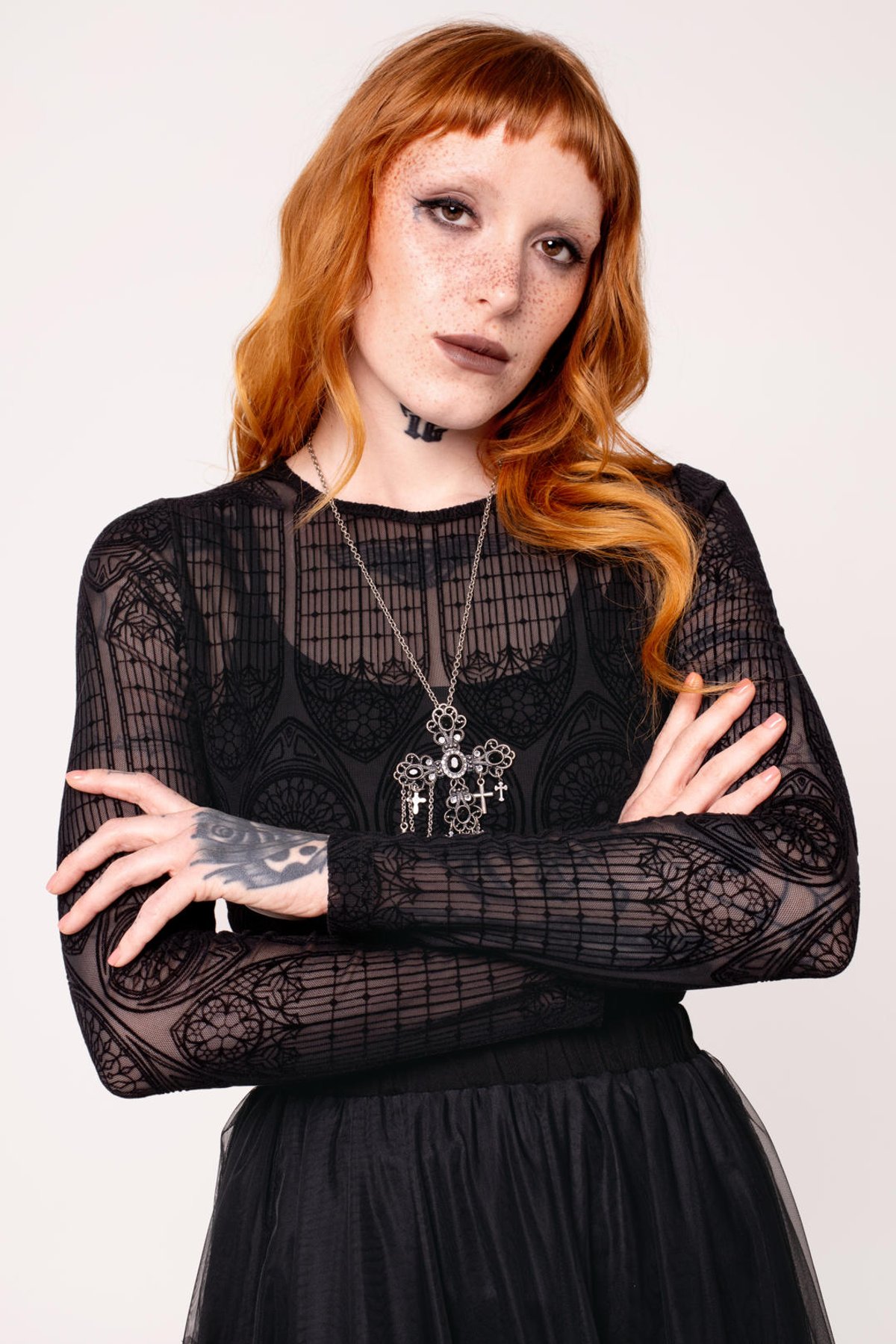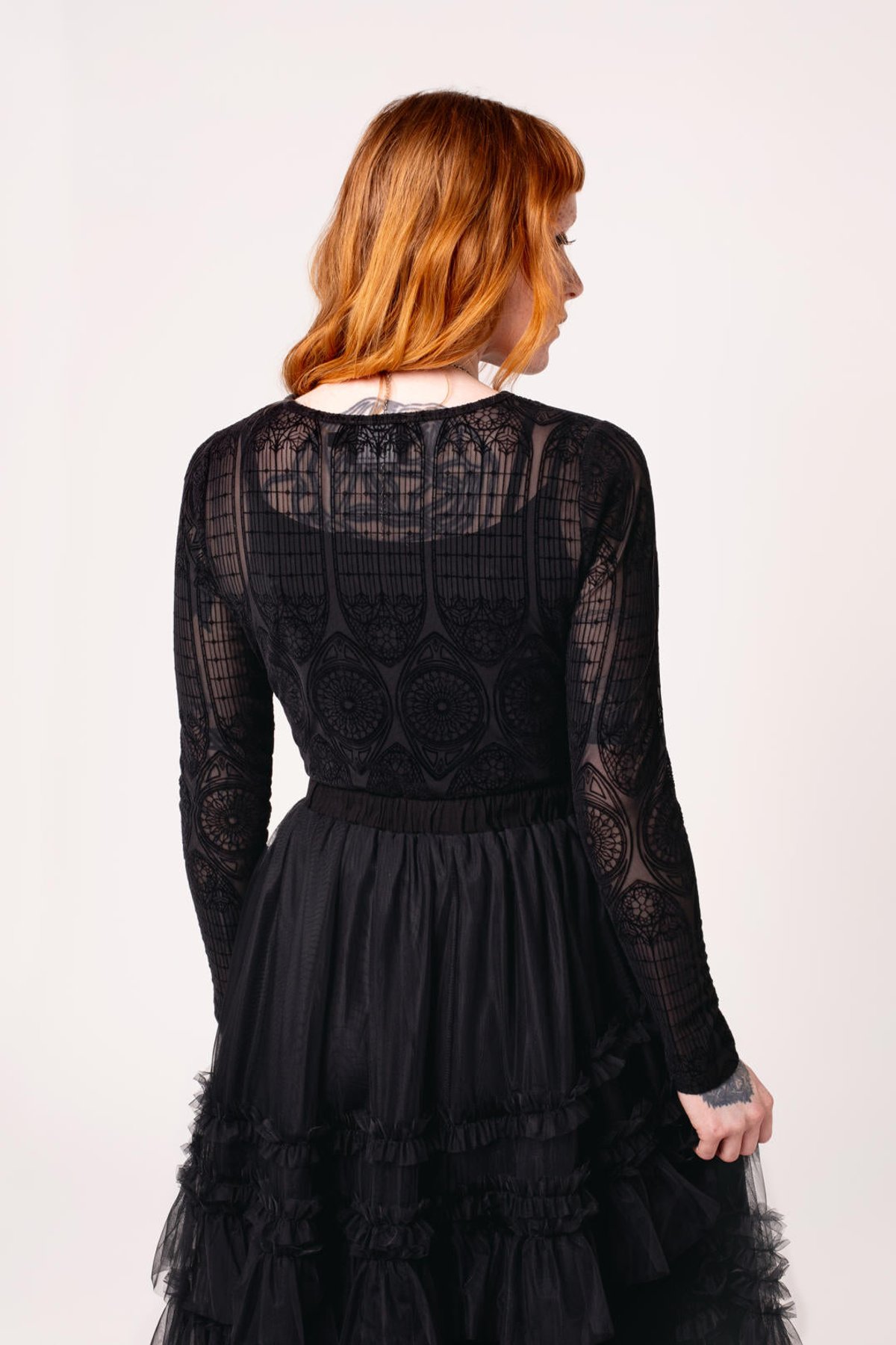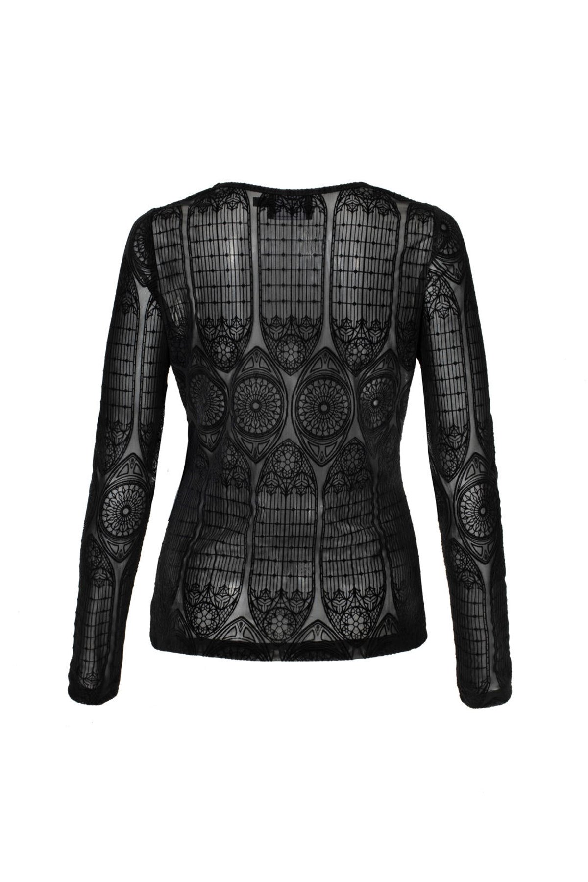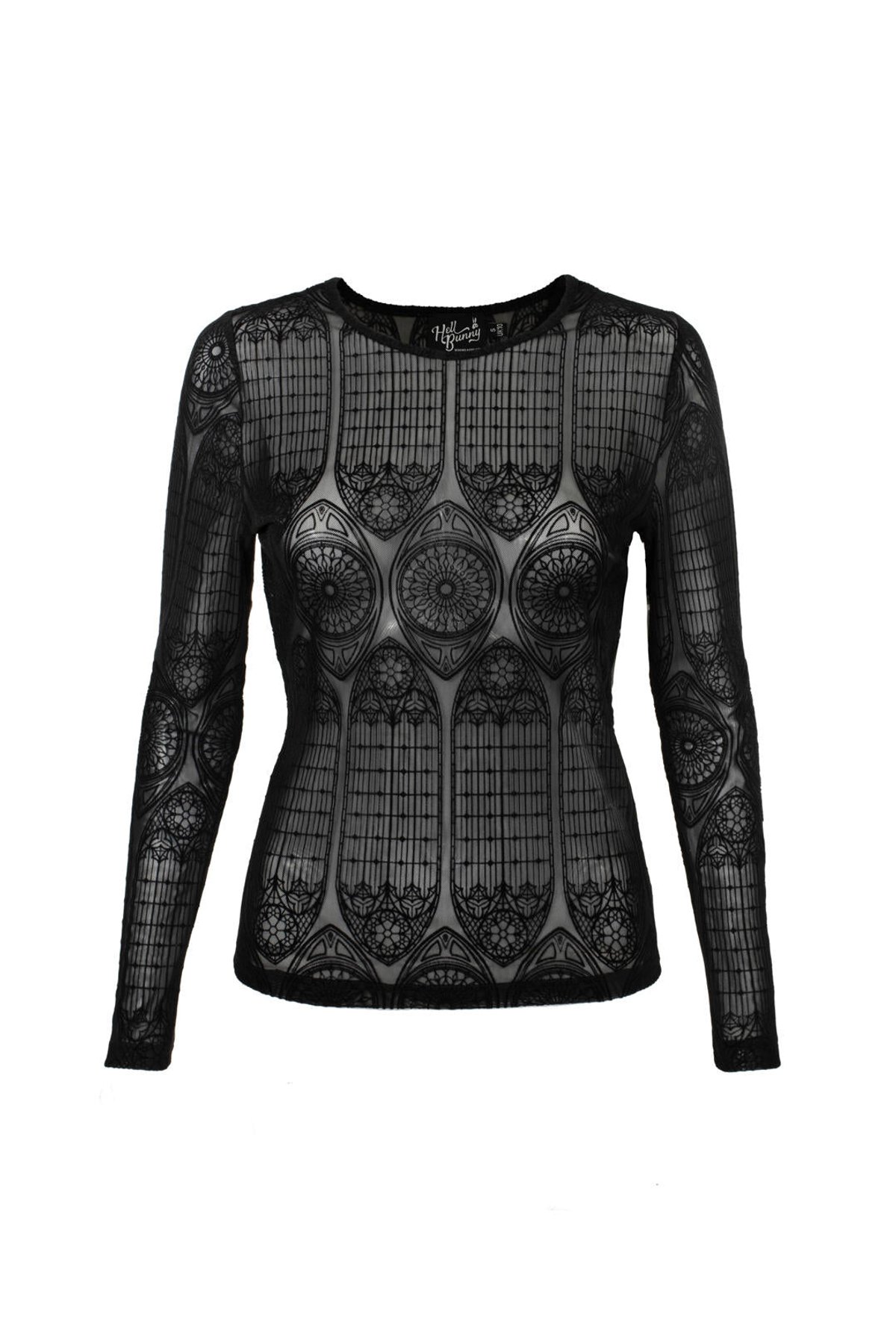 Unleash your inner enchantress with the Mea Culpa Top—where dark elegance meets a hint of daring. Its geometric lace design is a purrfect blend of gothic allure and modern sophistication, ensuring you turn heads wherever you go. The full-length sleeves and hip-length hem create a silhouette that’s both sleek and mysteriously captivating, while the velvet flocking offers a subtle, architectural charm that’s truly claws-down gorgeous. Made from a stretchy blend, this top provides a comfortable yet cling-worthy fit that celebrates your curves with feline finesse.