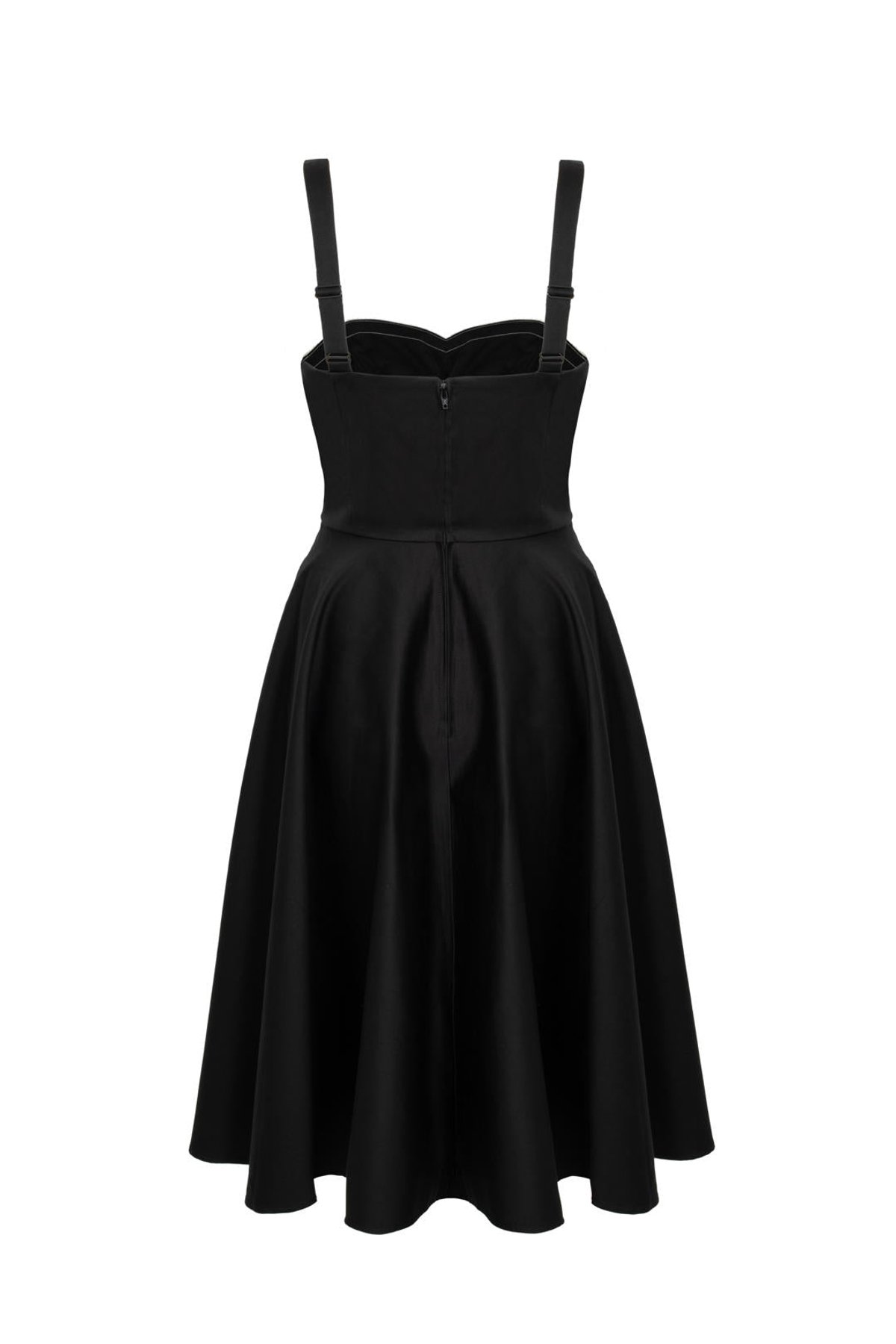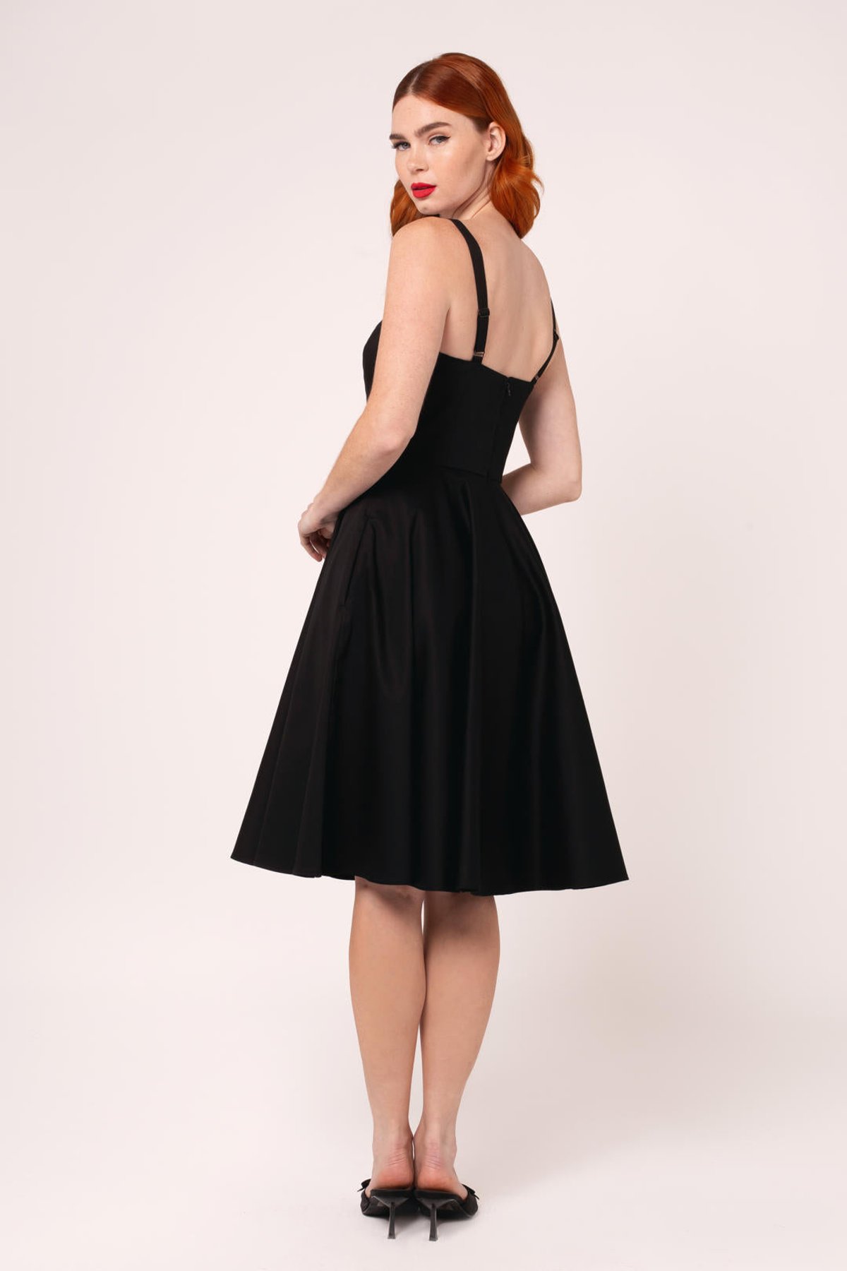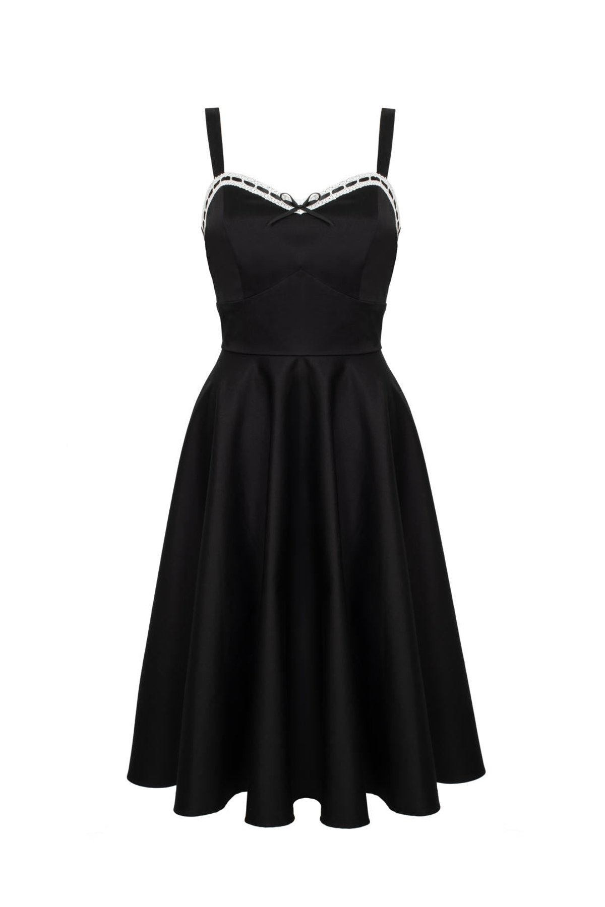 Unleash your inner vintage vixen with the Gracie Midi Dress—where 1950s charm meets modern allure. The sleek black fabric, accented with delicate white lace and a coquettish bow, sets a purrfect scene for a sophisticated yet playful look. The sweetheart neckline hints at timeless romance, while the flared skirt invites effortless twirls that will make you claws-down gorgeous. Designed with a fit that flatters every curve, the adjustable straps and stretchy fabric ensure you stay comfortable and chic from dawn till dusk. Whether you're sashaying into a soirée or dazzling at a garden party, this dress is your purr-fect partner in crime for turning heads.