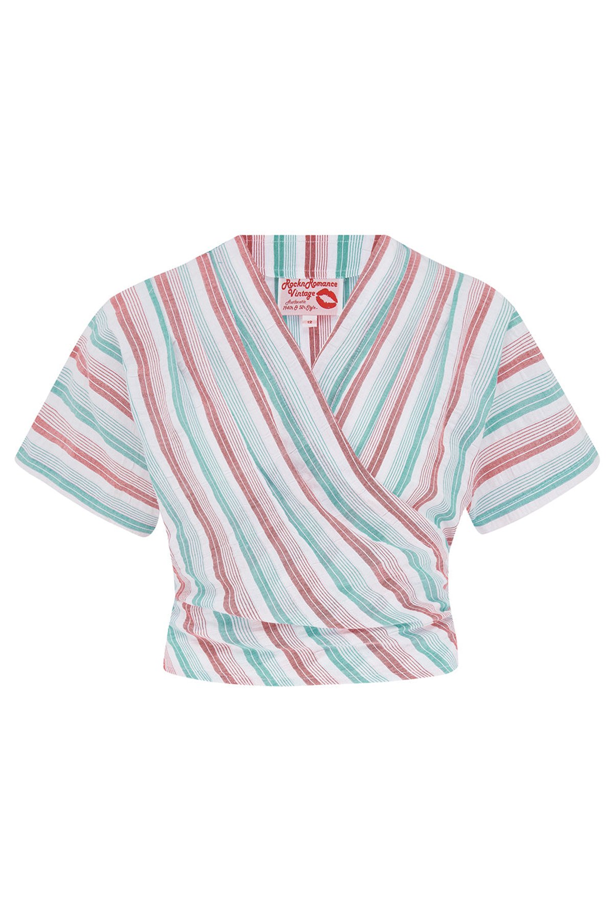 The Darla Short Sleeve Wrap Blouse in Green & Red Stripe 100% Cotton Seersucker