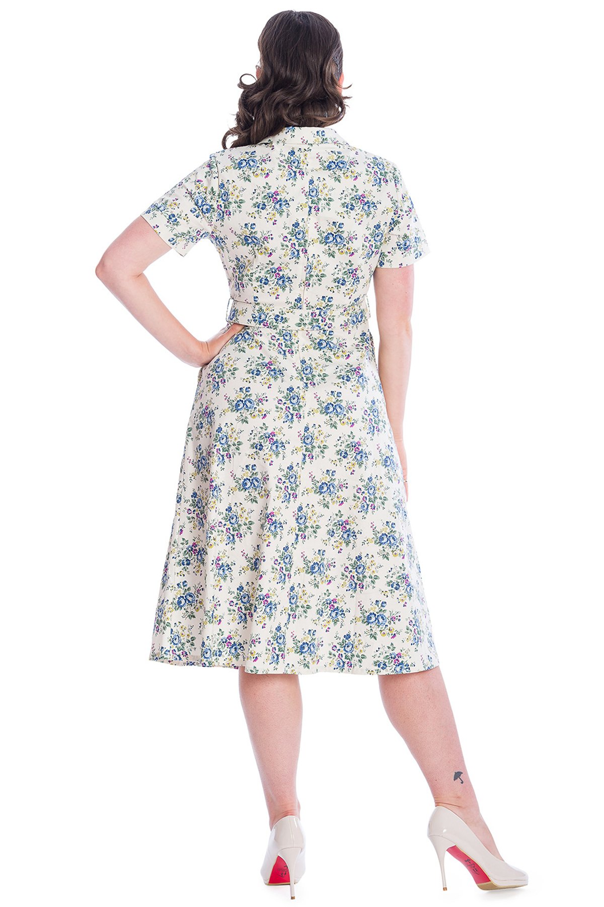 Unleash your inner vintage vixen with our Green Wild Flower Fit & Flare Dress—where timeless charm meets a playful botanical twist. This enchanting piece boasts a lush green hue adorned with delicate white and blue wildflowers, making it a purrfect choice for those who love to blossom in style. The classic fit and flare silhouette is designed to flatter your curves while giving a nod to retro elegance, all wrapped up in a fabric that feels just as dreamy as it looks.