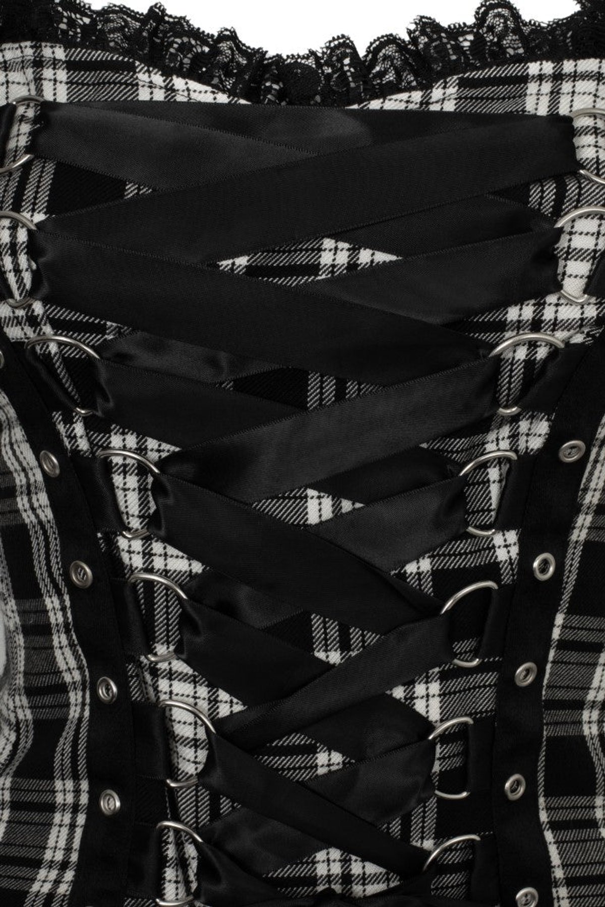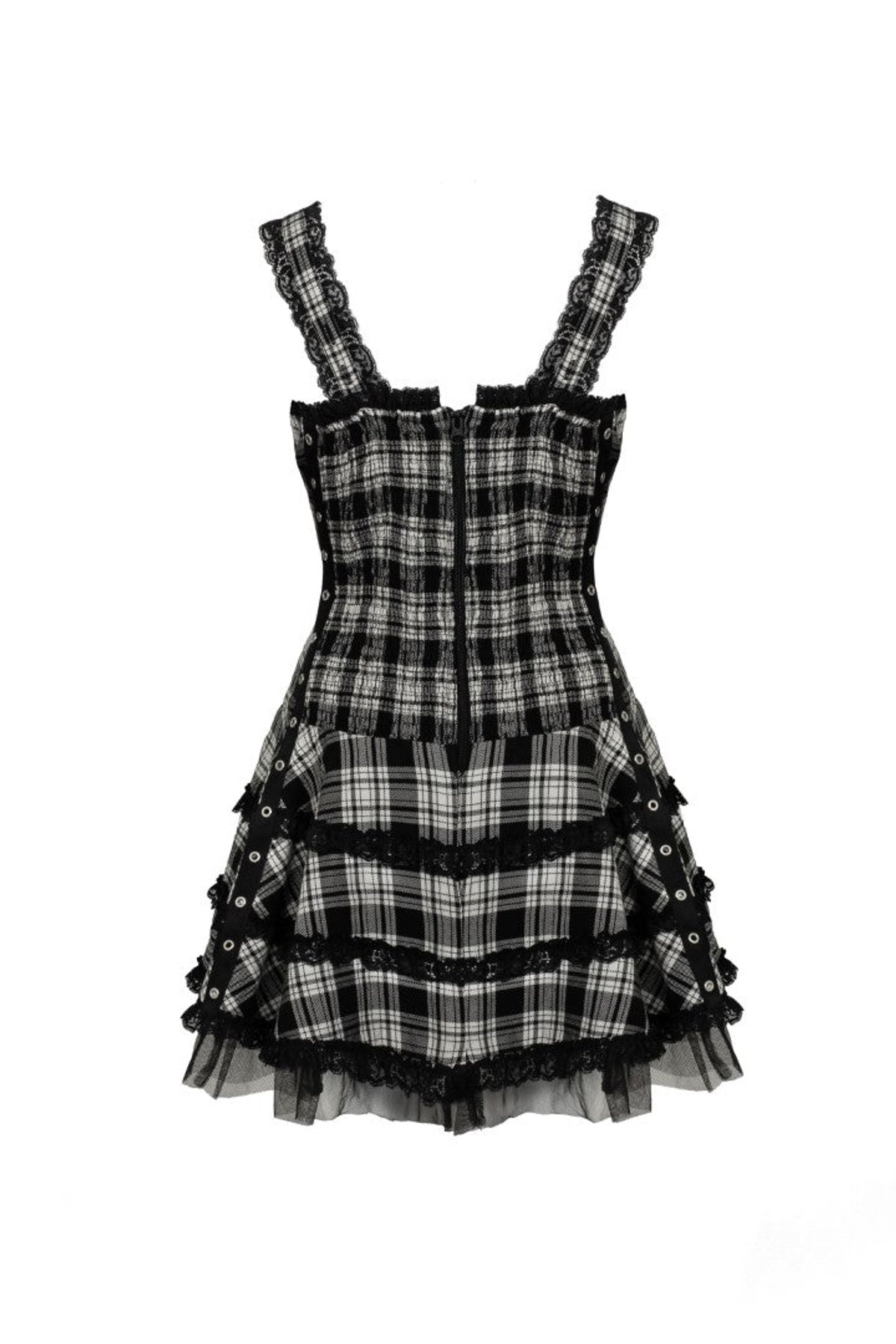 Unleash your inner rebel with our Harley Tartan Dress—where classic monochrome tartan meets daring, punk-inspired flair. The striking black-and-white pattern commands attention, while the corset-style lace-up front adds just the right amount of sass. With its layered three-tiered skirt and delicate black lace trims adorning the straps, neckline, and hem, this dress is a purrfect choice for those who love to stand out with a hint of mischief. Designed with a clever mix of stretch and structure, it offers both comfort and attitude, ensuring you'll feel as fierce as you look.