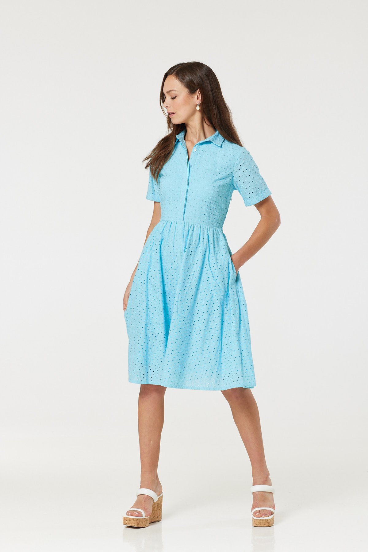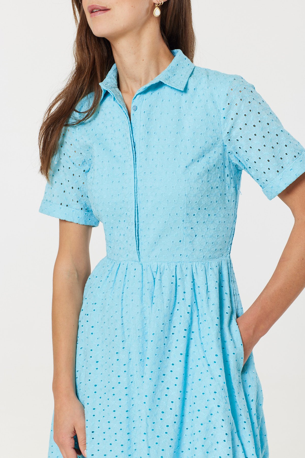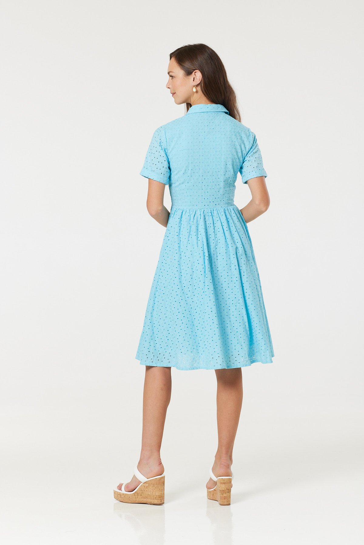 Step into the purrfect blend of vintage charm and fresh style with our Harlow Sky Blue Dress. Its eyelet fabric and classic collar evoke a 1950s dream, while the sky blue hue adds a breezy, modern touch. Designed to flatter, its cinched waist and side zipper create a silhouette that's as alluring as a kitten’s curious gaze. Whether you’re dressing up or down, this dress effortlessly transitions from brunch dates to garden parties, all while keeping your look paws-itively chic and utterly timeless.