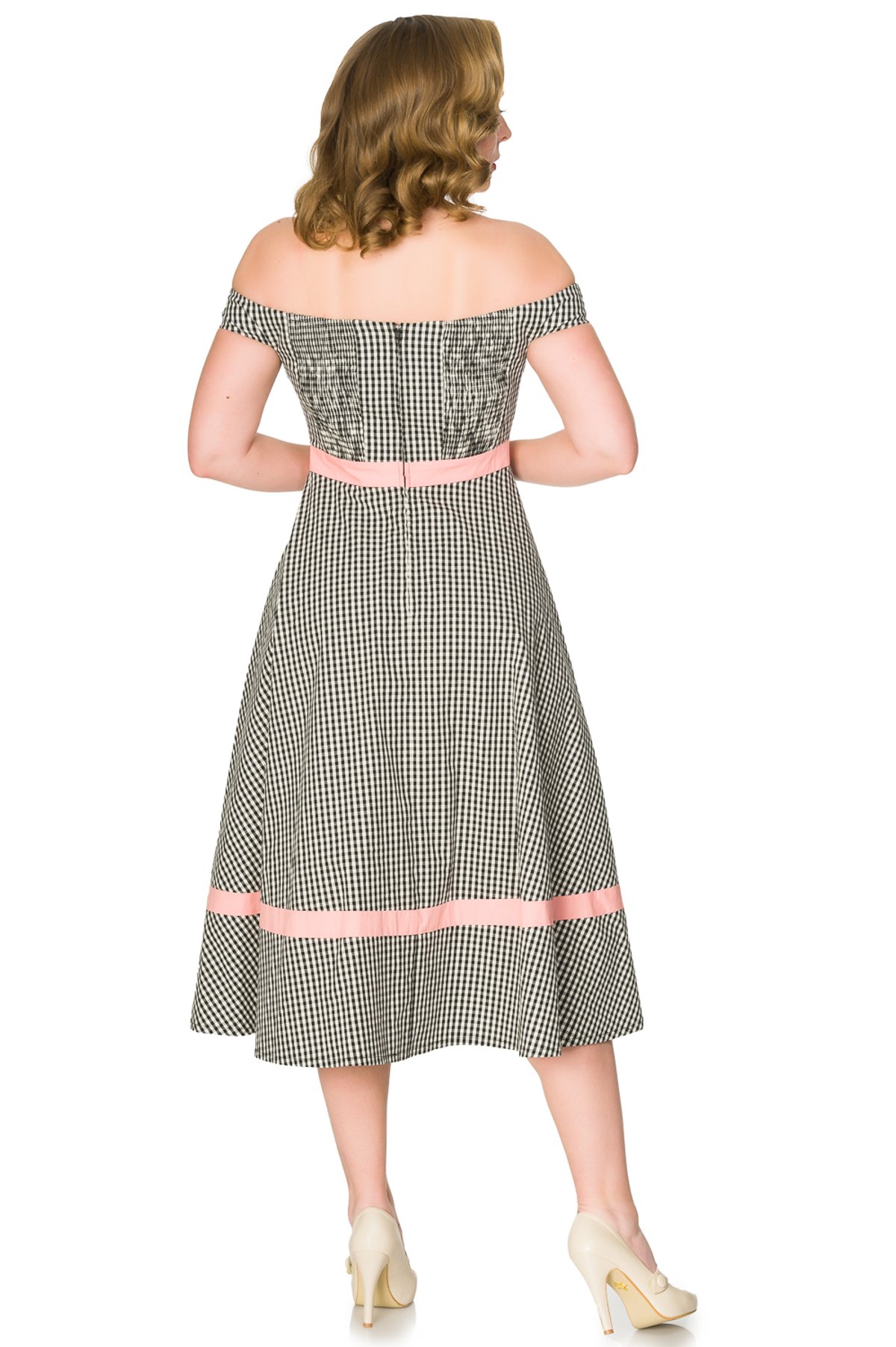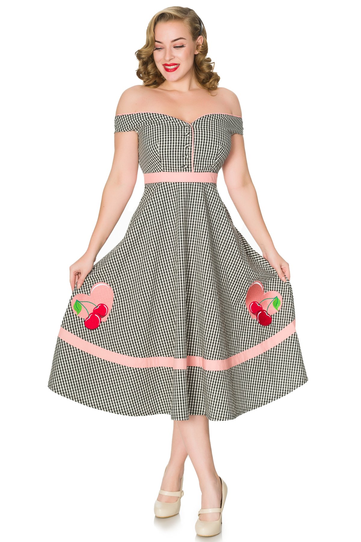 Purrfectly playful and undeniably charming, the Heartbreaker Swing Dress is your new secret weapon for turning heads and stealing hearts. Its classic black and white gingham pattern, complemented by adorable pink piping and embroidered cherries, channels vintage 1950s rockabilly glam with a modern twist. The off-shoulder neckline and flirty faux bow detail at the waist add a touch of flirtation, while the swing silhouette offers comfort and style in one delightful package. With its playful design and impeccable fit, this dress is a true statement piece that radiates confidence and charm—claws-down gorgeous in every way.