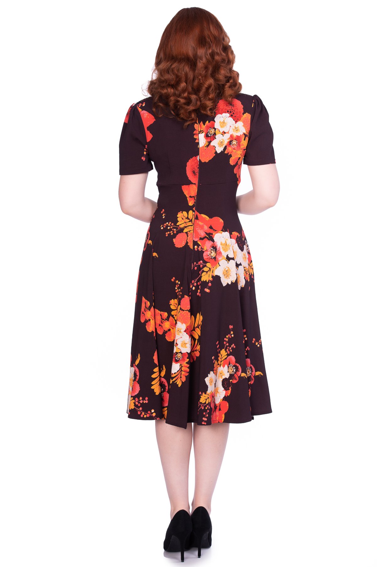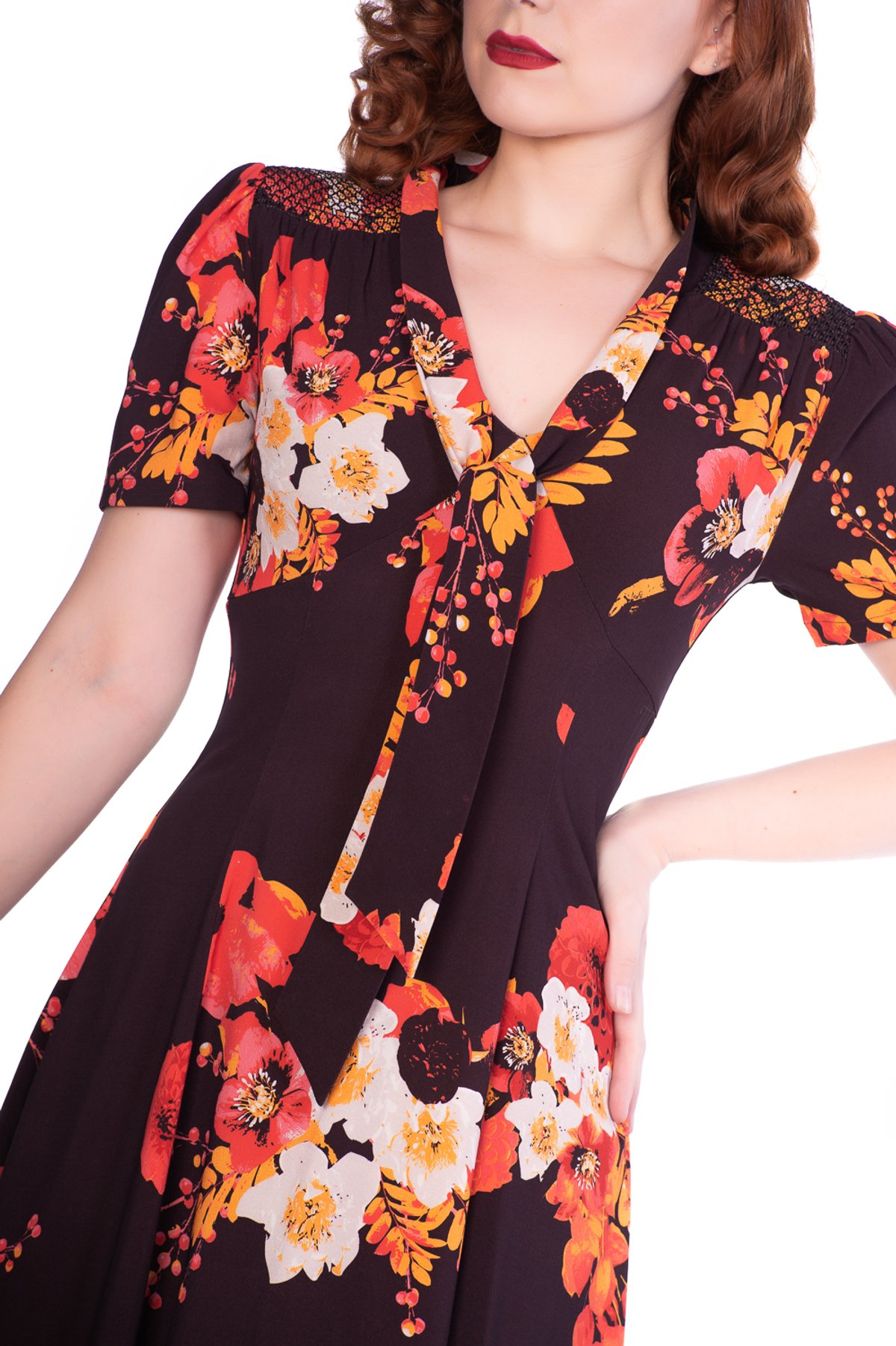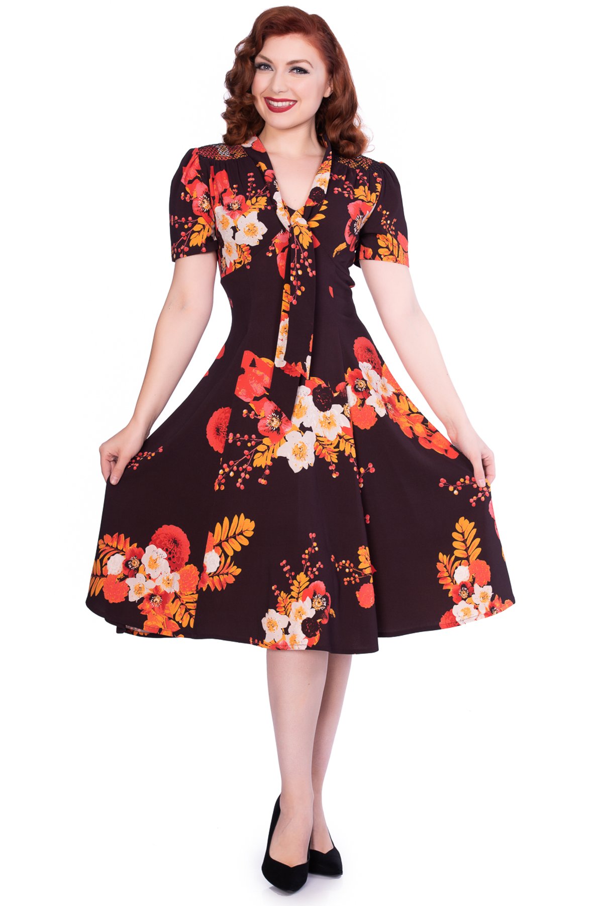 💃 Fall vintage-chic in love with our Izzy Burgundy Dress from Kitty Darling’s UK boutique. This 1940s inspired dress captures elegance, sophistication, and fun all in one! The rich, deep burgundy color mingles with a vibrant orange floral print, set off by an adjustable neck tie and a charming high V-neck. 💕