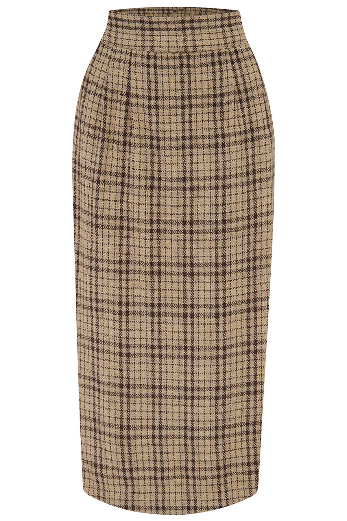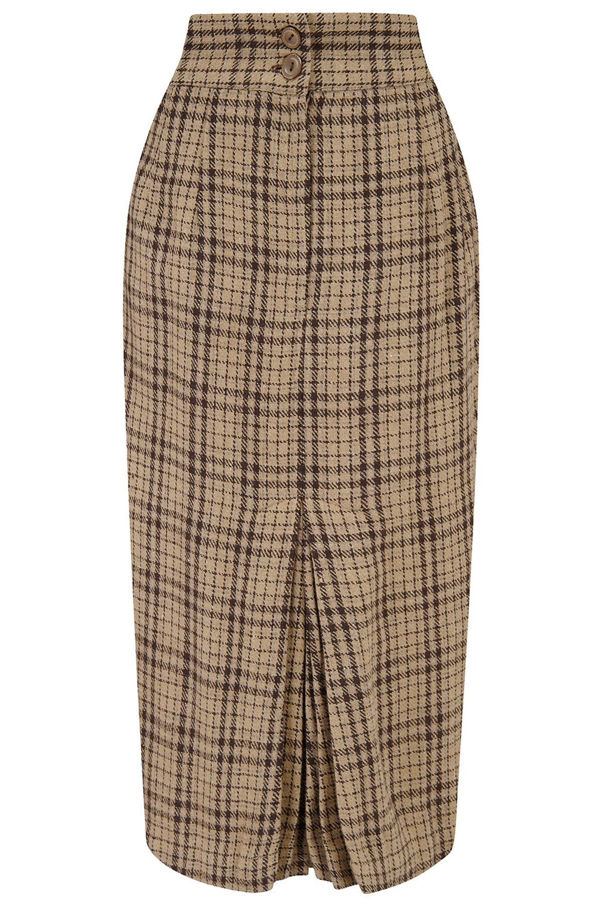 RnR Luxe Range Jitterbug Pencil Skirt with Kick-Pleat in Brown Check 100% Wool (Wool No.1)