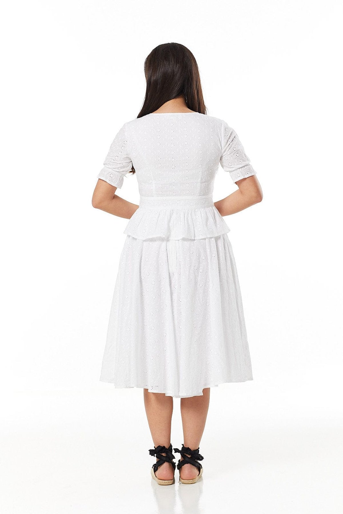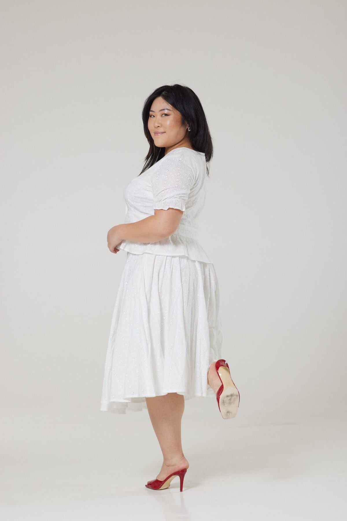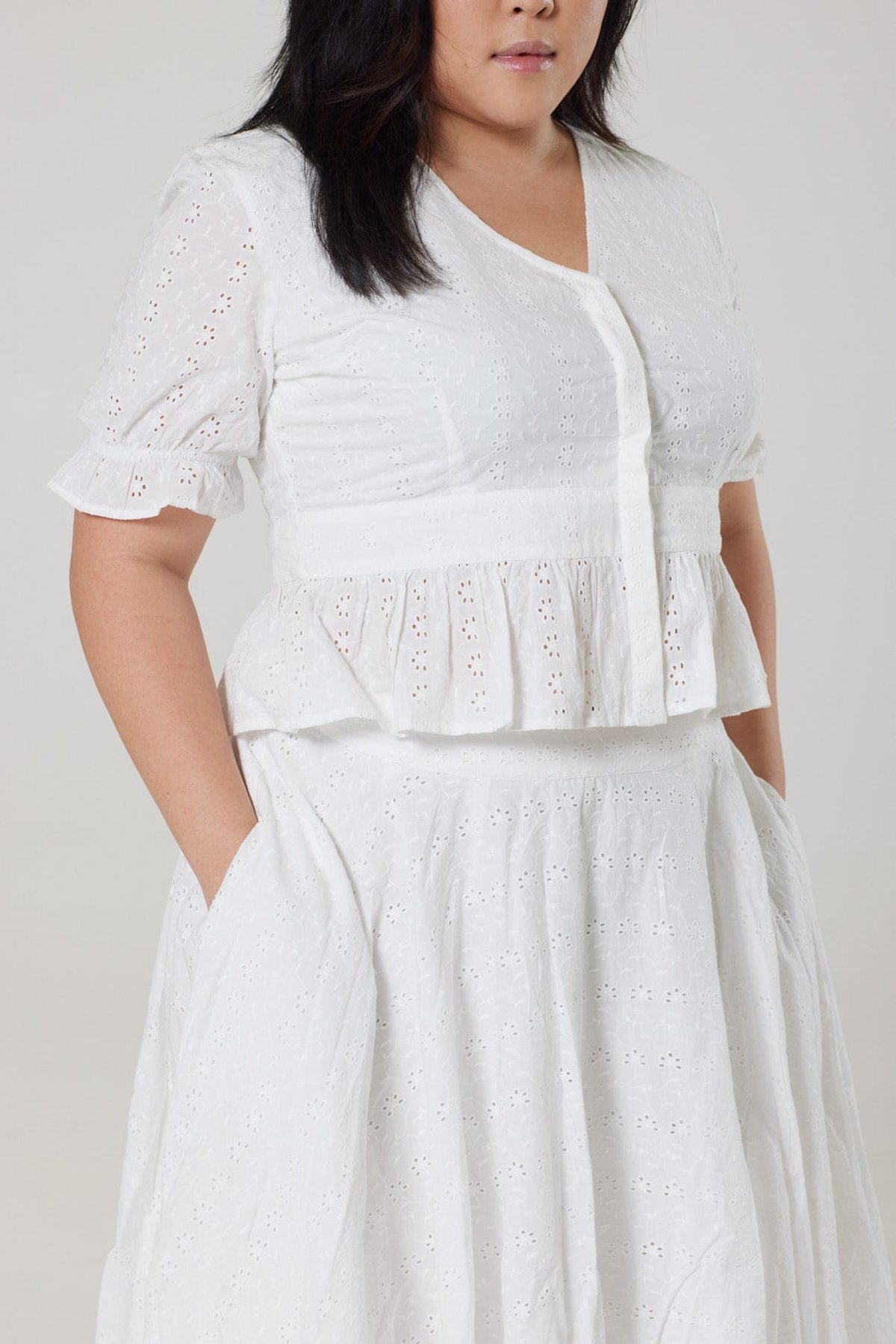 Unleash your inner vintage vixen with our Jolene White Blouse—a true purrfect blend of playful charm and sophisticated elegance. Crafted from delicate Broderie Anglaise, this blouse is all about subtle flirtation, thanks to its eyelet pattern that offers a teasing glimpse of skin. The puff sleeves and V-neckline add a touch of retro glamour, while the elasticated cuffs and peplum hem give it a cheeky twist that’s impossible to ignore. Whether you’re channeling 1950s chic or creating modern-meets-vintage magic, Jolene is a feline-tastic choice that will have you paws-itively glowing.