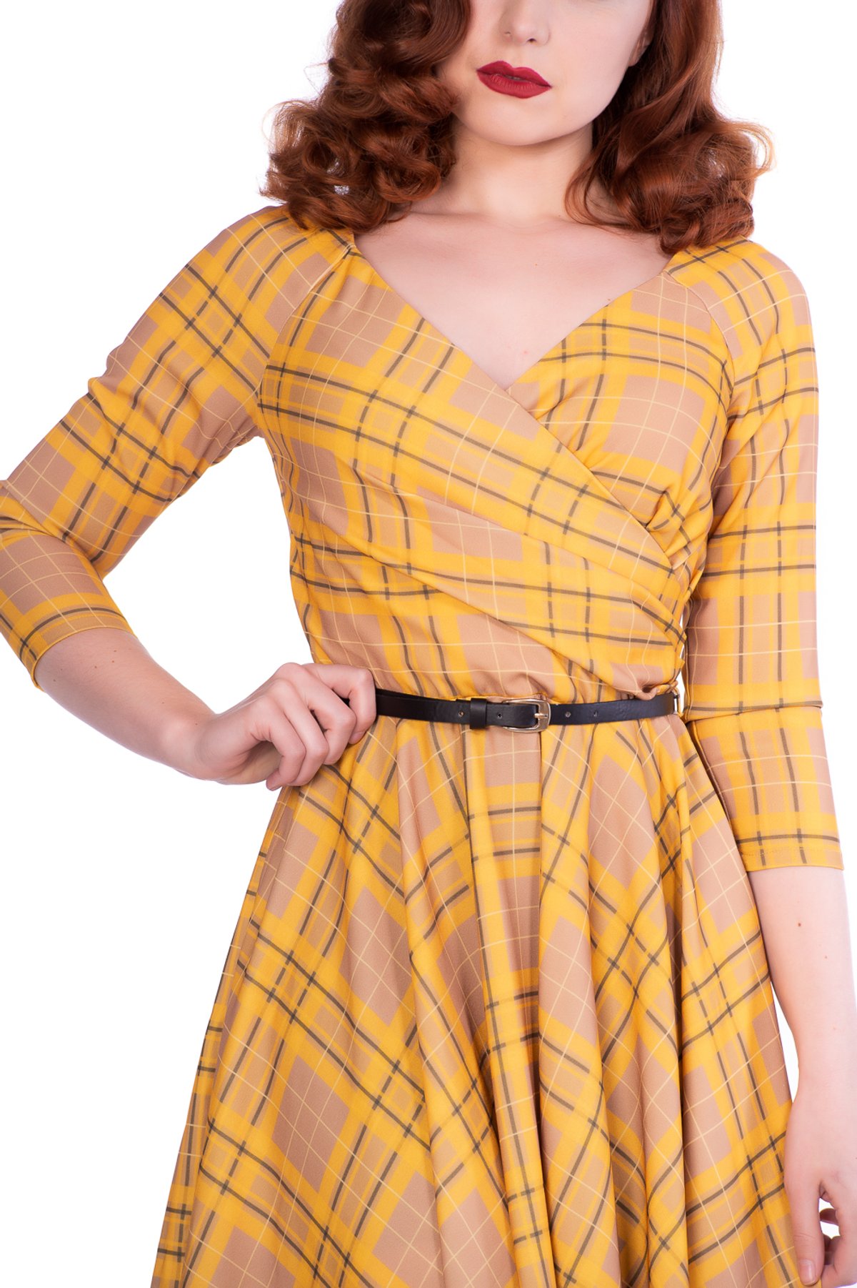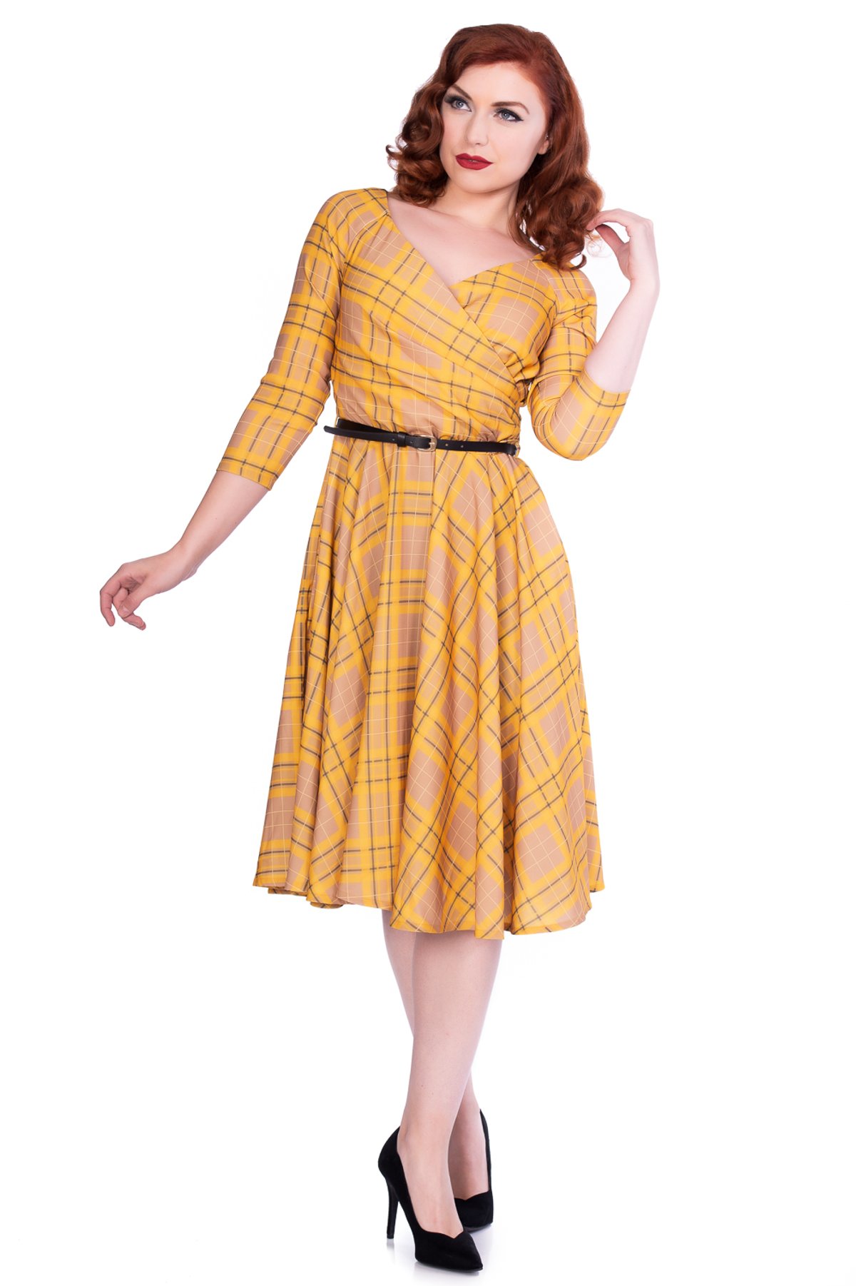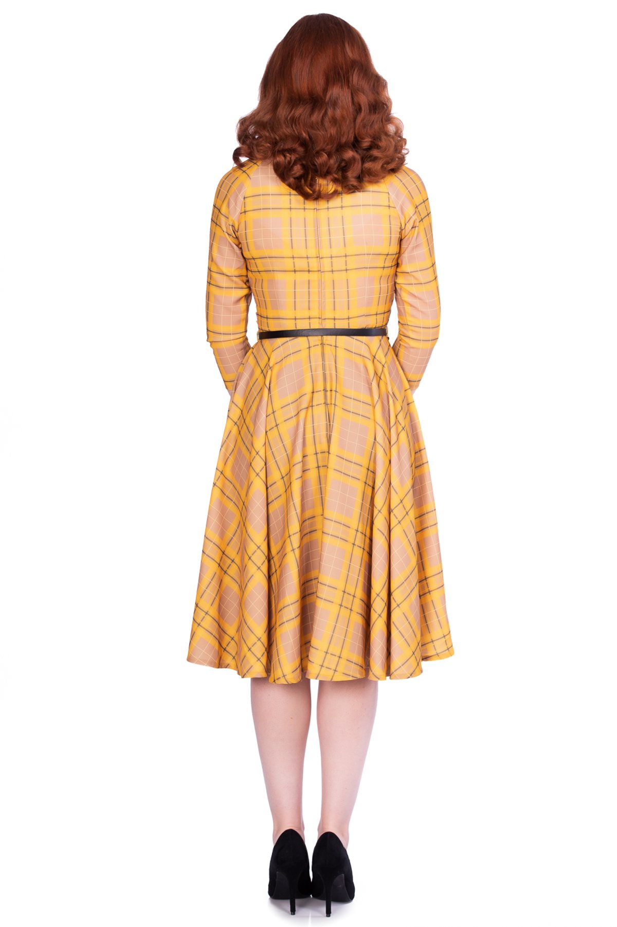 Get ready to purr with delight! The Kacee Swing Dress is a true showstopper, blending vintage charm with a playful twist. Its vibrant yellow and black plaid pattern dances with retro flair, while the swing silhouette offers a flirty, flattering fit that’s oh-so-easy to wear. Crafted from a comfy stretch blend, this dress moves with you, whether you're twirling around a sunlit courtyard or sashaying through city streets. Its timeless design isn’t just a nod to the fabulous 50s—it’s a purrfect way to showcase your style smarts with a hint of mischief.