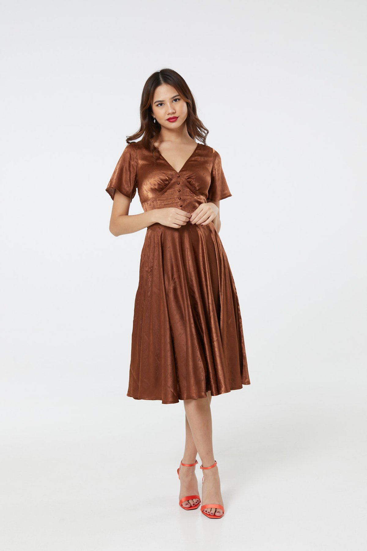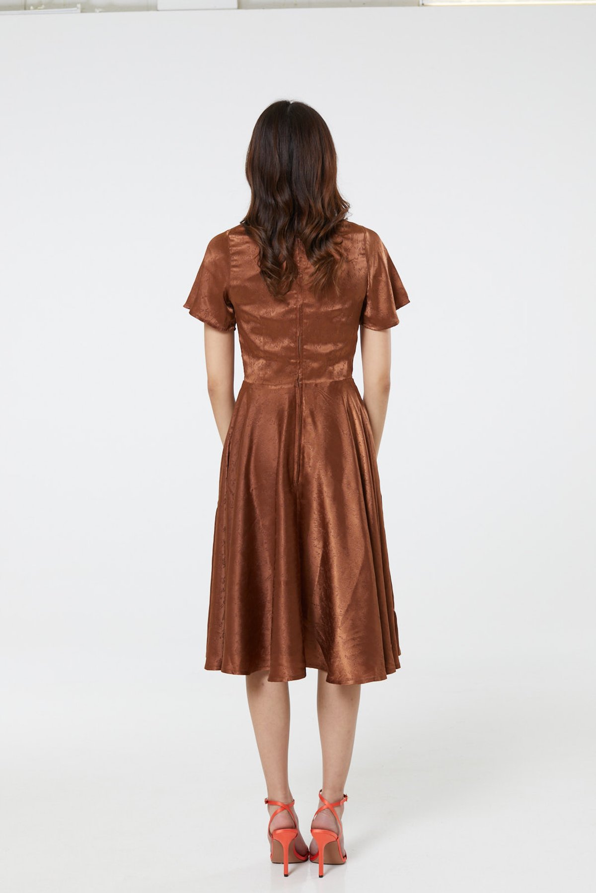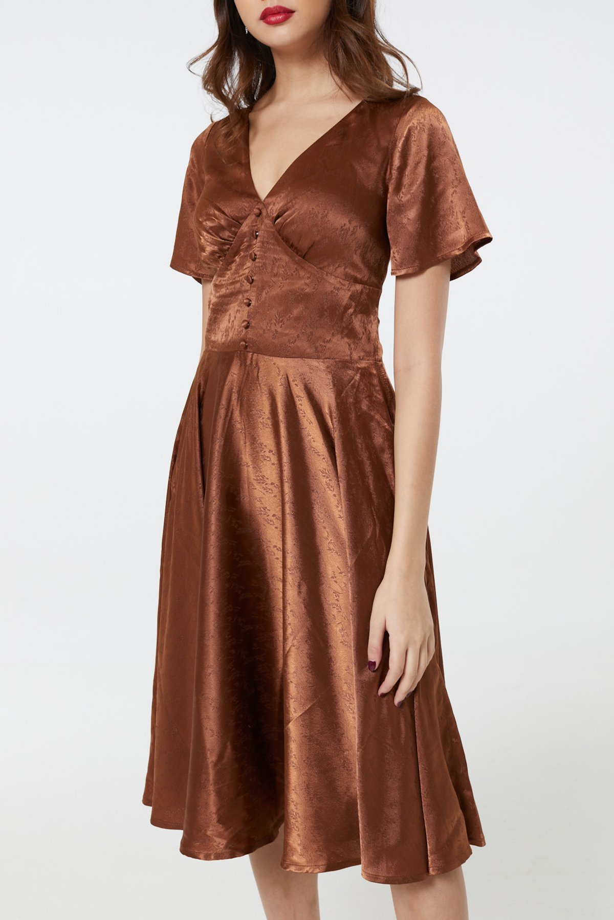 💃🏽Dive into a world of grace with our Kaylee Brown Dress in recycled fabric! Reflecting the effortless elegance of 1950s fashion, the floral embossed jacquard alone is enough to turn heads. This vintage-inspired beauty showcases a flattering V-neck accented by faux buttons and charming short sleeves👗. A classic nod to retro style is in the knee-length flared skirt, adding a dash of versatility to your wardrobe 👠.