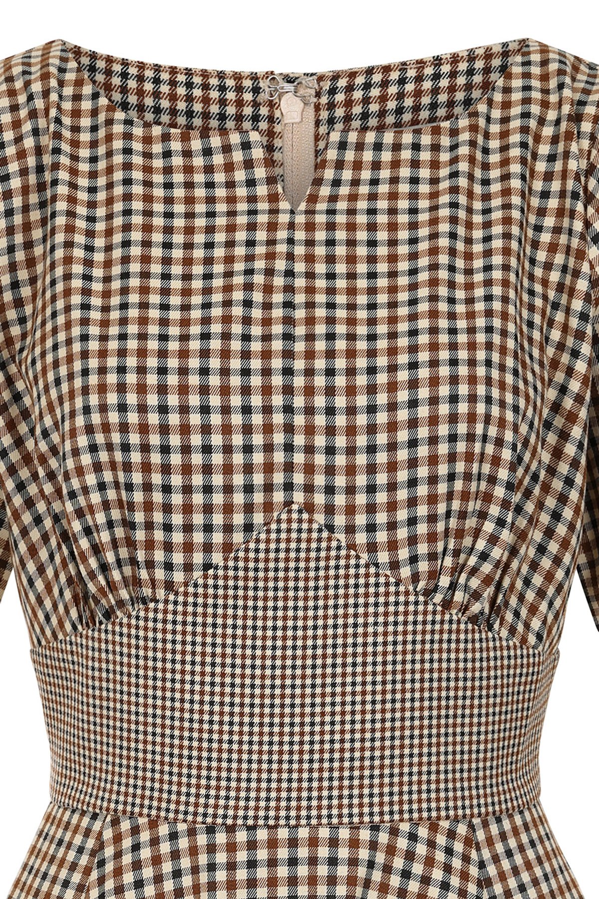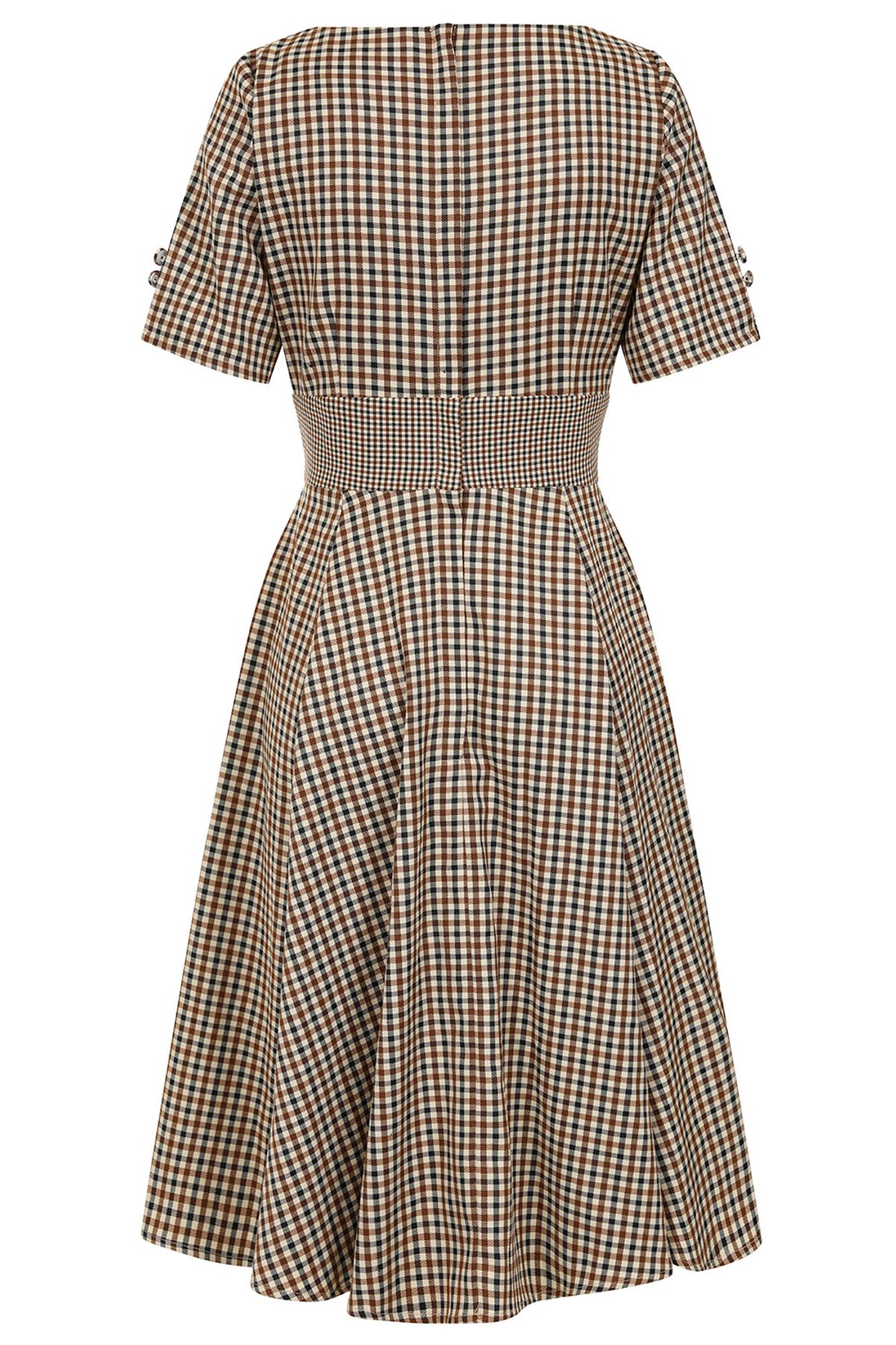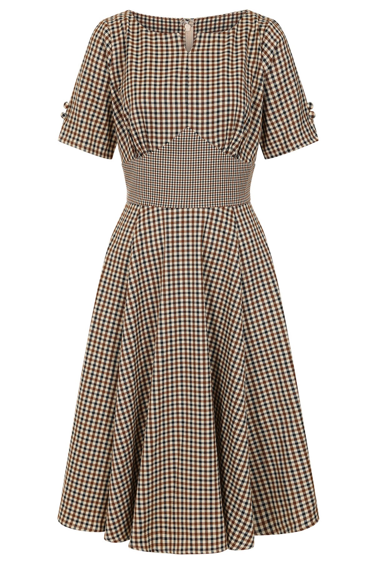 Unleash your inner vintage vixen with the beige Wilma dress—a delightful blend of classic charm and playful flair. Its checkered pattern dances with retro elegance, while the fitted waist and swingy skirt invite you to twirl with a hint of mischief. The V-neck adds just enough allure, and the decorative buttons on the sleeves give it a subtle, stylish wink. Crafted with a textured woven fabric, this dress is as comfortable as it is irresistibly chic—perfect for channeling those fabulous 50s vibes with a modern twist. Whether you’re heading to a vintage market or a weekend brunch, this look is sure to make you purrfectly unforgettable.