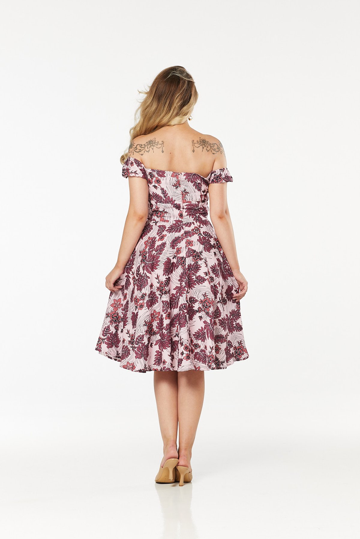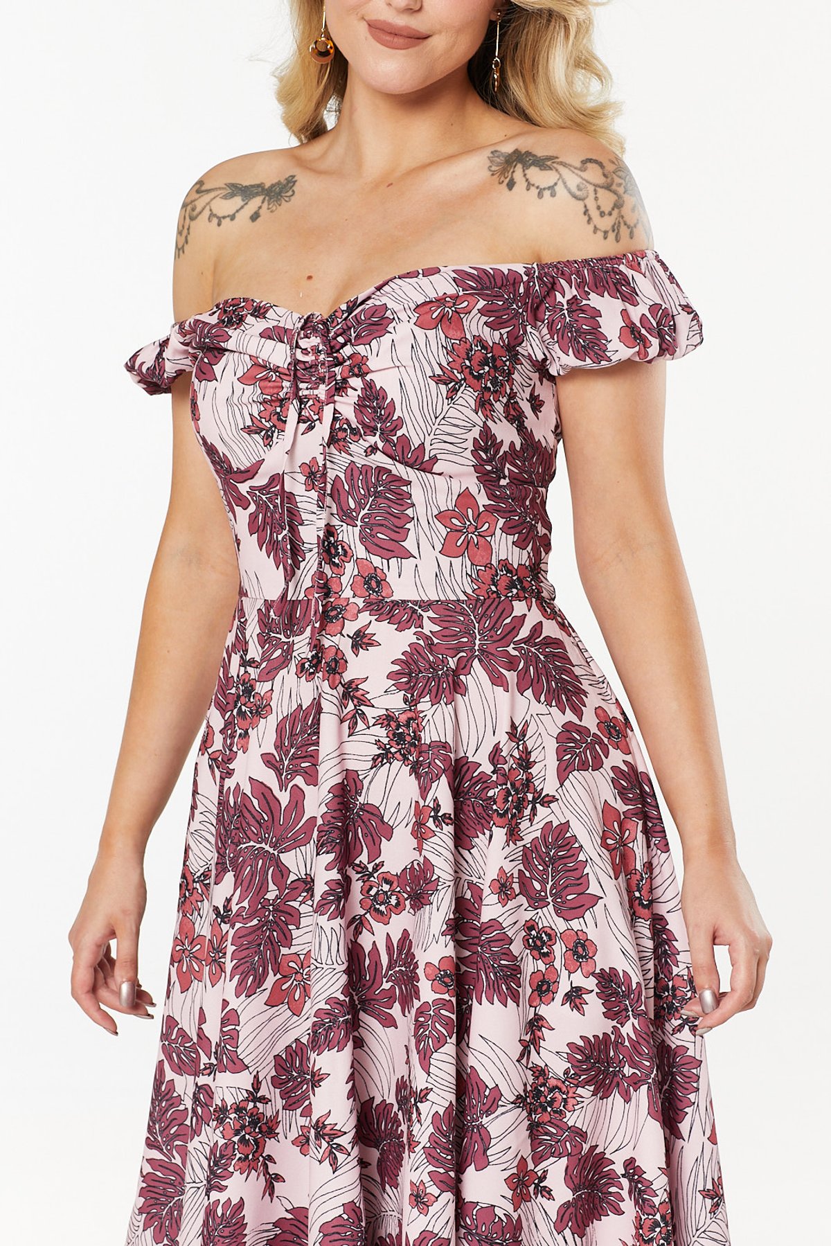 The Klaudi Dress blooms with lush tropical leaves and delicate flowers that dance across light pink and rich burgundy hues. 👗 Its off-shoulder puff sleeves, delicately ruched and adorned with a flirtatious adjustable bow, add a playful twist. Crafted from featherlight crepe fabric, it promises breezy comfort and perfect twirls, whether you’re enjoying a lovely afternoon tea or stealing the limelight at a vintage fair.