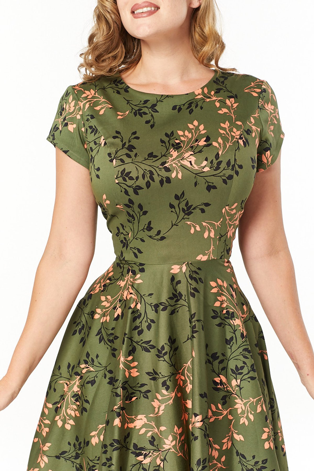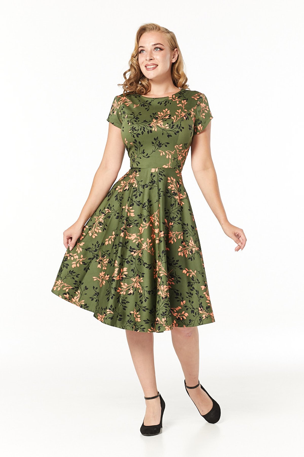 Unleash your inner vintage vixen with the Leila Swing Dress—a true showstopper that’s as playful as it is chic. With its charming floral leaf print in lively green and peach hues, this dress gracefully balances retro allure with modern flair. The fitted bodice and flirty swing skirt create a silhouette that’s both timeless and tantalizing, perfect for turning heads wherever you wander. Crafted to flatter, it’s a purrfect choice for those who want to feel like they’ve stepped right out of a 1950s dream, yet effortlessly stylish for today’s streets.