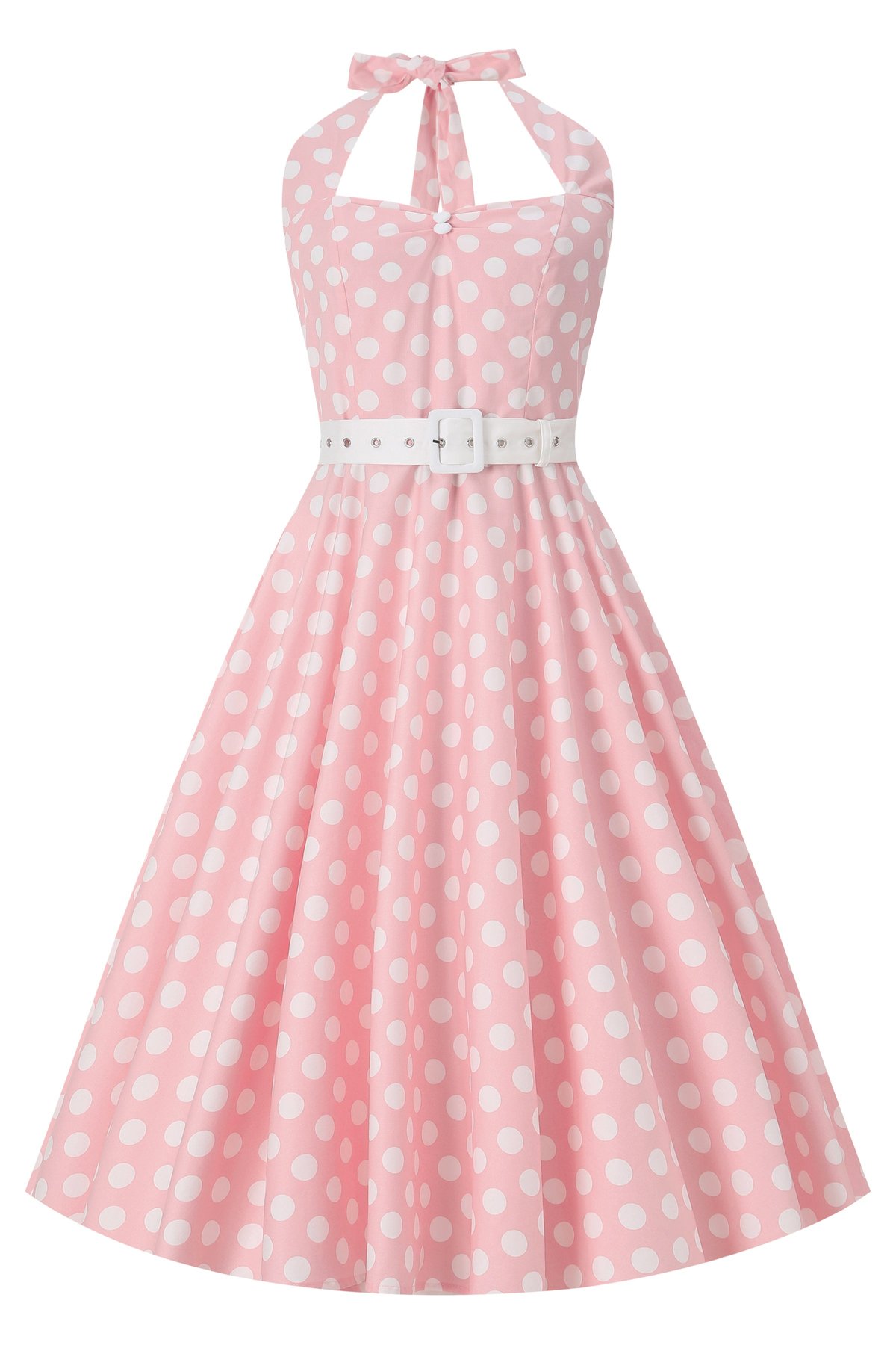 Unleash your inner vintage vixen with this dainty Daisy Light Pink Polka Dot Halter Dress—it's a true showstopper! The charming light pink hue, sprinkled with playful white polka dots, offers a purrfect blend of retro chic and modern comfort. The halter neckline and sweetheart silhouette are irresistibly flirtatious, while the full circle skirt invites twirls that are downright clawsome. Crafted from a soft, stretchy cotton blend, this dress hugs your curves in all the right places, ensuring you feel as fabulous as you look. The matching belt cinches the waist for that classic hourglass shape, and hidden side pockets add a subtle touch of practicality—because a girl should never be without her essentials, darling. With a seamless concealed back zip, slipping into this beauty is a breeze, letting you glide through your day with effortless style. Whether you're feeling playful or poised, this dress is your new go-to for making a memorable impression.
