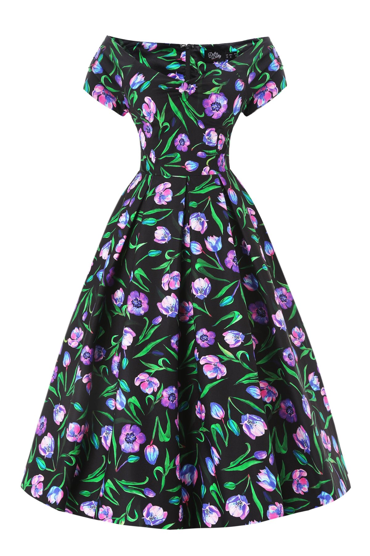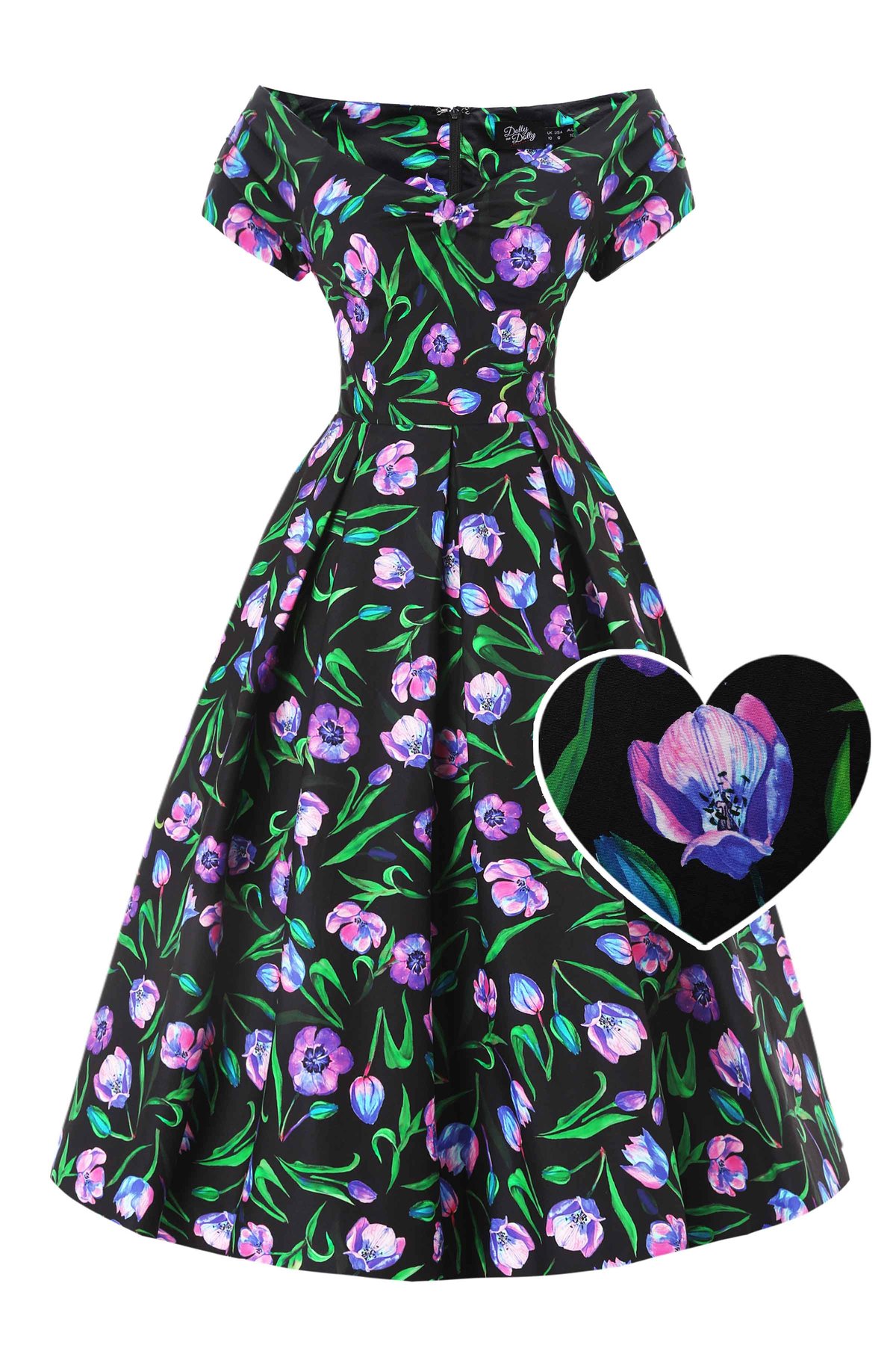 Unleash your inner siren with the Lily Black Tulip Off Shoulder Dress—a true purrfect blend of vintage allure and modern chic. With its dreamy sweetheart neckline and a waist that hugs your curves, this dress channels 50s glamour with a playful twist. The flowing pleated skirt gives off just the right amount of rockabilly charm, making it a versatile piece that commands attention at any event. Crafted from a soft cotton-elastane mix, it offers all-day comfort without sacrificing style, while the floral black and green palette keeps it irresistibly versatile. Plus, those handy pockets? Claws-down gorgeous!