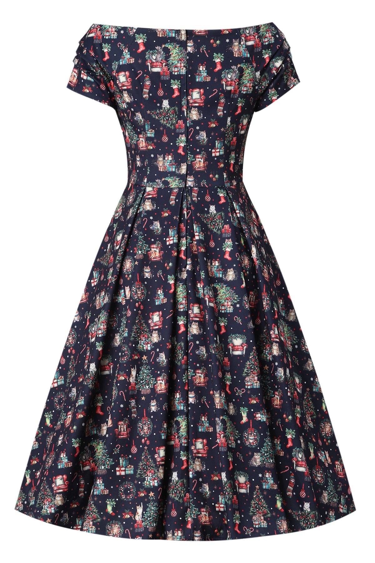 Unleash your inner feline fashionista with our Lily Dark Purple Off Shoulder Cat Print Christmas Dress—where playful charm meets vintage elegance in a purrfect harmony. The rich, dark purple fabric is a cozy canvas for mischievous cats and twinkling Christmas trees, all wrapped up in an irresistible off-shoulder silhouette. The sweetheart neckline and gathered bust add a touch of flirtation, while the fitted waist and flared skirt deliver that timeless 50s-inspired silhouette that’s just claws-down gorgeous. With hidden pockets and a sleek back zip, this dress combines practicality with a dash of vintage glamour, making it a star of your holiday wardrobe.