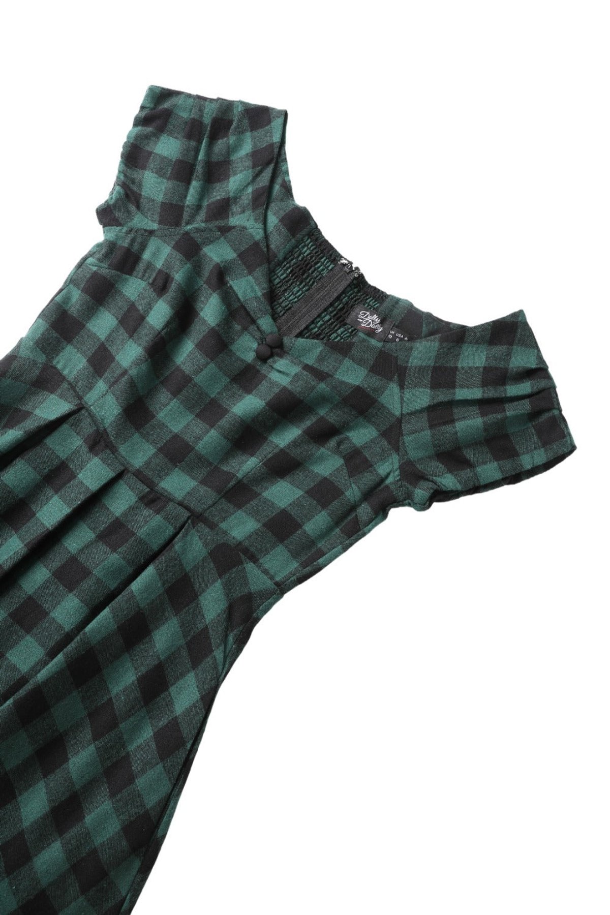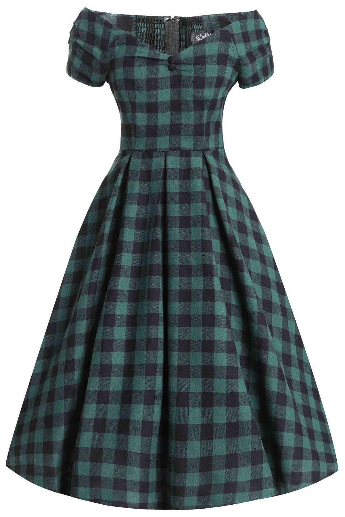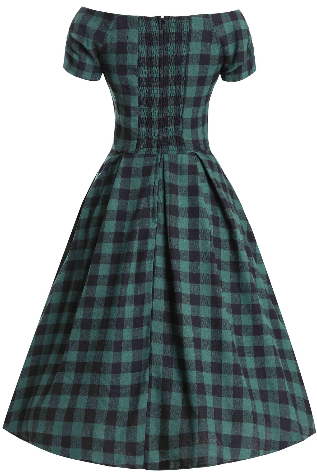 Step back in time and embrace the 50s vibe in our playful Lily Green & Black Check Swing Dress! 🕰💚 This dress is your passport to the iconic rockabilly era, with its fitted bodice, alluring V-neckline and a sprinkle of sassy charm. It features a smocked back panel that gifts you comfort, ready for your swing and sway dance. Short sleeves make it your perfect companion for a breezy picnic afternoon, while the concealed back zip gives it a sleek finish.👗