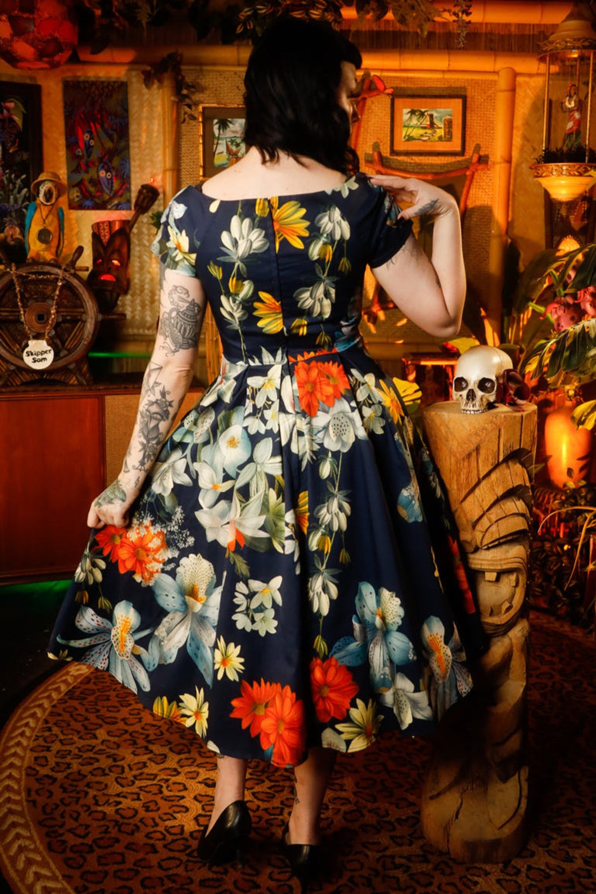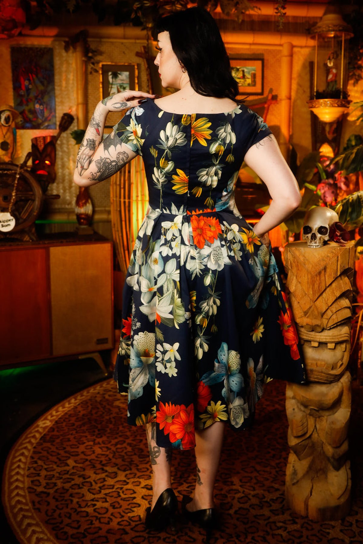 Step into the purrfect blend of vintage charm and tropical allure with this stunning navy blue flared dress. Its enchanting floral print, off-the-shoulder silhouette, and flirty sweetheart neckline make it a true showstopper. The fitted waist and gathered bust add a hint of playful sophistication, while the hidden pockets keep your essentials close without compromising on style. Crafted from a luxurious stretch cotton blend, this dress offers both comfort and a silhouette that’s as flattering as it is fabulous. Whether you’re feeling mischievously elegant or simply embracing your inner vintage vixen, this piece is bound to turn heads. Its timeless design ensures you'll feel as chic as you do confident—ready to own every moment with a paw-sitive attitude. Where to Wear This tropical floral gem is pawsitively perfect for garden parties, seaside strolls, or a romantic dinner date. Its vintage flair lends itself beautifully to occasions where you want to stand out with a touch of retro glamour, all while feeling effortlessly chic. Accessorise With Pair it with a wide-brimmed hat and some kitten heels for an elegant, yet playful look. For a more daring edge, add some bold statement earrings or a vibrant clutch. For our male and unisex lovers, a sleek blazer or a subtle necklace can elevate the ensemble to claws-down gorgeous status. Ready to add a splash of tropical vintage to your wardrobe? Don’t be shy—let your style purr and make this dress yours today!