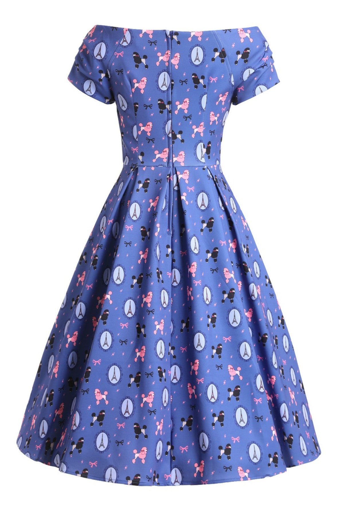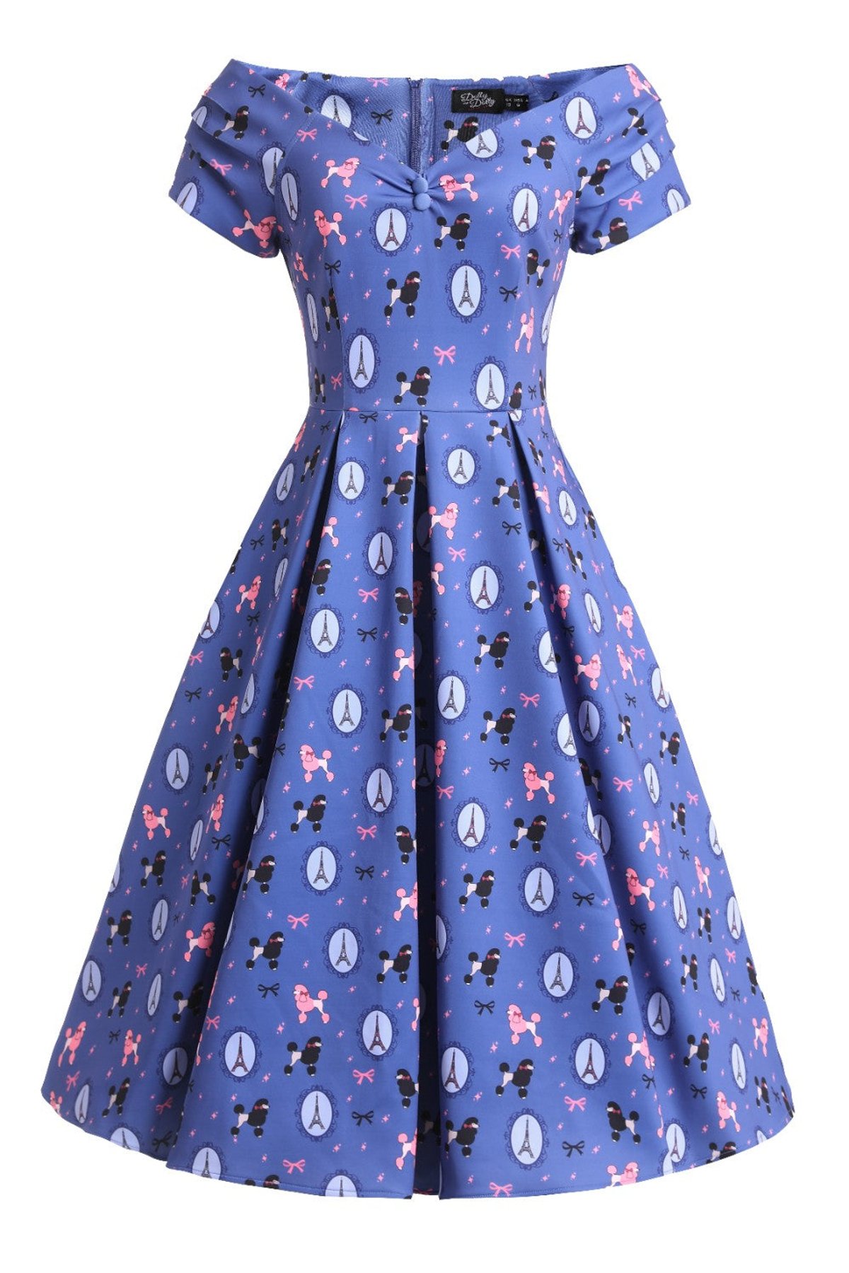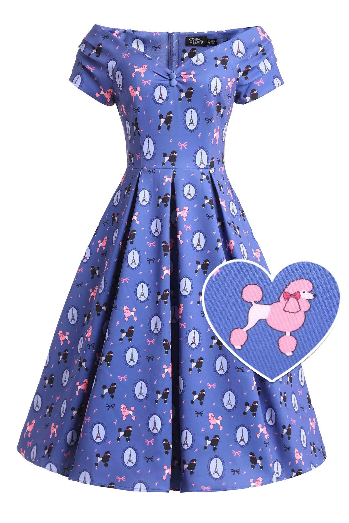 Unleash your inner vintage vixen with the Lily Paris Poodle Off Shoulder Dress — a purrfect blend of retro charm and playful elegance. The delightful print of charming poodles and Eiffel Towers on a flirtatiously blue and pink palette makes this a true showstopper. The off-shoulder silhouette adds a dash of sultry sophistication, while the fitted waist and flirty pleated skirt invite you to twirl the night away with style and grace. Crafted from a comfy yet structured fabric, this dress is designed to look fabulous and feel fantastic, ensuring all eyes are on you wherever you go. Its vintage-inspired details make it a timeless addition to your wardrobe — a piece that whispers "classy" with a mischievous flick of the tail.