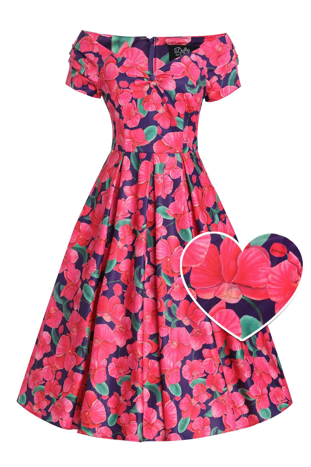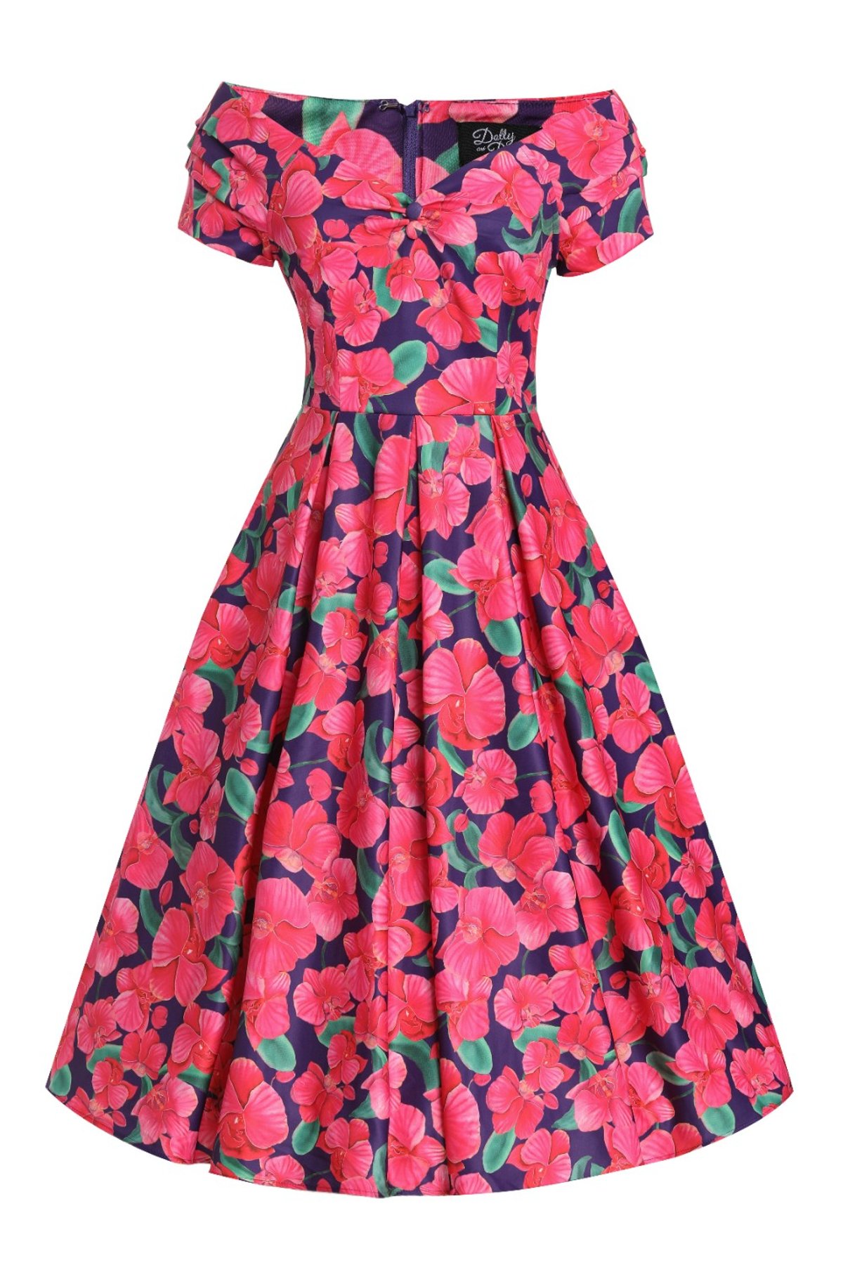 Unleash your inner vintage vixen with the Lily Pink Orchid Off Shoulder Dress—where timeless charm meets playful flair. Its lush floral pattern in vibrant pink and purple hues is simply purrfect for making a statement, while the off-shoulder silhouette adds a dash of coquettish allure. The fitted waist and flirty pleated skirt create a silhouette that’s undeniably claws-down gorgeous, making this dress a true showstopper at any gathering. Crafted from a comfy stretch blend, it moves with your every step, ensuring you stay fabulous from first glance to last dance. Whether you’re feeling bold or breezy, this dress is your ticket to turning heads wherever the mood strikes.